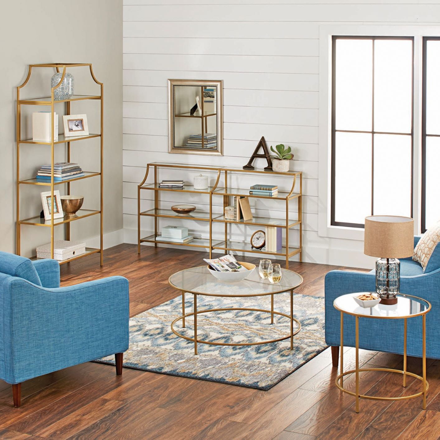 Assembled Dimensions: L: 59.41″ x W: 13.07″ x H: 32.40″ Open shelving for storage and display Safety-tempered glass Metal construction Finished on all sides for versatile placement Satin Gold finish Model # 422294 Box Dimensions: L: 67.38″ x W: 16.38″ x H: 6.75″ For additional questions or any issues, please contact the manufacturer at 1-800-523-3987. Be sure to check out the Better Homes & Gardens Nola collection for more great items!