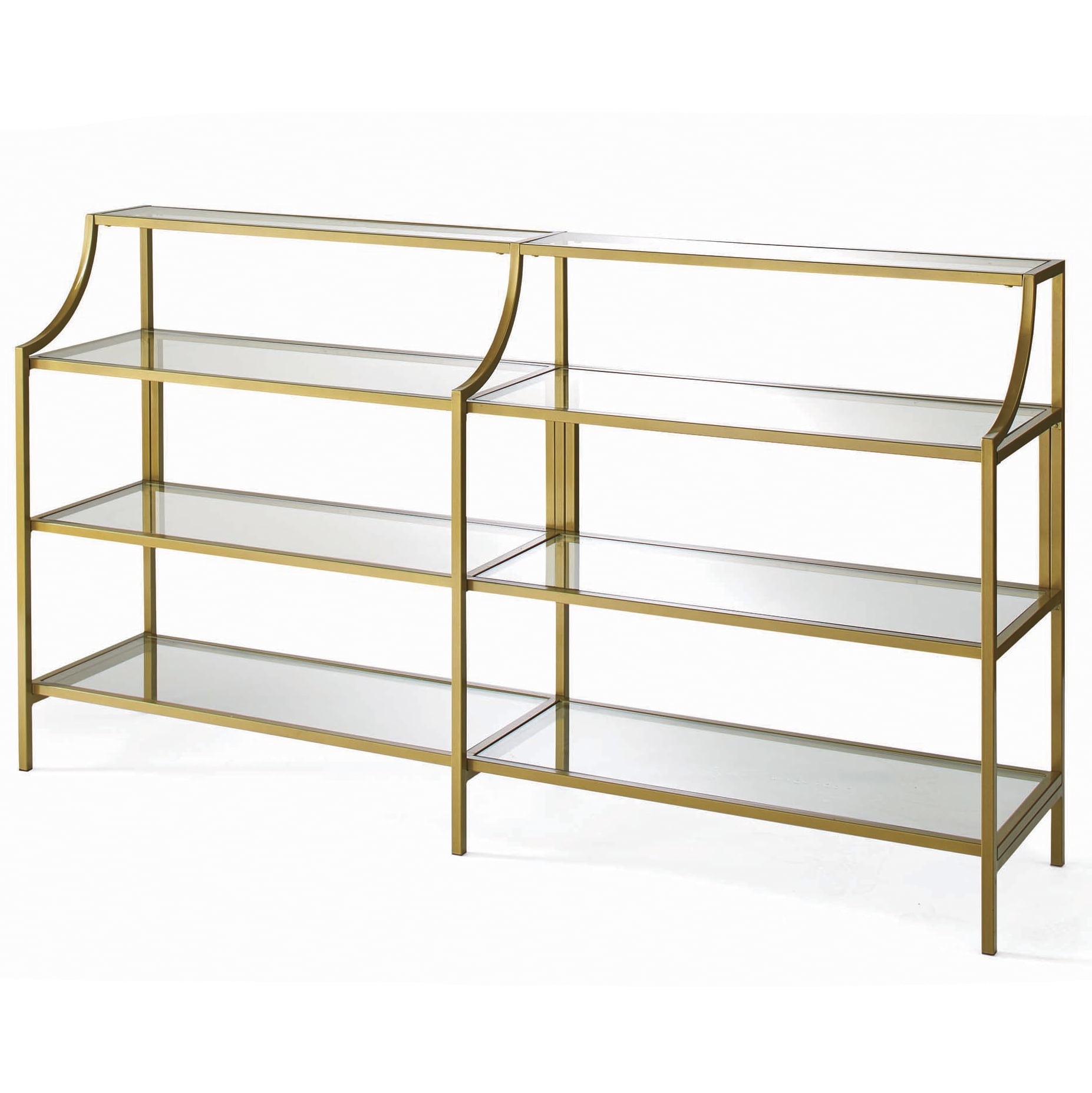 All that glitters is gold. Do your home a favor and add a touch of luxurious style to your living space with this sophisticated Console Table from the Nola collection. This narrow console table features three open shelves, each with a safety-tempered glass surface that adds an extra pop of style to your home decor. These glass shelves make the perfect spot to store books, folders, and other around home essentials. Switch it up and use it as a display area for pictures of your family, vases full of flowers, or any other of your life’s most prized possessions. Its rounded edges and curved indent design give it a stunningly unique appearance that is sure to grab the attention of your friends and family. Constructed from sturdy metal and finished in Satin Gold, this sleek and elegant console table adds classic beauty to any room and will have you living in the lap of luxury.