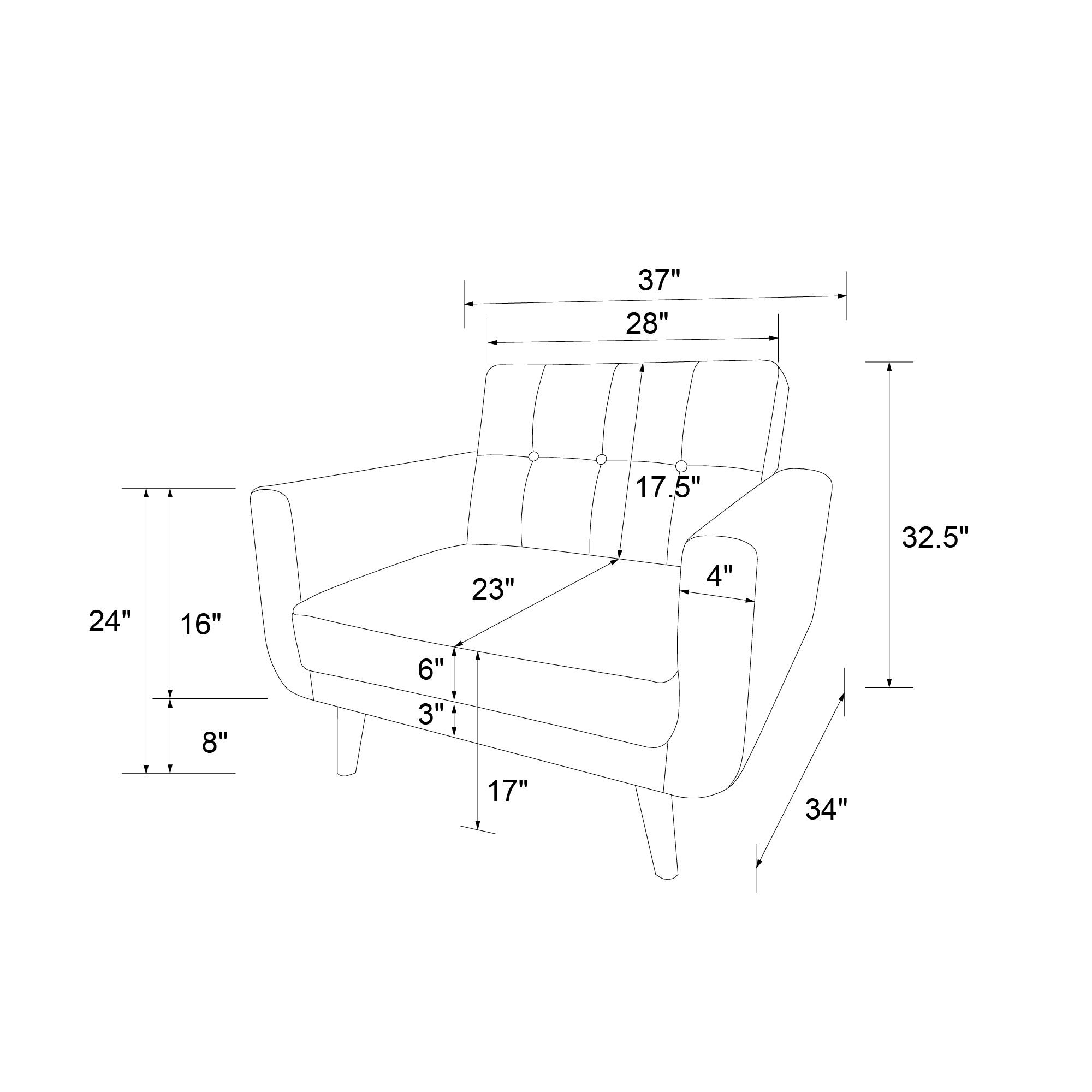 Mid Century modern design with a tufted back, tapered wood legs and faux leather upholstery. Multi-functional piece ideal for small living spaces. Pair with the matching Nola Modern Futon. Sturdy wood construction with wide track arms for extra comfort. Ships in one box. Assembles quickly. Also available in blue or grey velvet. Chair Dimensions: 37″L x 34″W x 32.5″H. Carton Dimensions: 38″L x 31.5″W x 17.5″H. Weight Limit: 250 lbs.