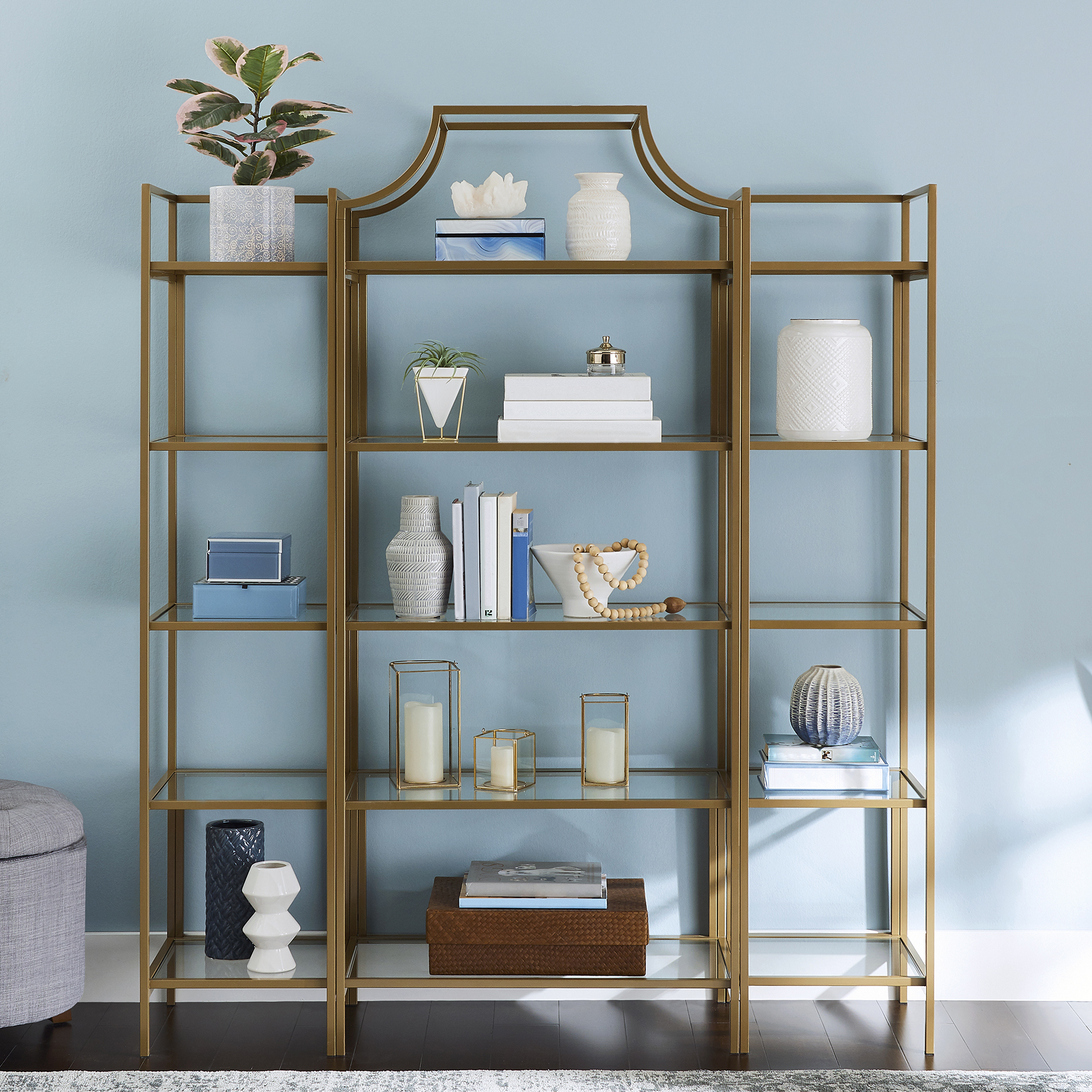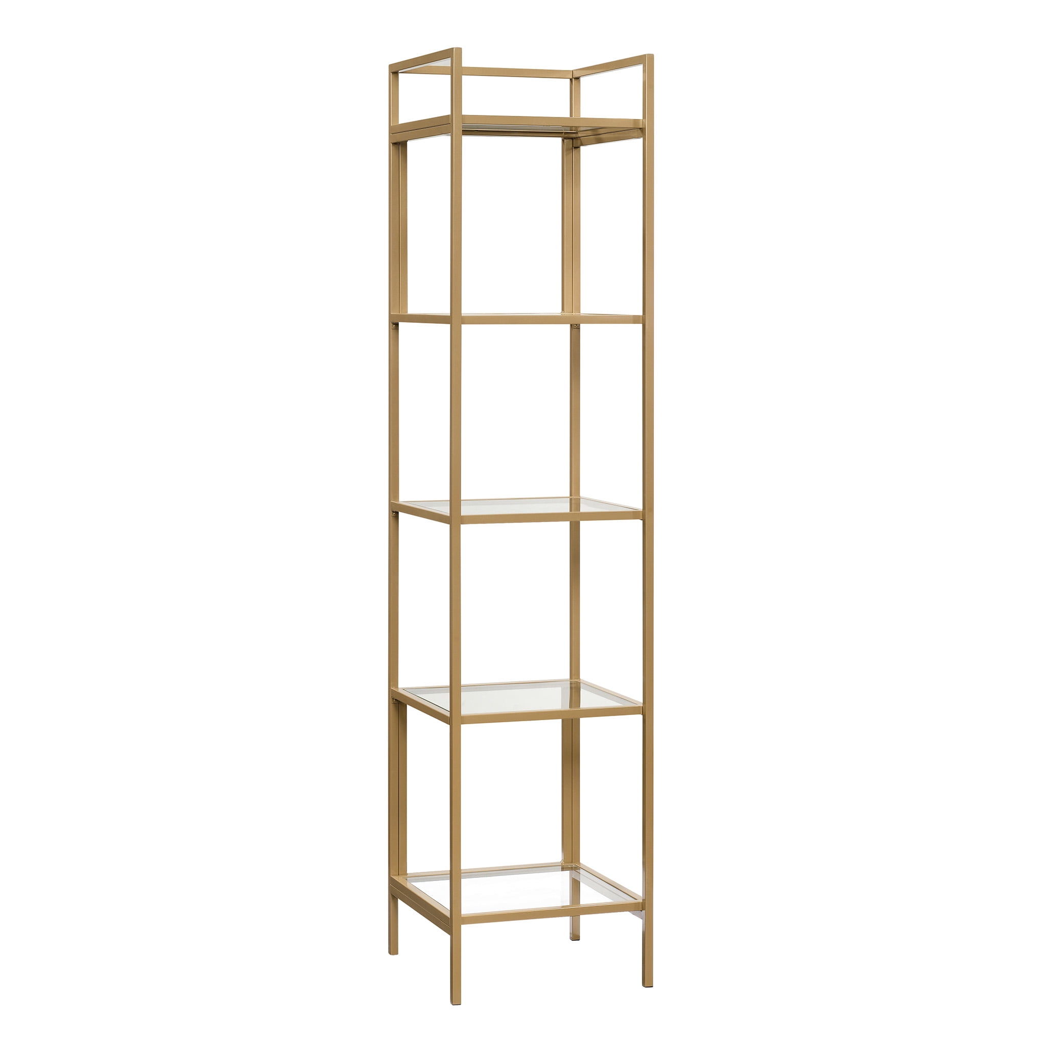 Assembled Dimensions:14.57″ L X 14.49″ W X 63.78″ H Five shelves Safety-tempered glass Finished on all sides Metal construction Gold finish Model #: 424251 Box Dimensions: 67.13″ L x 15.75″ W x 6.1″ H For additional questions or any issues, please contact the manufacturer at 1-800-523-3987. Be sure to check out the Better Homes & Gardens Nola collection for more great items!