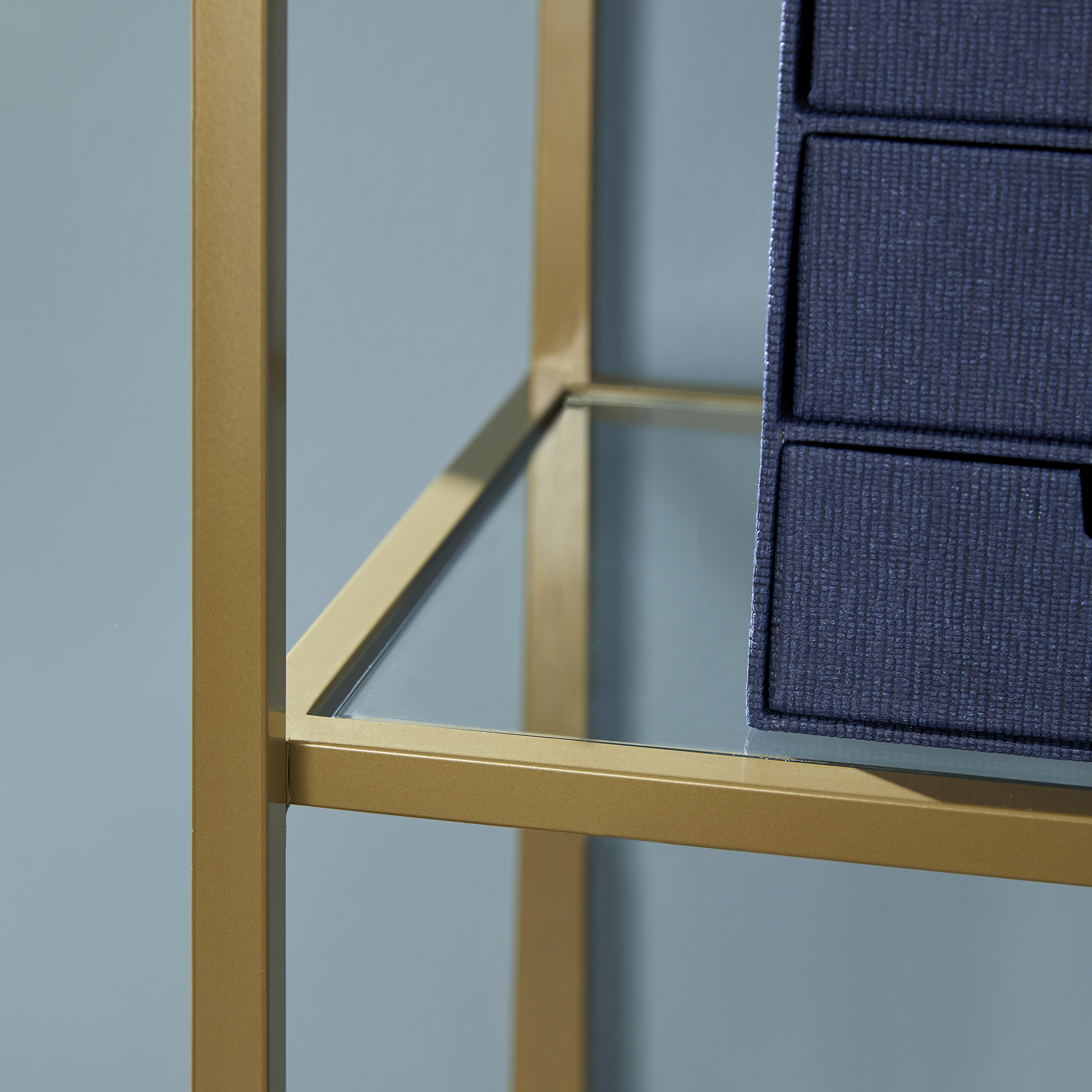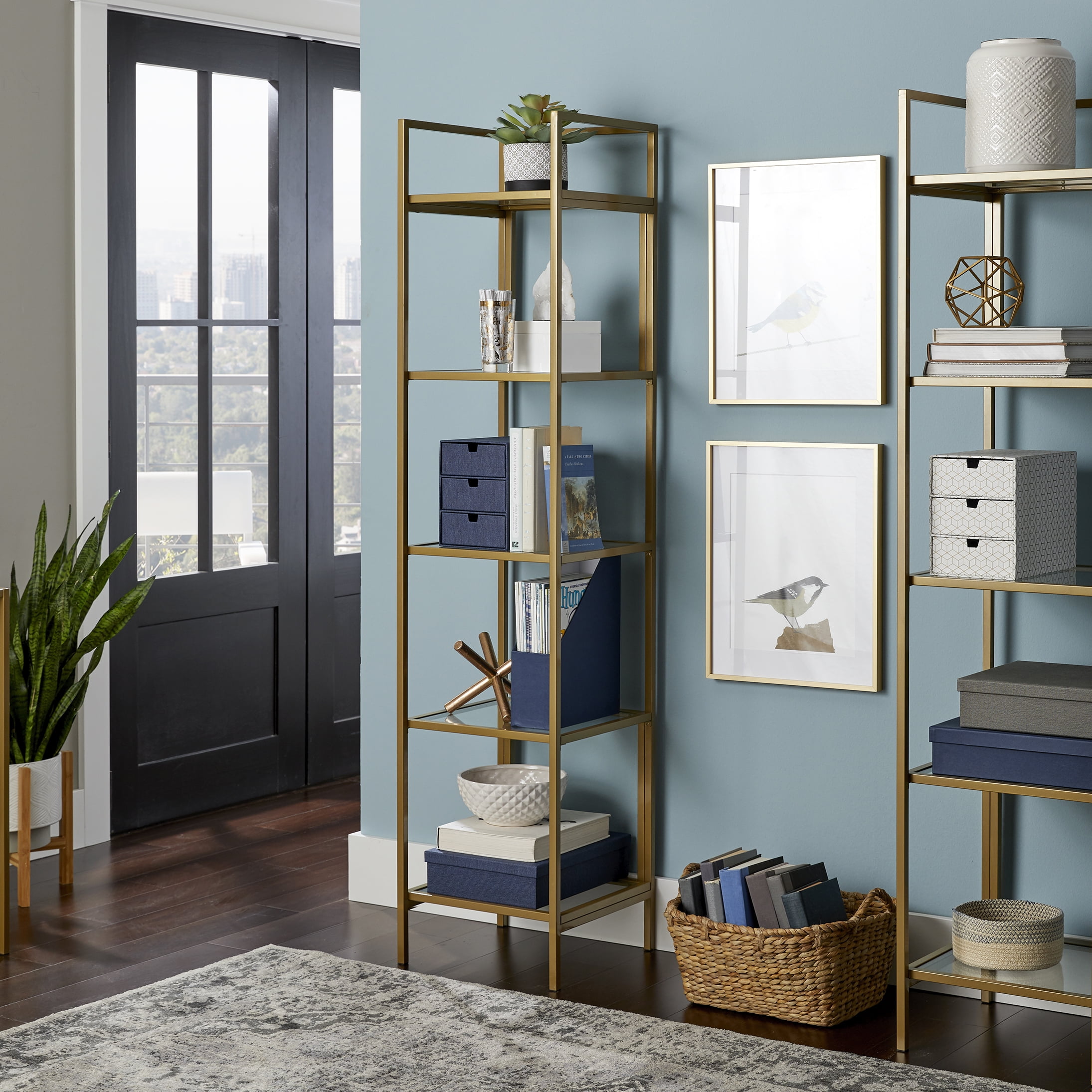 It’s time to elevate the style in your home. Add a touch of sophisticated style while creating versatile storage and display space with this narrow bookcase from the Better Homes & Gardens Nola collection. This tall bookcase features five safety tempered glass shelves. These spacious shelves are ideal for storing a variety of different items like stacks of books, work binders, and organizing bins. They also make the perfect spot to display all your favorite things like your collection of knick-knacks, decorative plants, and photos of your family and friends. There’s a place for all your things! This stunning bookcase is finished on all sides for versatile placement throughout any room in your home? The living room, your office, or even in the bedroom. Its sturdy metal construction ensures that it is built to last. Finished in gold, this charming Better Homes & Gardens Nola narrow bookcase will give your home the style you have been looking for. From bookcases to tv stands, Better Homes & Gardens furniture is designed to help you organize your home. Look for a new dresser for your clothes, display your favorite books with a bookcase or create your home office with a desk and a cube organizer. You’ll also find kitchen and dining tables, chairs, living room, and kid’s furniture.
