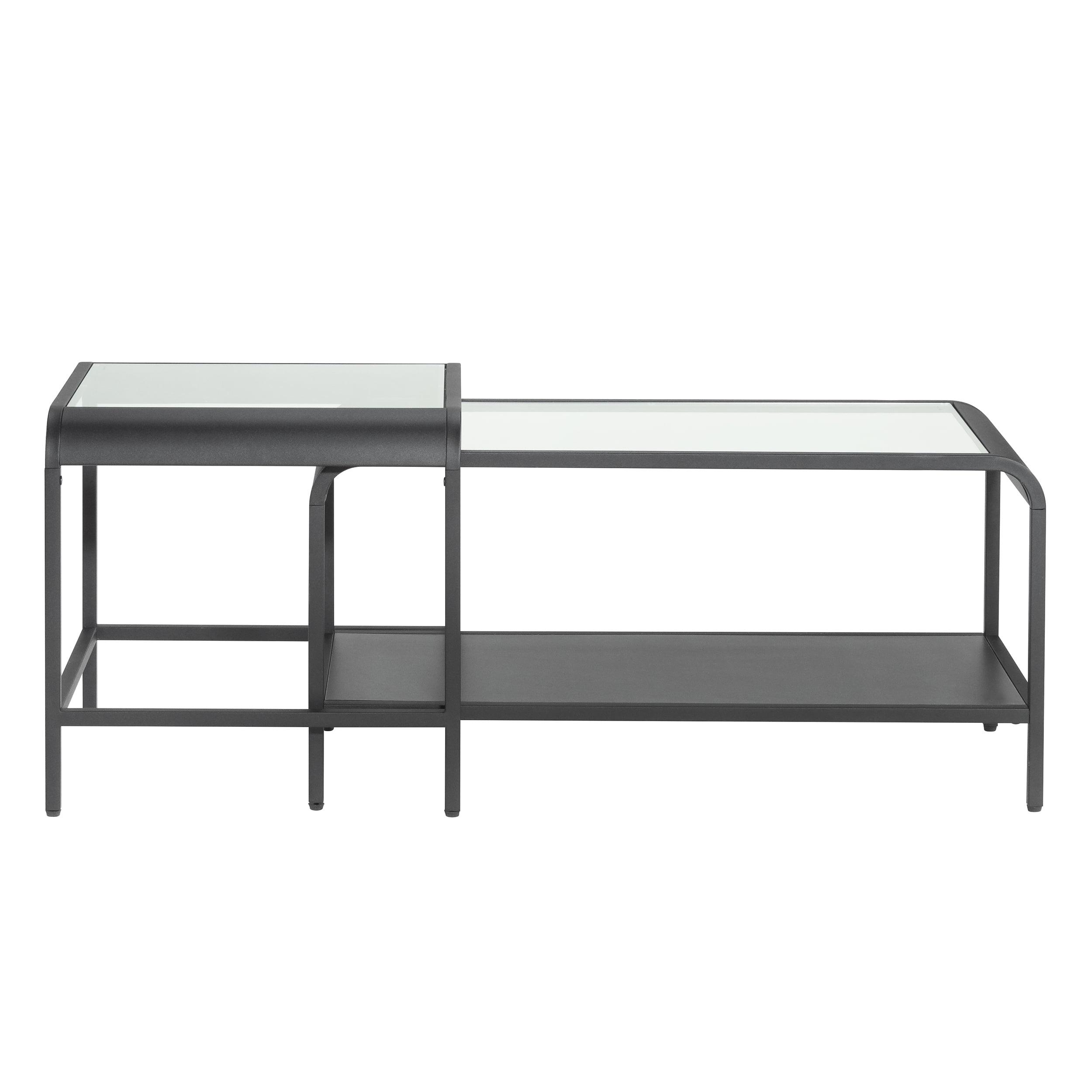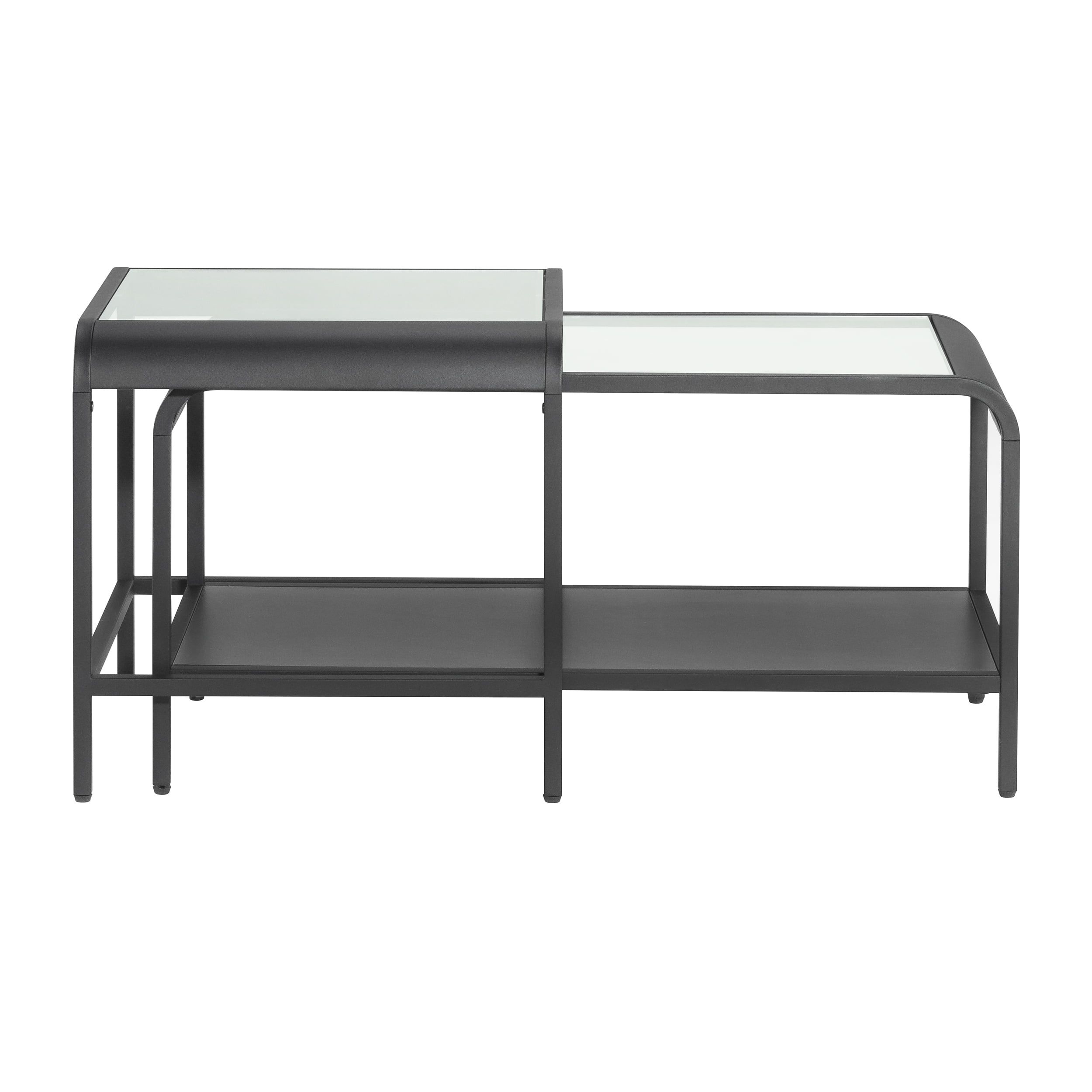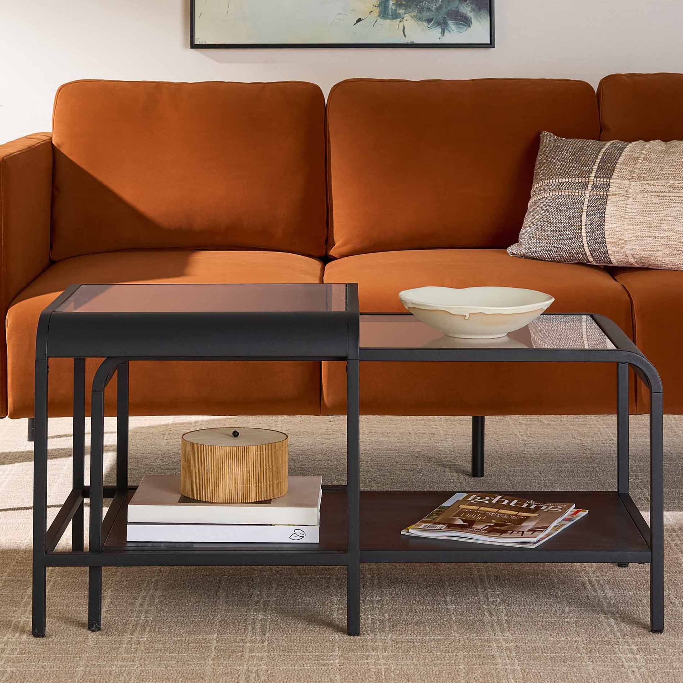 Glass coffee tables offer a versatile element in interior design, from beginning designers to seasoned pros. The modern coffee table from the Better Homes and Gardens® Nola collection is no exception, with an unexpectedly elegant, safety-tempered glass top for an illuminated design. The two-tier design of the top surface of this contemporary coffee table also adds an element of visual interest with multilevel display options. The transparency of the glass top allows light to pass through this metal and glass coffee table which can brighten up small living spaces. The durable and modern metal frame with a chic, black finish makes this edgy glass coffee table an easy living room upgrade. Finished on all sides for versatile placement, it also features adjustable levelers to stabilize the table, even on unlevel surfaces. A lower shelf with classic, solid black finish offers functional storage options, with plenty of room for stacks of magazines, books, or a basket for the TV remote. Redefining the design of any living space can begin with this trendy multilevel coffee table.