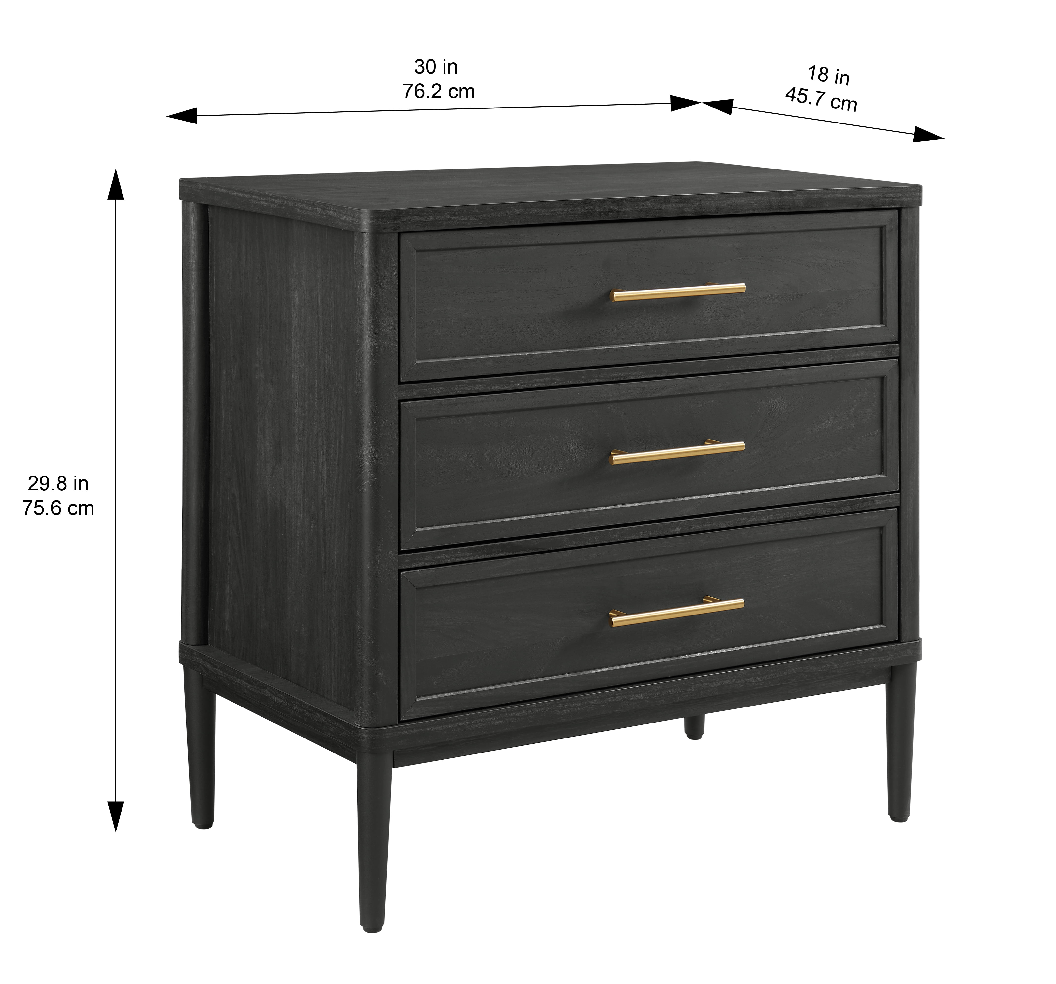 Better Homes & Gardens Oaklee 3 Drawer Nightstand with USB, Charcoal Package dimensions 34.65”D x 21″W x 9.6”H / 84.88 lbs Modern design complements other furniture styles Three spacious drawers for storing bedtime necessities Built-in power strip with two outlets, USB and USB-C charging ports High-quality metal glides assure smooth drawer operation Assembly required with clear instructions included Model: BHS336249972028/BHS536249972005