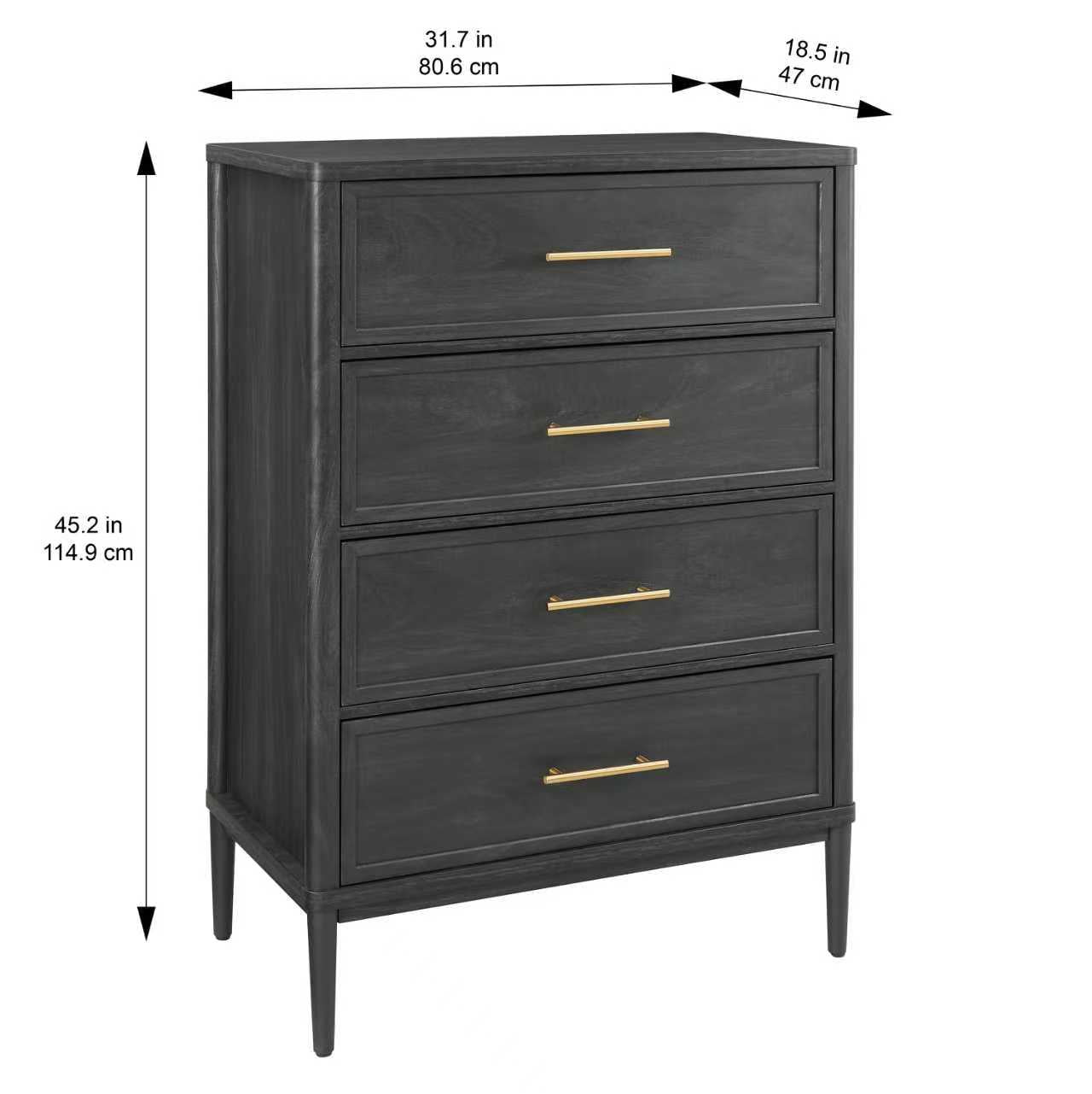 Better Homes & Gardens Oaklee 4 Drawer Dresser, Charcoal Finish(Adult) Assembled Dimensions: 31.75” W x 18.5” D x 45” H Product Weight: 111.3 lb Color: Charcoal Material: Engineered wood, metal legs and hardware Package Dimensions: 40.55*21.65*10.83″H Package Weight: 139.99lb Contemporary style Better Homes & Gardens ‘Oaklee’ Collection 4 smooth-gliding, deep drawers Gold hardware Assembly required Cleaning and Care: Clean with dry cloth Model #BHS336249972026