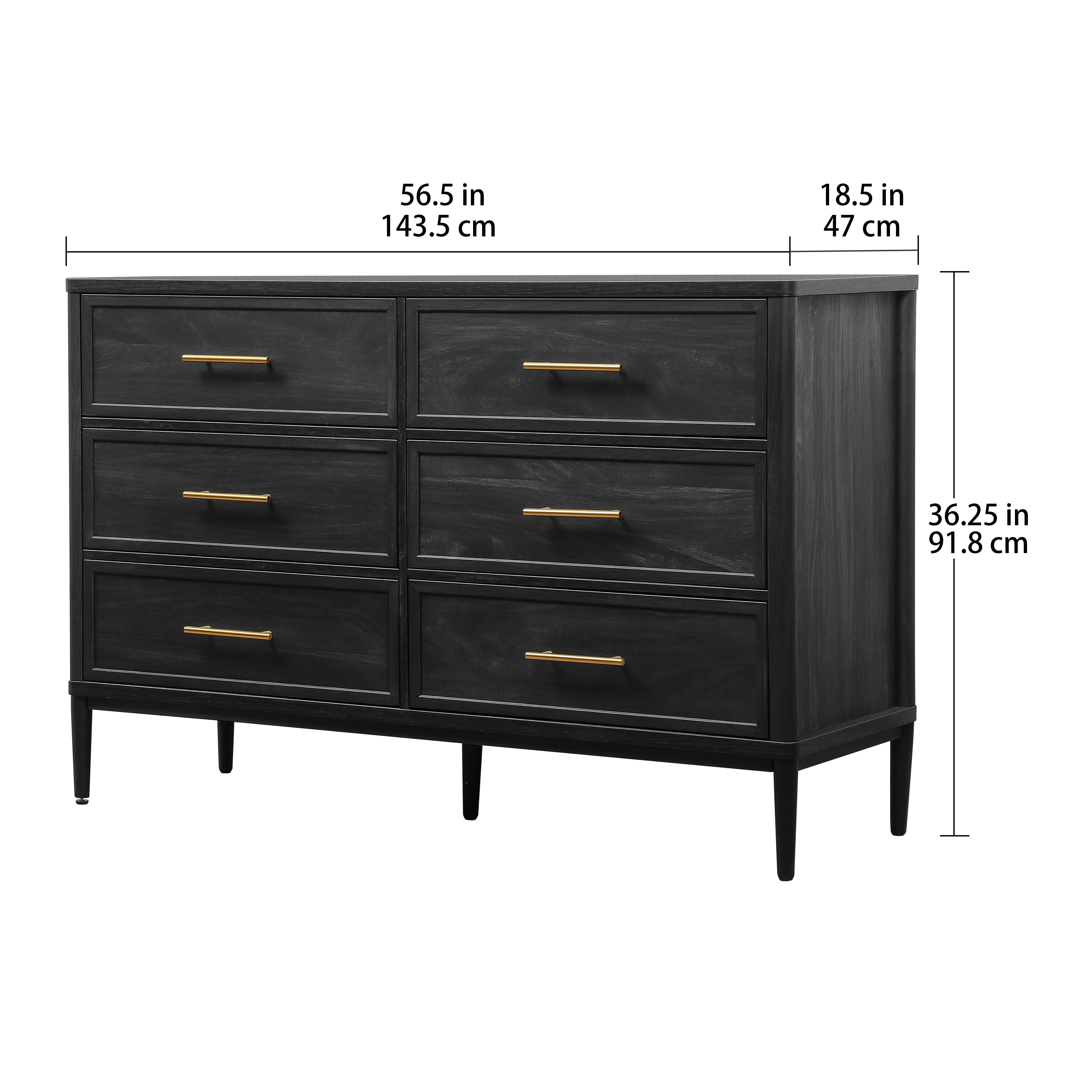 Better Homes & Gardens Oaklee 6-Drawer Dresser, Charcoal Finish Assembled Dimensions: 56.5” L x 18.5” D x 36.1” H Product Weight: 151.9 lb Color: Charcoal Material: Engineered wood, metal legs and hardware Package Dimensions Box 1: 60*21.34*7.95″H, 121 lb Package Dimensions Box 2:30.7*20*9.25″H, 73.66lb Contemporary style Better Homes & Gardens ‘Oaklee’ Collection 6 smooth-gliding, deep drawers Gold hardware Assembly required Cleaning and Care: Clean with dry cloth Model #BHS336249972013, BHS336249972014