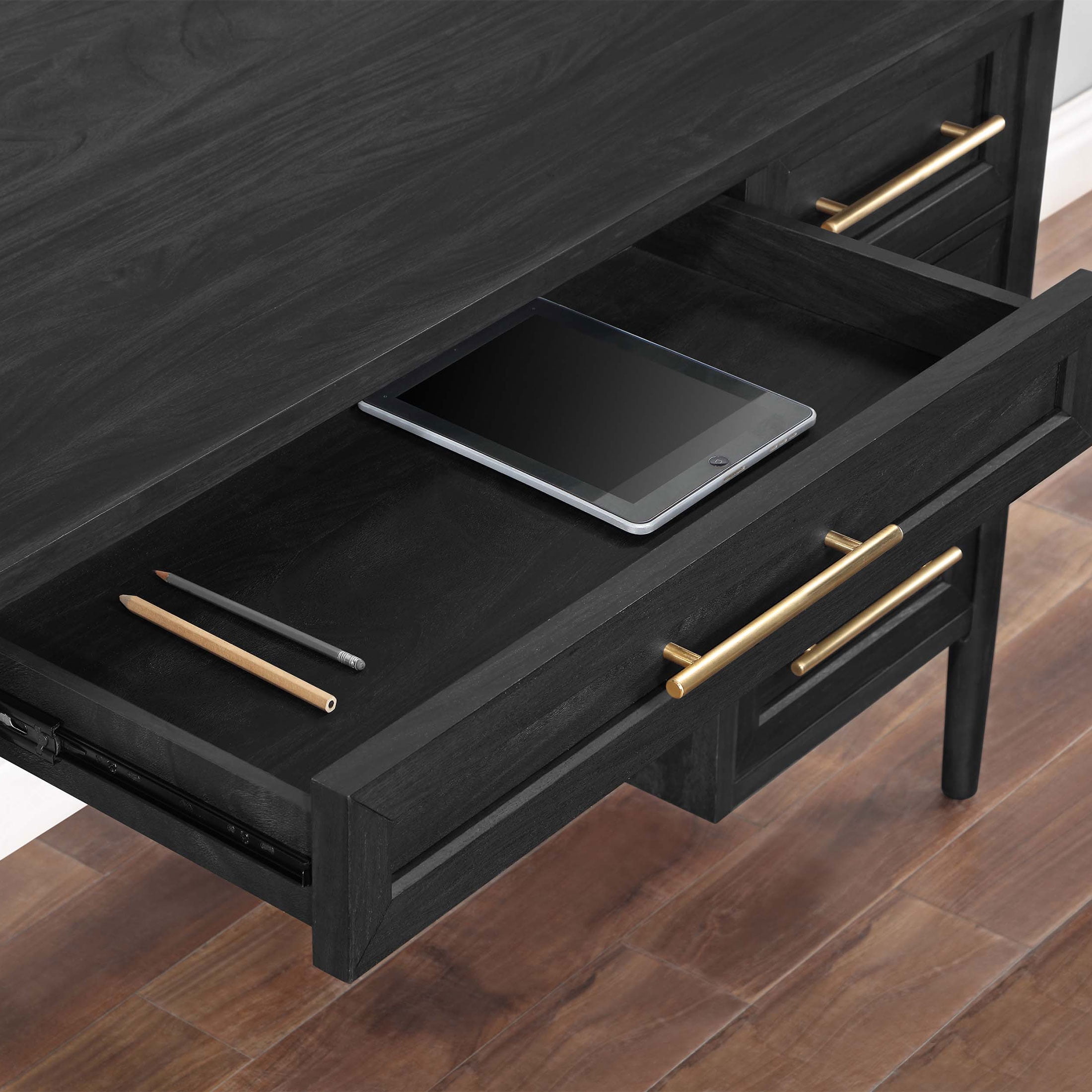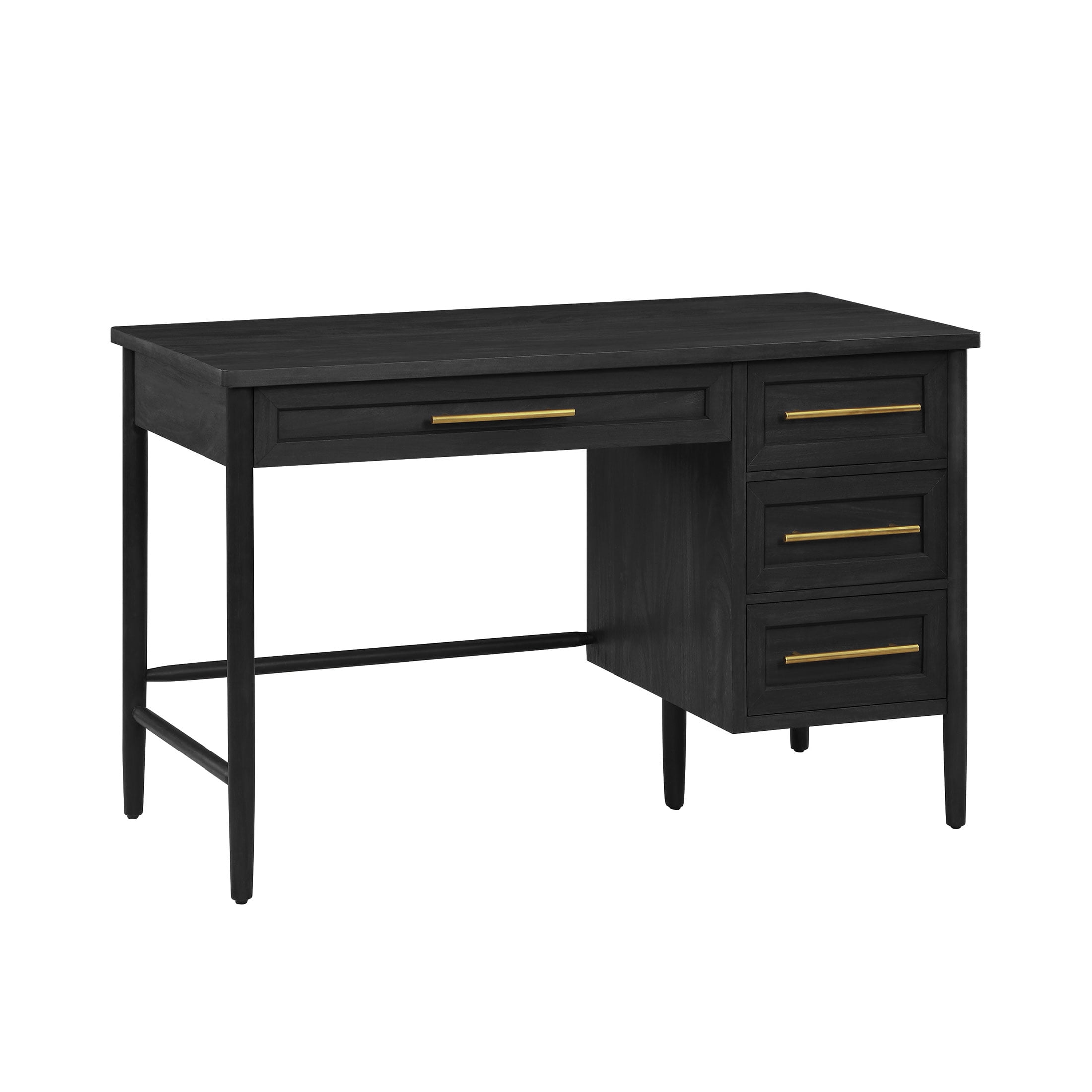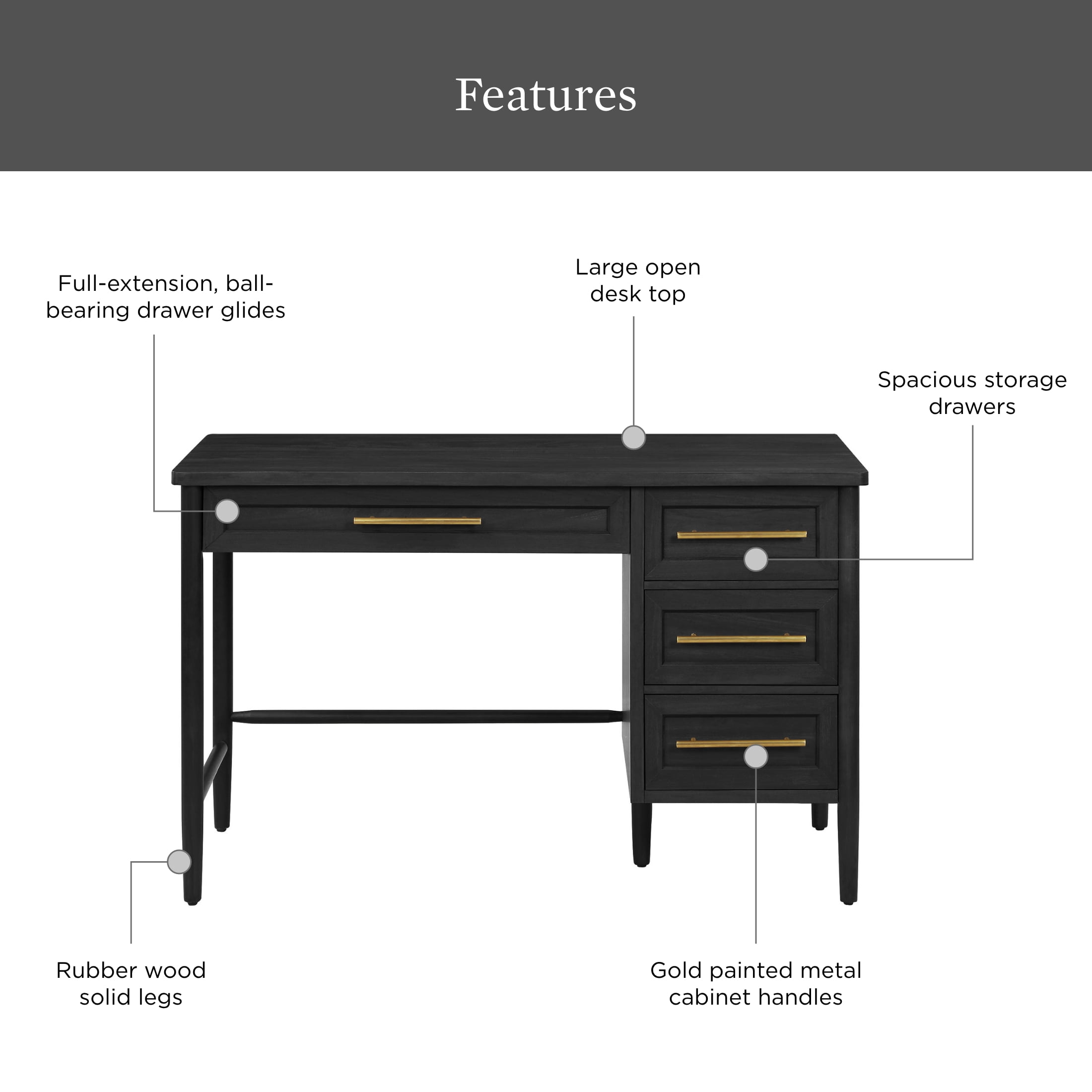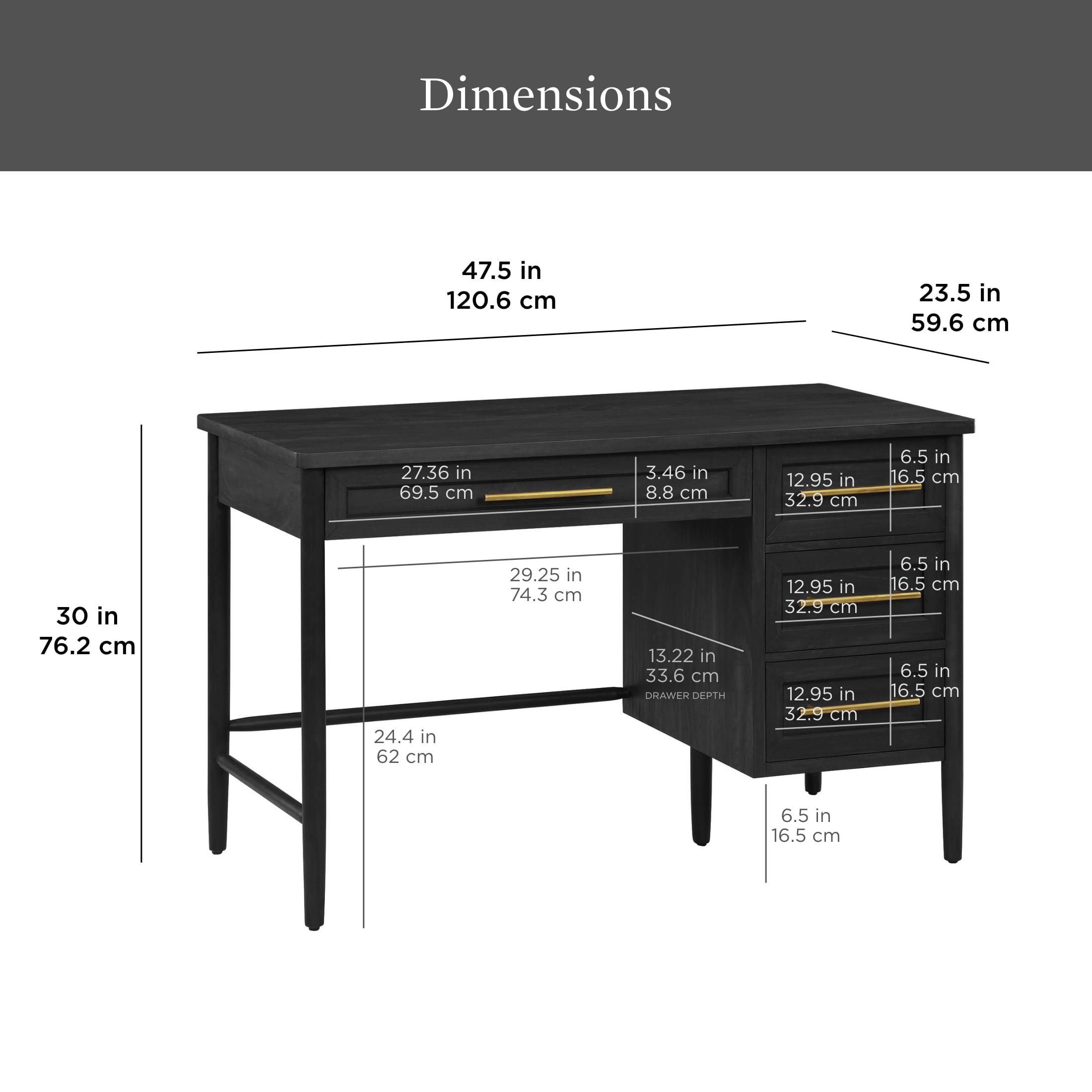 Transform your workspace into a haven of productivity and style with the Better Homes & Gardens Oaklee Writing Desk. Designed for remote workers, families, and students, this contemporary writing desk combines elegance with functionality. The solid rubber wood legs provide a sturdy foundation, while the composite wood desktop in a sophisticated charcoal finish adds a touch of modern charm. Four spacious drawers offer ample storage for all your essentials, from documents to stationery. With full-extension, ball-bearing glides, each drawer opens smoothly, allowing easy access to your belongings. The gold-painted metal handles add a luxurious touch, elevating the desk’s sleek design. Pair it seamlessly with other pieces from the Oaklee Collection to create a cohesive and inviting workspace (sold separately). Whether you’re tackling a big project or organizing your home office, the Oaklee Writing Desk is your perfect partner, blending durability with contemporary flair to inspire your best work.
