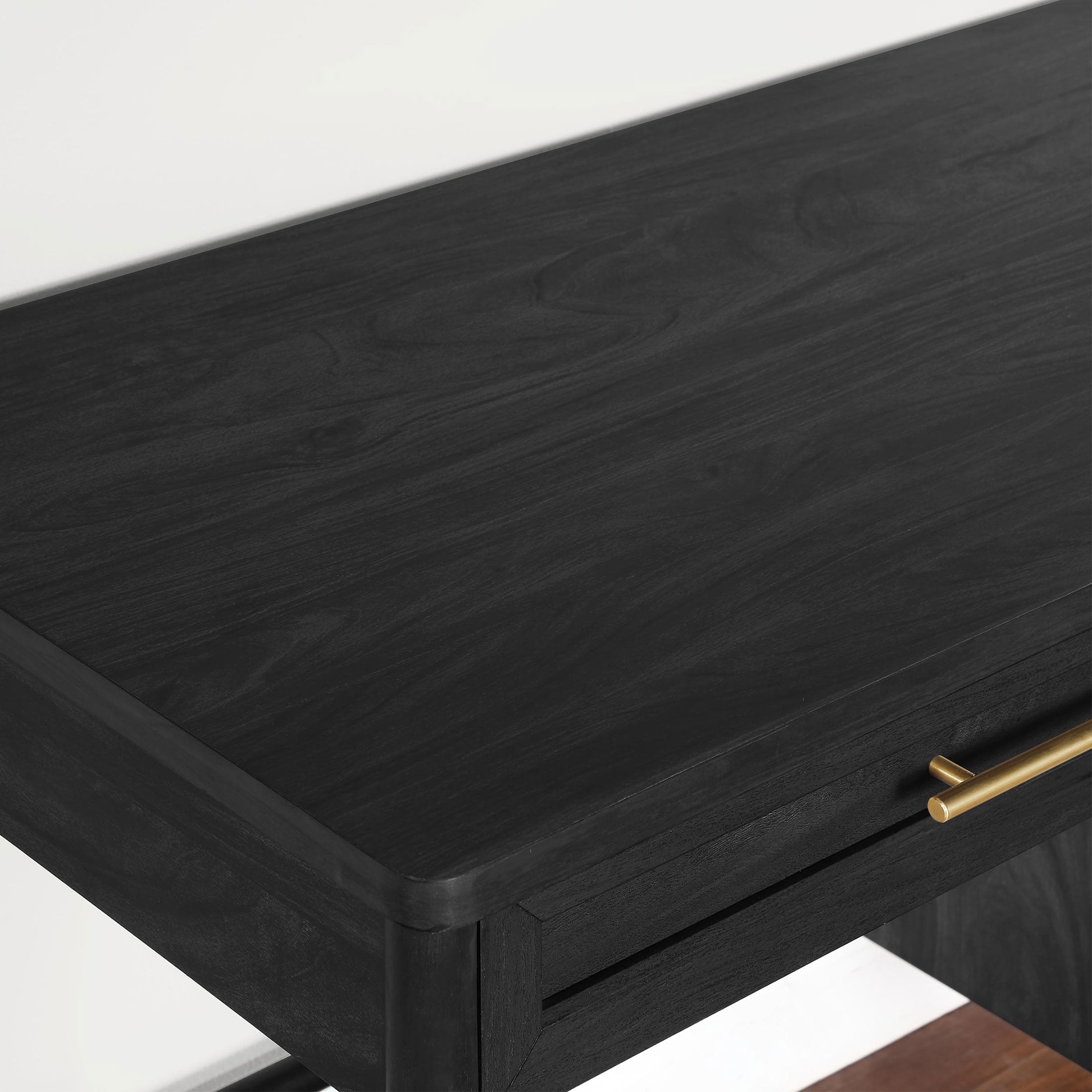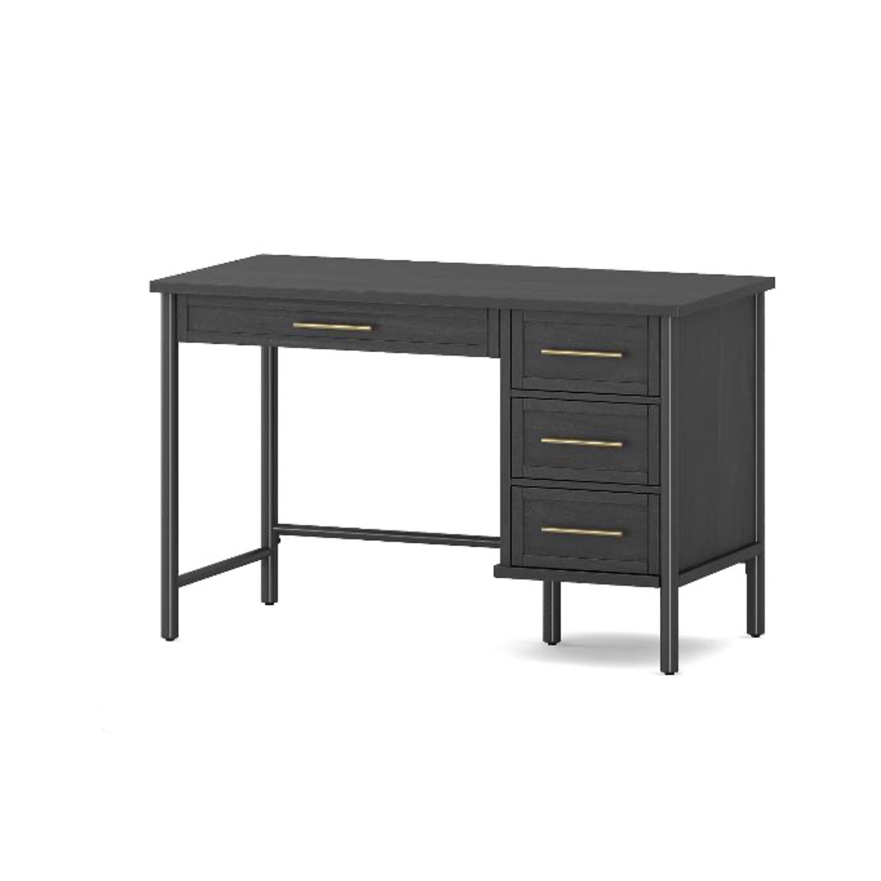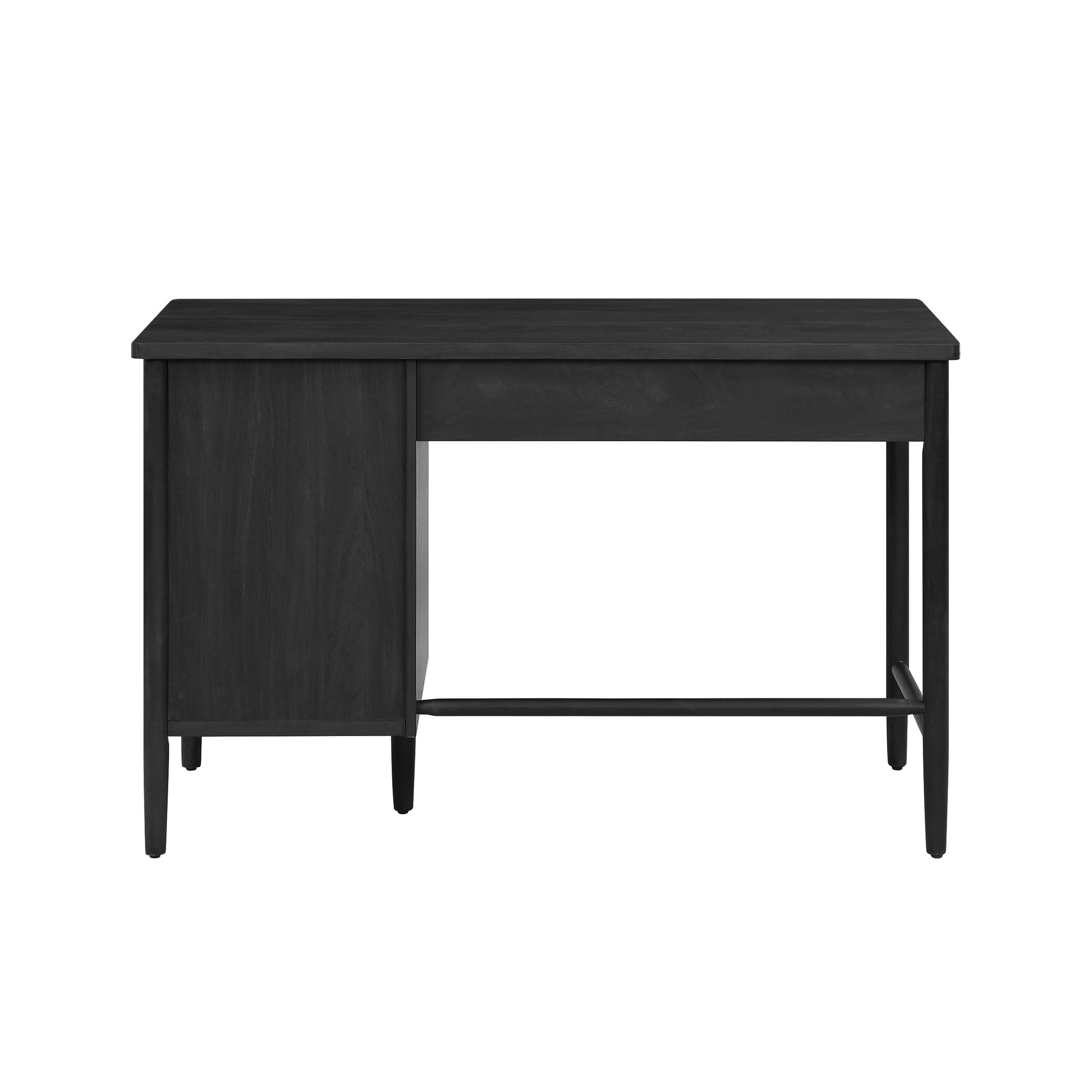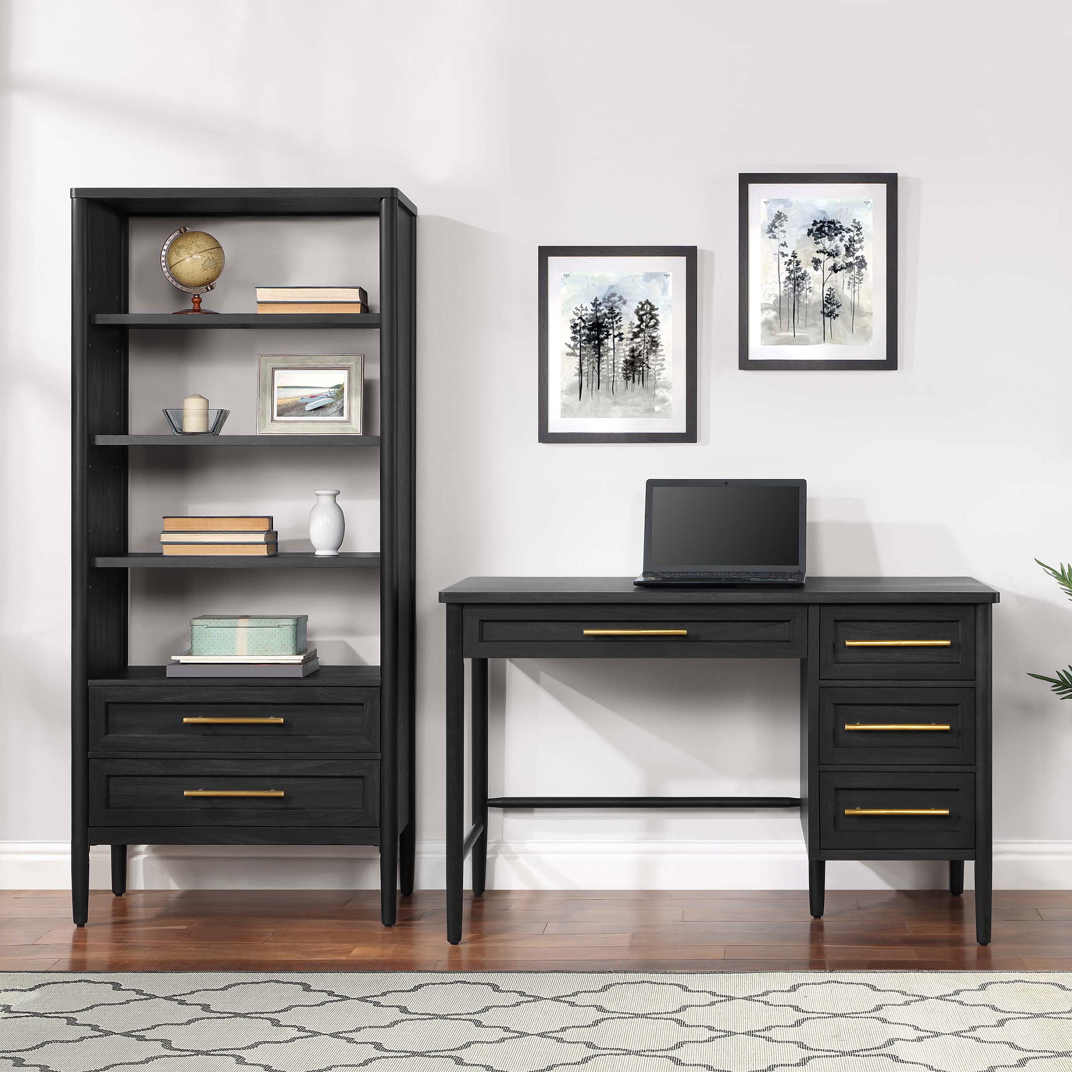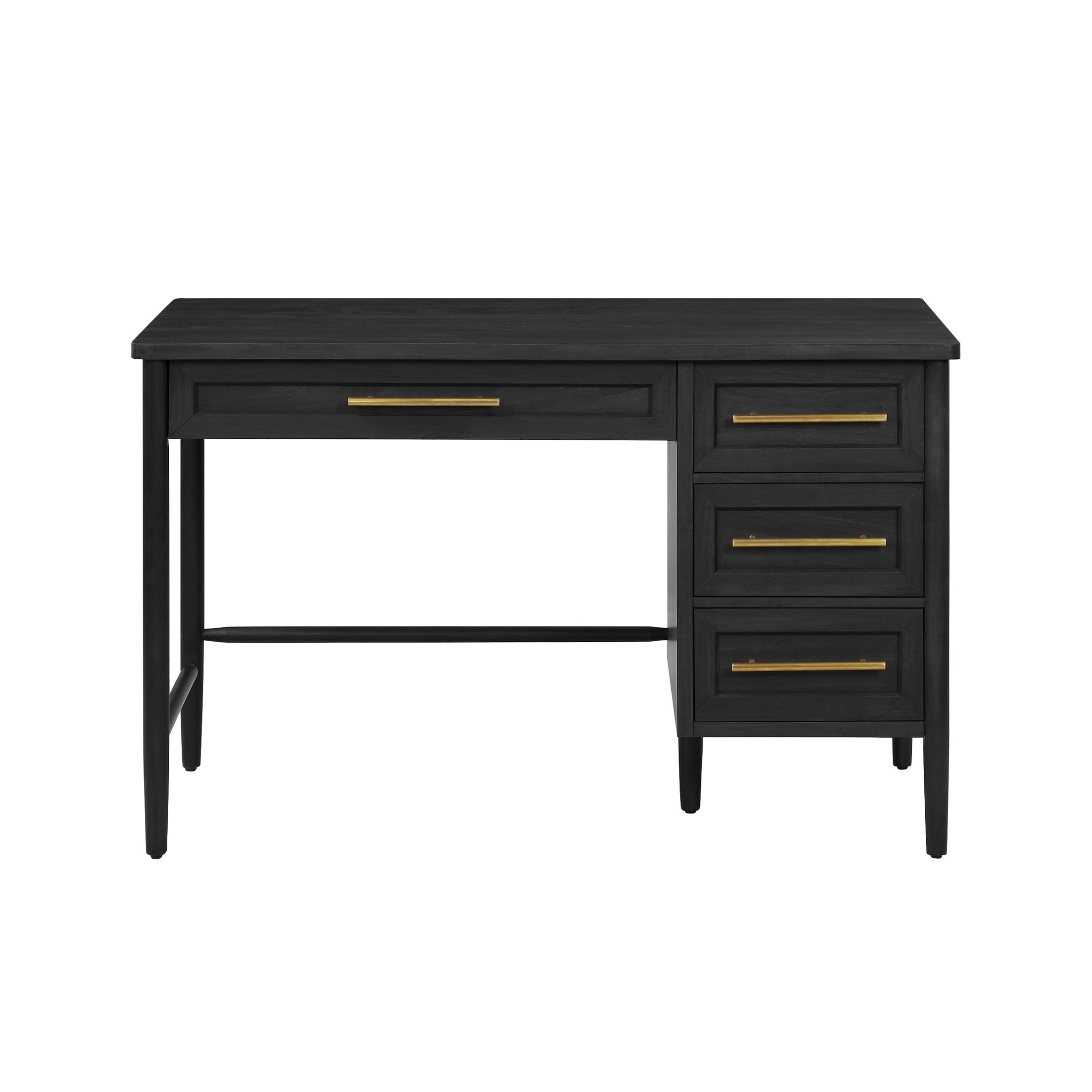 Transform your workspace into a haven of productivity and style with the Better Homes & Gardens Oaklee Writing Desk. Designed for remote workers, families, and students, this contemporary writing desk combines elegance with functionality. The solid rubber wood legs provide a sturdy foundation, while the composite wood desktop in a sophisticated charcoal finish adds a touch of modern charm. Four spacious drawers offer ample storage for all your essentials, from documents to stationery. With full-extension, ball-bearing glides, each drawer opens smoothly, allowing easy access to your belongings. The gold-painted metal handles add a luxurious touch, elevating the desk’s sleek design. Pair it seamlessly with other pieces from the Oaklee Collection to create a cohesive and inviting workspace (sold separately). Whether you’re tackling a big project or organizing your home office, the Oaklee Writing Desk is your perfect partner, blending durability with contemporary flair to inspire your best work.