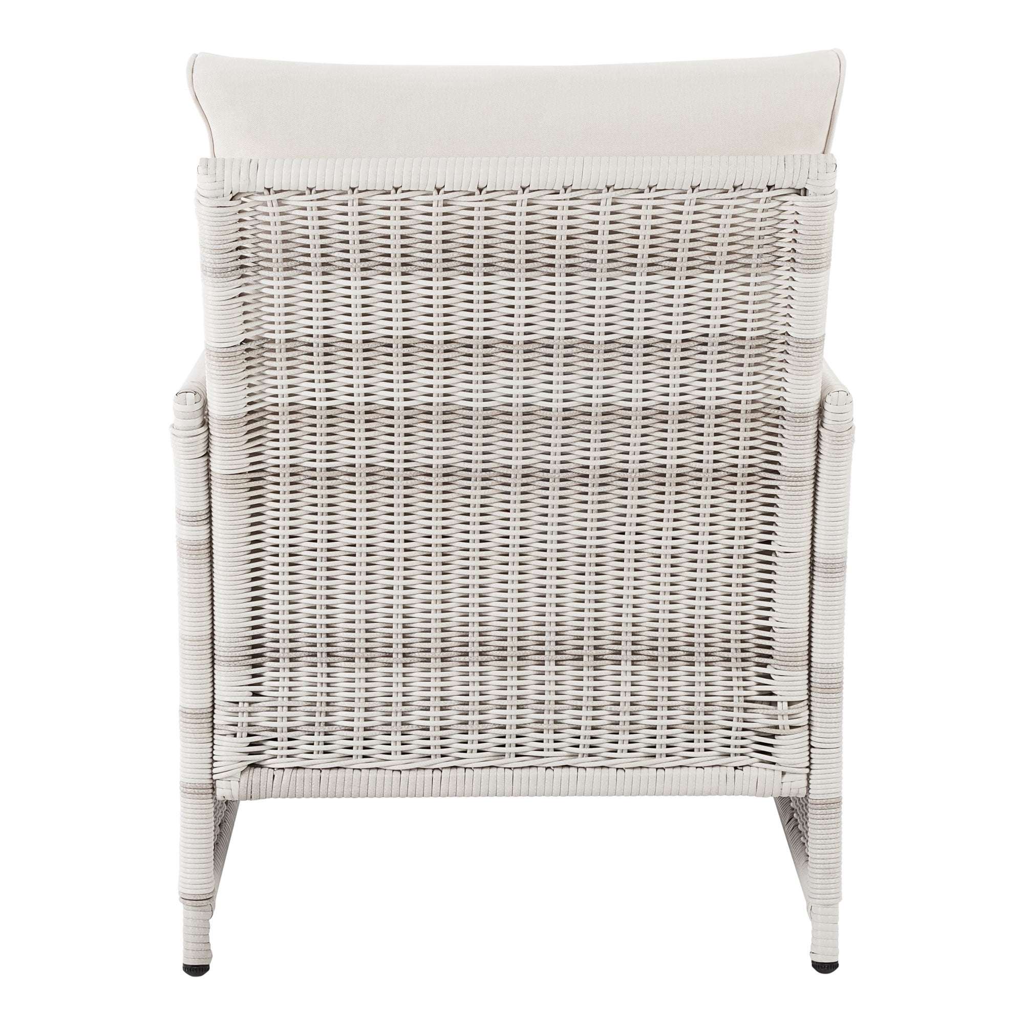 Set includes 2 outdoor wicker stationary lounge chairs Features high-back design with a weather-resistant white wicker with soft gray accents The hand-woven outdoor wicker wraps the e-coated durable steel frame for all-season durability Easy to clean 3M Scotchgard™ treated solution-dyed polyester fabric Each chair can support up to 250 lbs. Care: Clean with a soft cloth and mild soap water Assembled product dimensions: 29.92D × 26.77W × 33.27H; Product weight: 32.89 lbs. Set of 2 outdoor lounge chairs will ship in one box Shipping dimensions: 28.74L x 25.98W x 25.98H; Shipping Weight: 77.09 lbs. 3-year warranty on frame and fabric; 1-year warranty on PE wicker Call our customer service 1-844-428-6923 8:00am-8:00pm(EST), Monday-Friday, or email [email protected]
