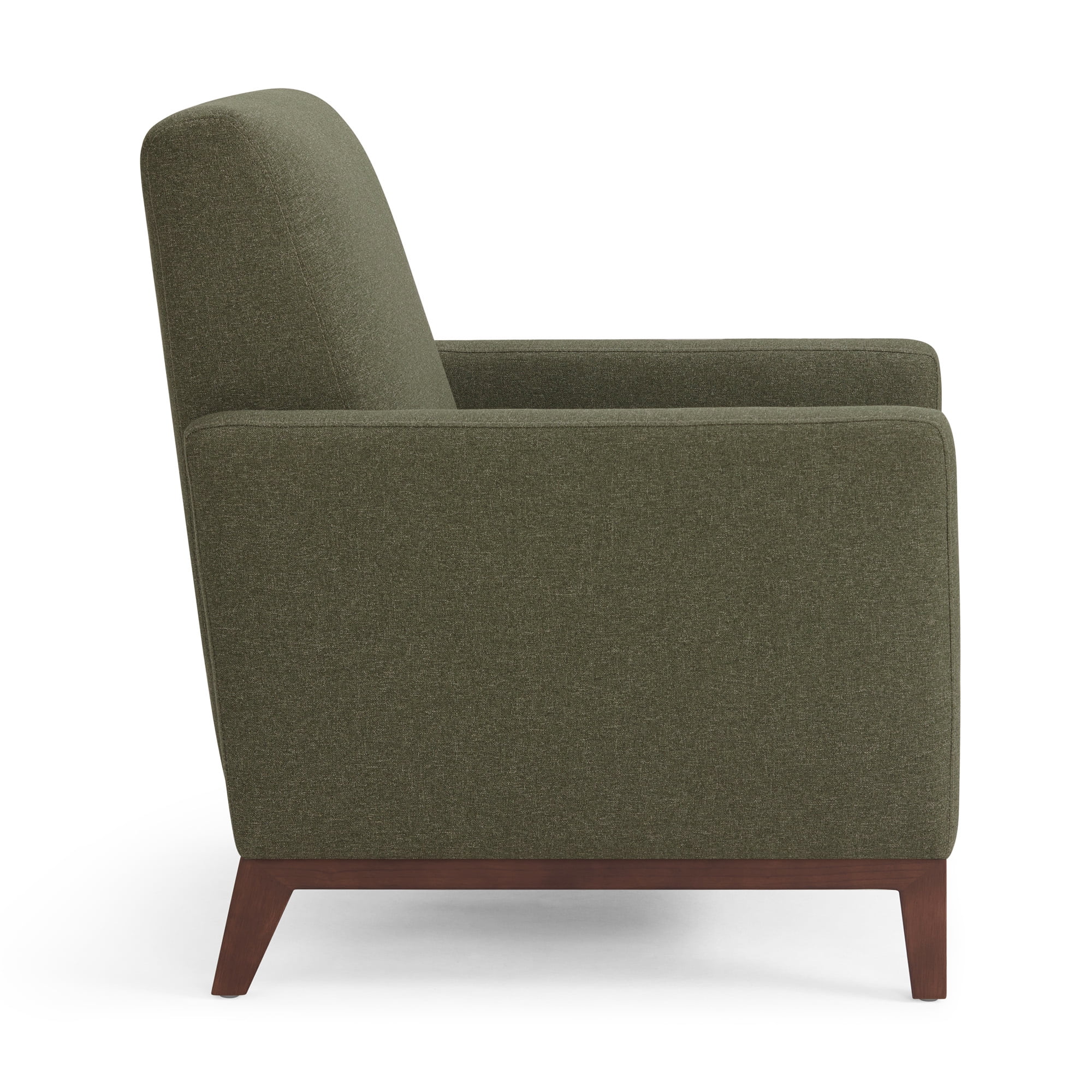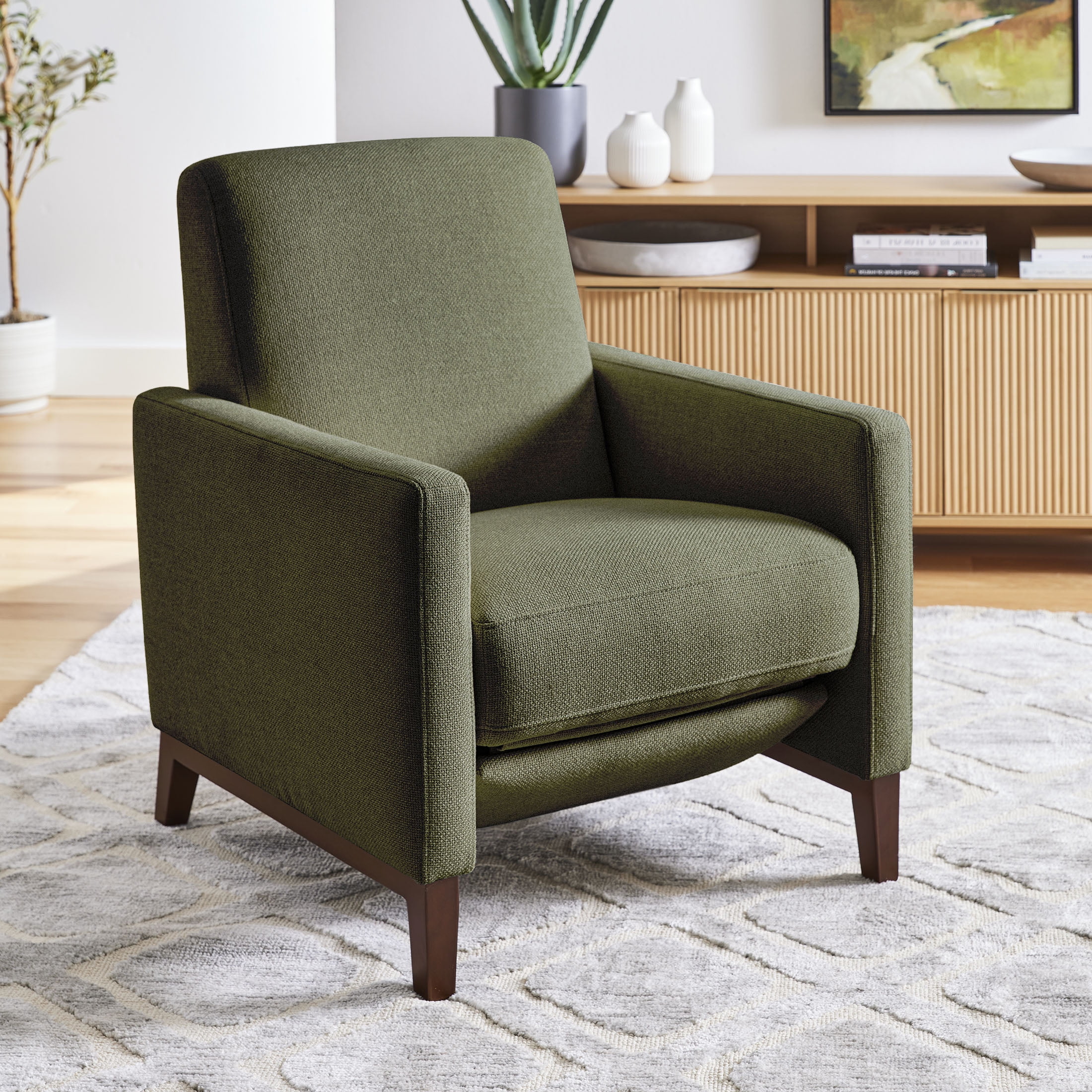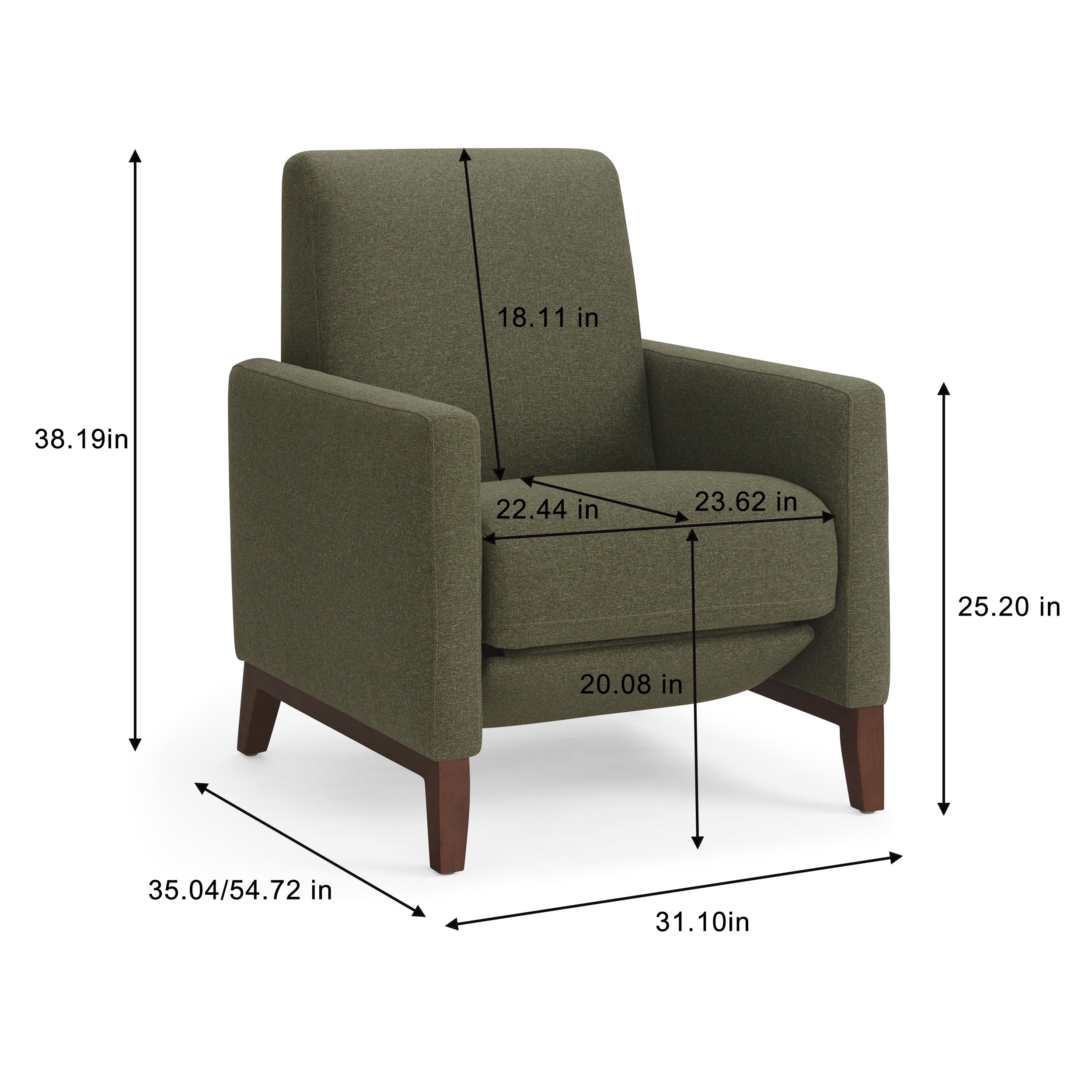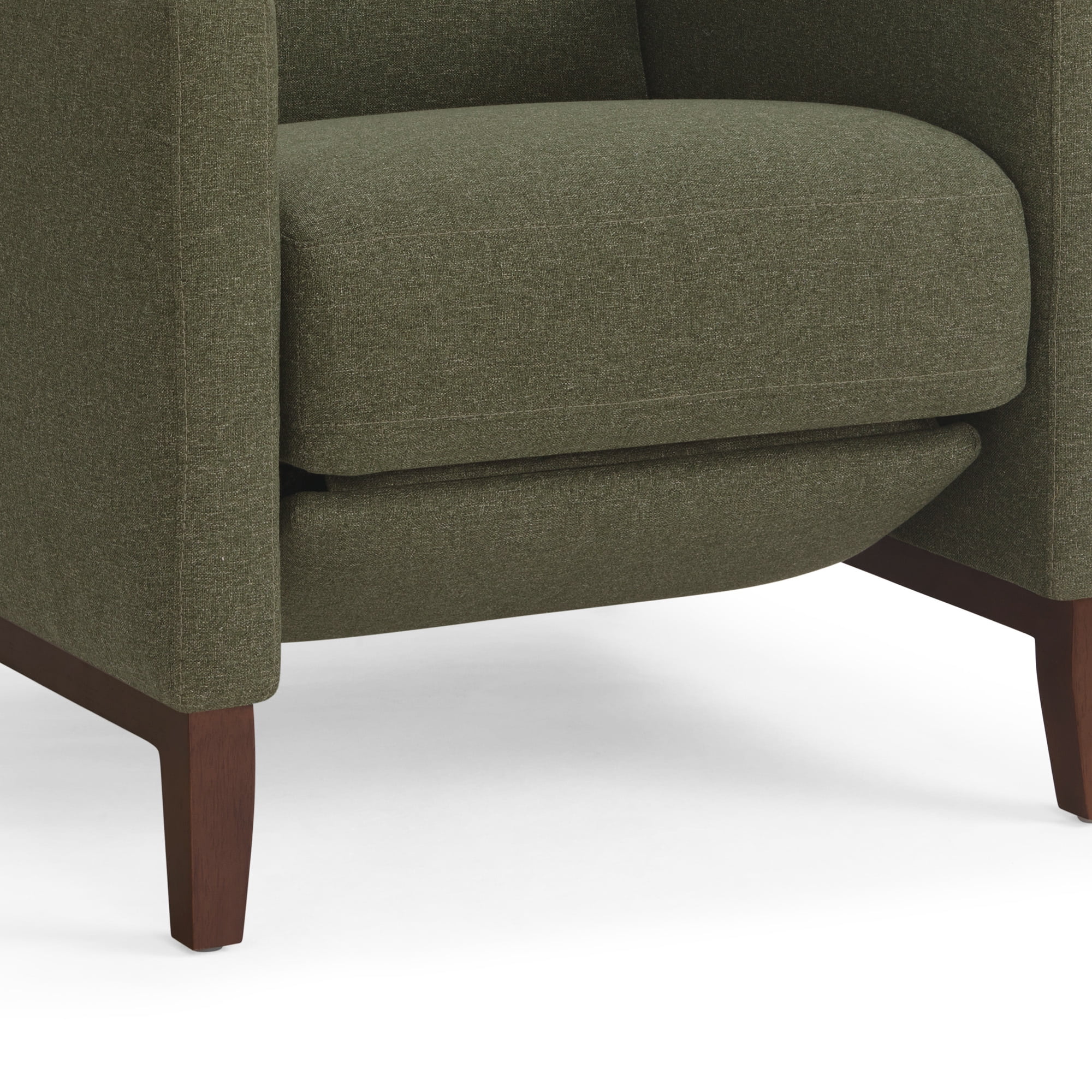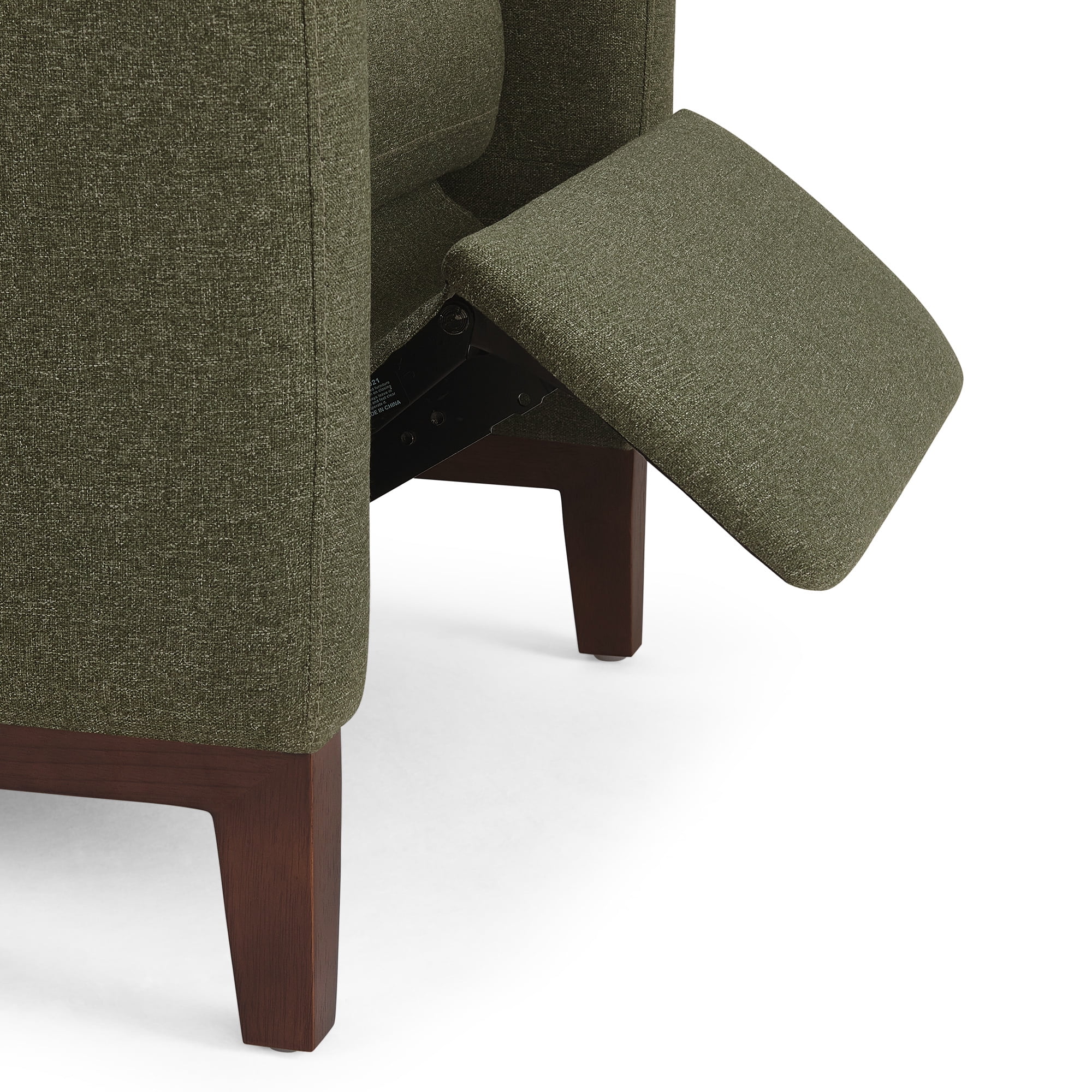 Olive upholstery with matching stitching Push back recliner Light solid wood square legs Dacron and high density foam cushions with webbed seat suspension Simple assembly required