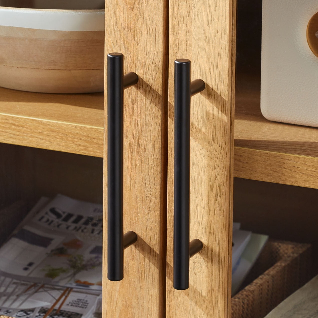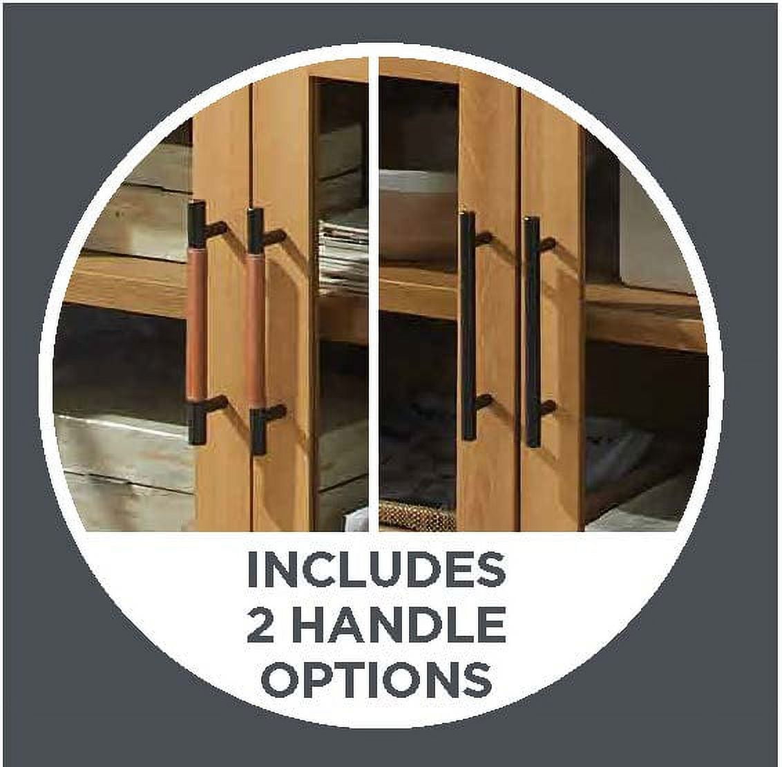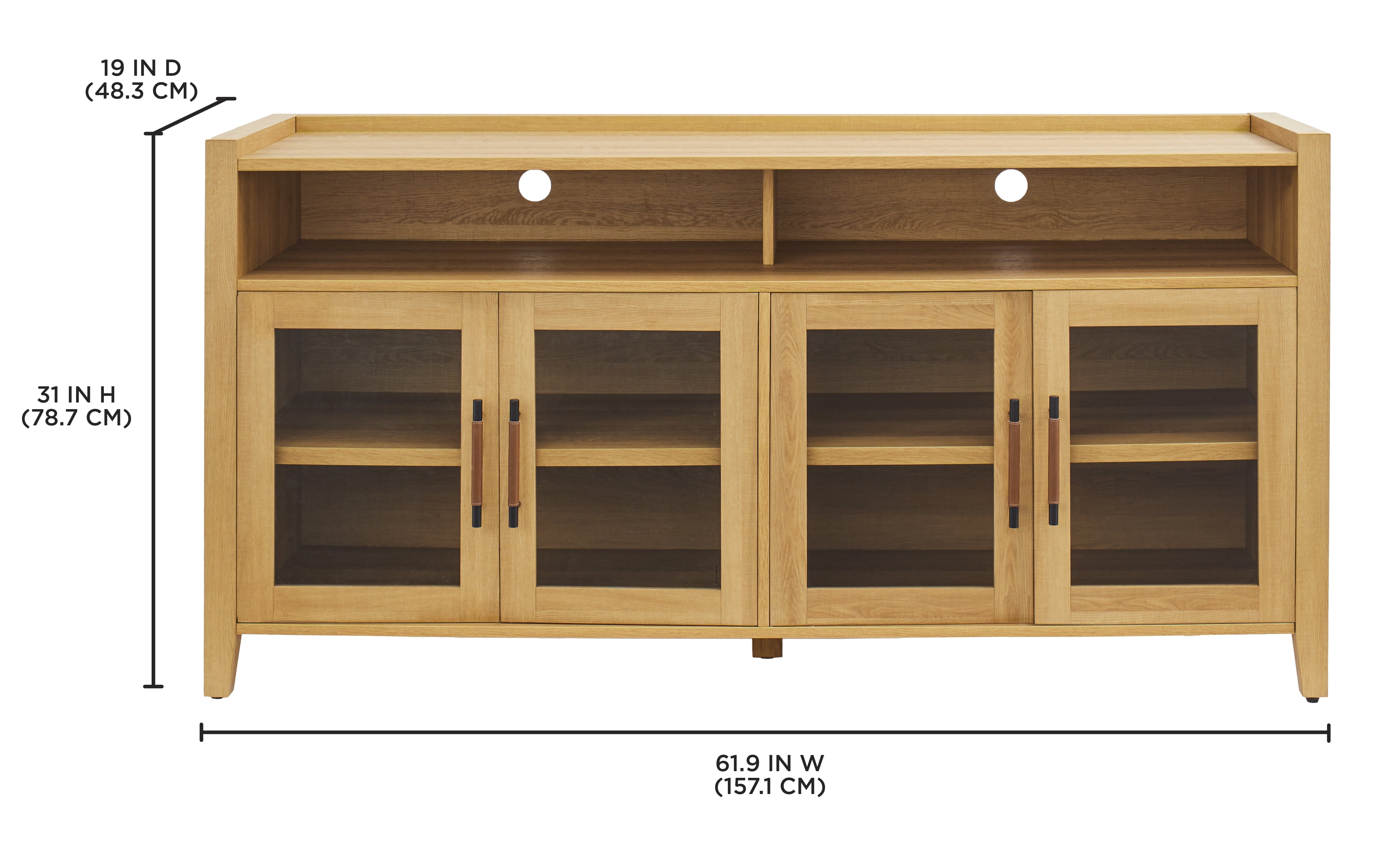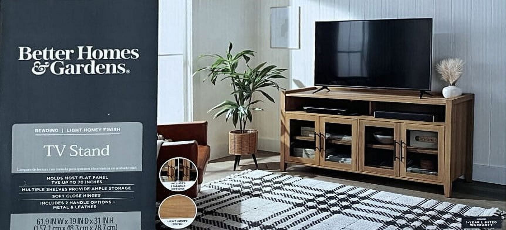 Better Homes & Gardens Reading Refined Farmhouse TV Stand for TVs up to 65″, Light Honey Finish. The modern look and clean lines make this TV stand fit well with any home décor or room style. The quality, finish & style are upscale and trend right. The size of 61.9″W*19″D*31″H accommodates flat panel TVs up to 65″ and 135 lbs. It also can also be used as an entryway console or storage cabinet in your living room. You can choose to use the plain black handles or black handles wrapped with leather as it includes both. This item is also easy to assemble.