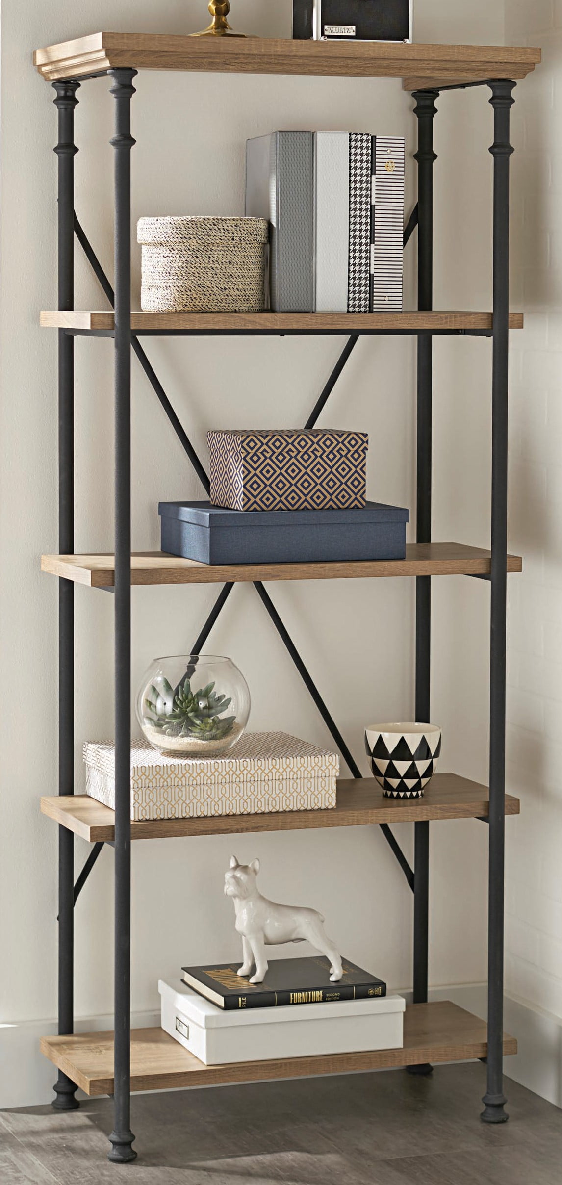 Stack, store, and display your books, framed photos, and journals on this modern and industrial style Better Homes & Gardens River Crest 5 Shelf Bookcase. It features five spacious, 1″ thick shelves that hold and books, binders, framed photos, collectibles, and whatever your little heart desires! The powder-coated metal frame and rear crossbars for stability add an extra touch of an industrial yet rustic style that will stand out in any room. Its metal frame provides added durability that is sure to hold up for years to come. The mixed material aesthetic and simple design of this unit gives it a contemporary, yet natural feel that will transform your room. This River Crest bookcase is a versatile fit for the living room, office, bedroom, or virtually anywhere and it’s sure to get your home looking organized in no time! This bookcase is 70″.