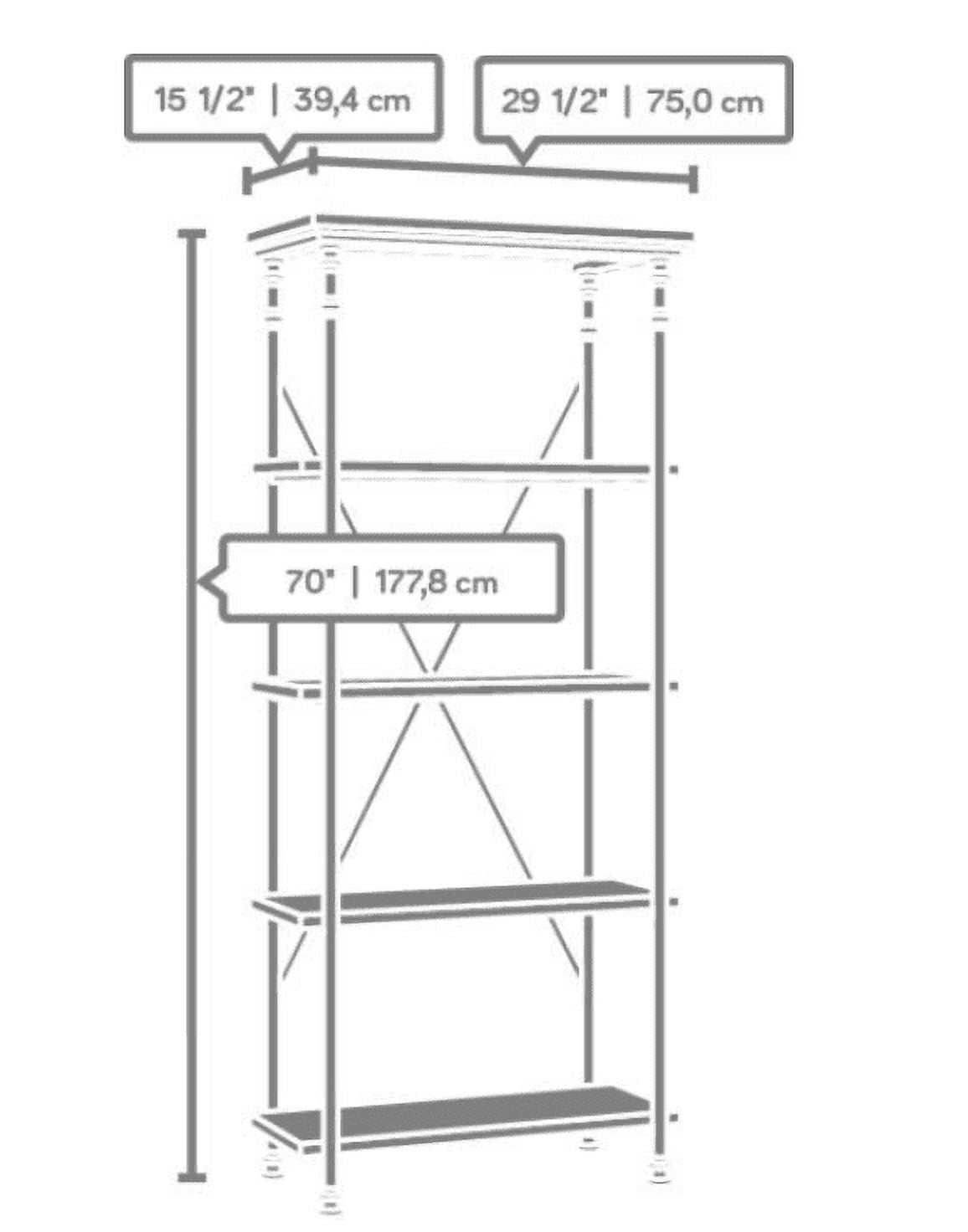 Assembled Dimensions: 15.51″ L x 29.53″ W x 70.00″ H Mixed material aesthetic 1″ thick shelves Finished on all sides for versatile placement Rear crossbars for stability Rustic Oak finish Model #: 418305 For additional questions, please contact the manufacturer at 1-800-523-3987 Be sure to check out the Better Homes & Gardens River Crest collection for more great items!