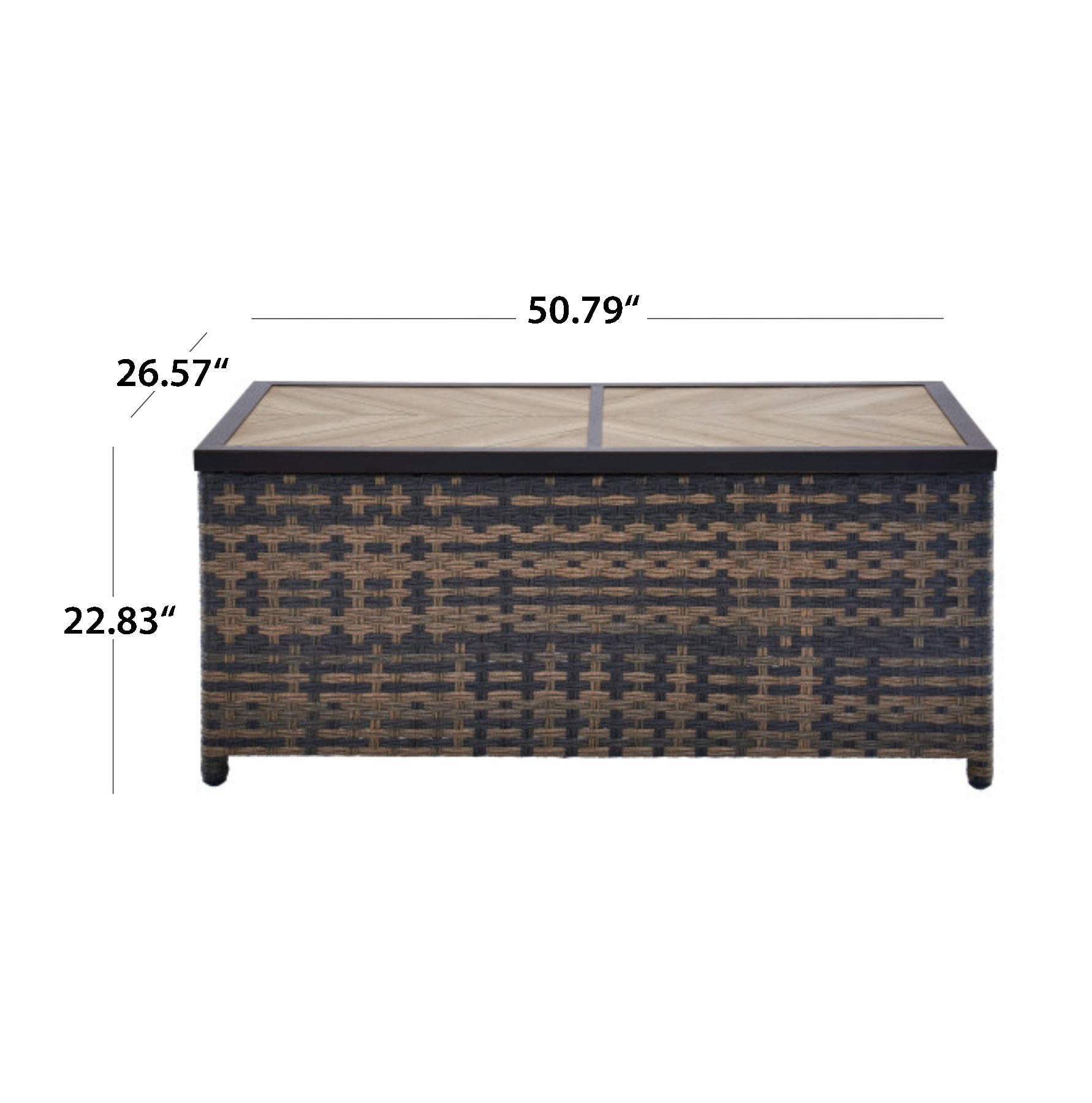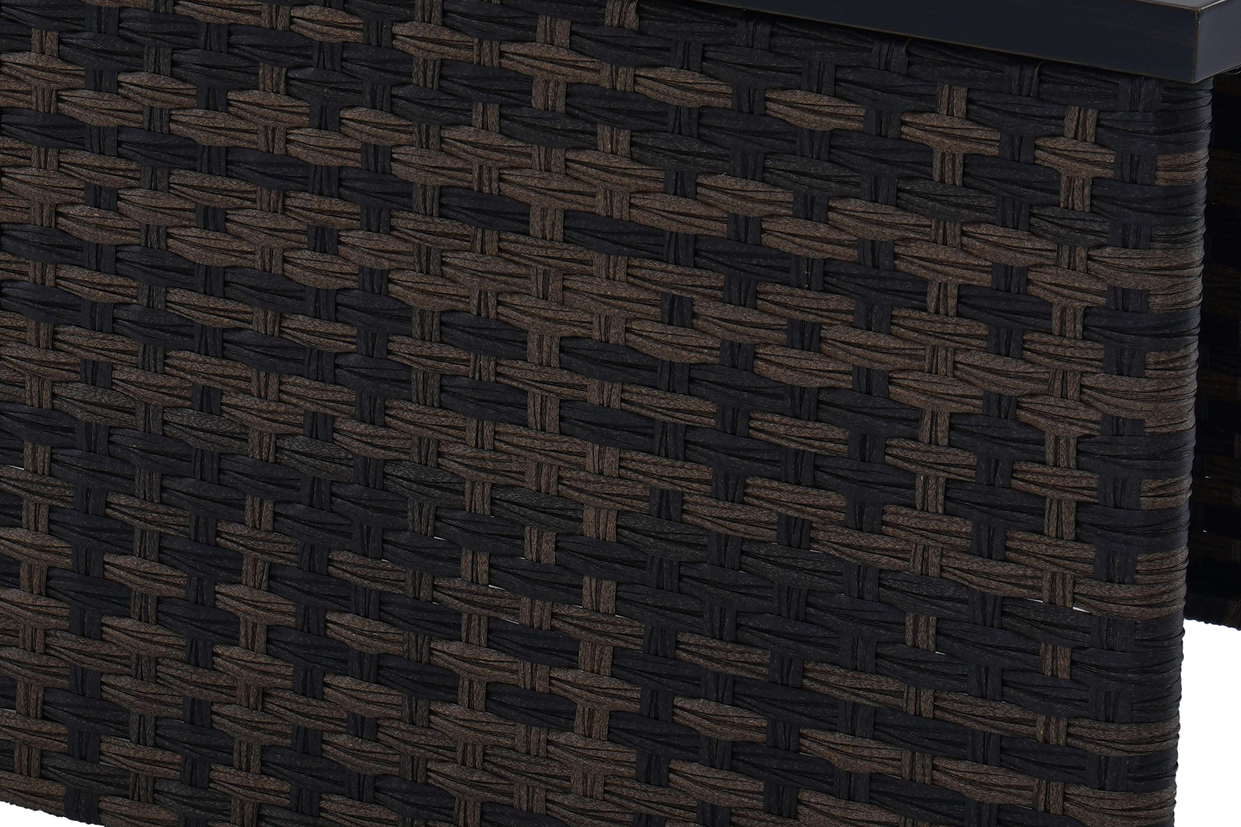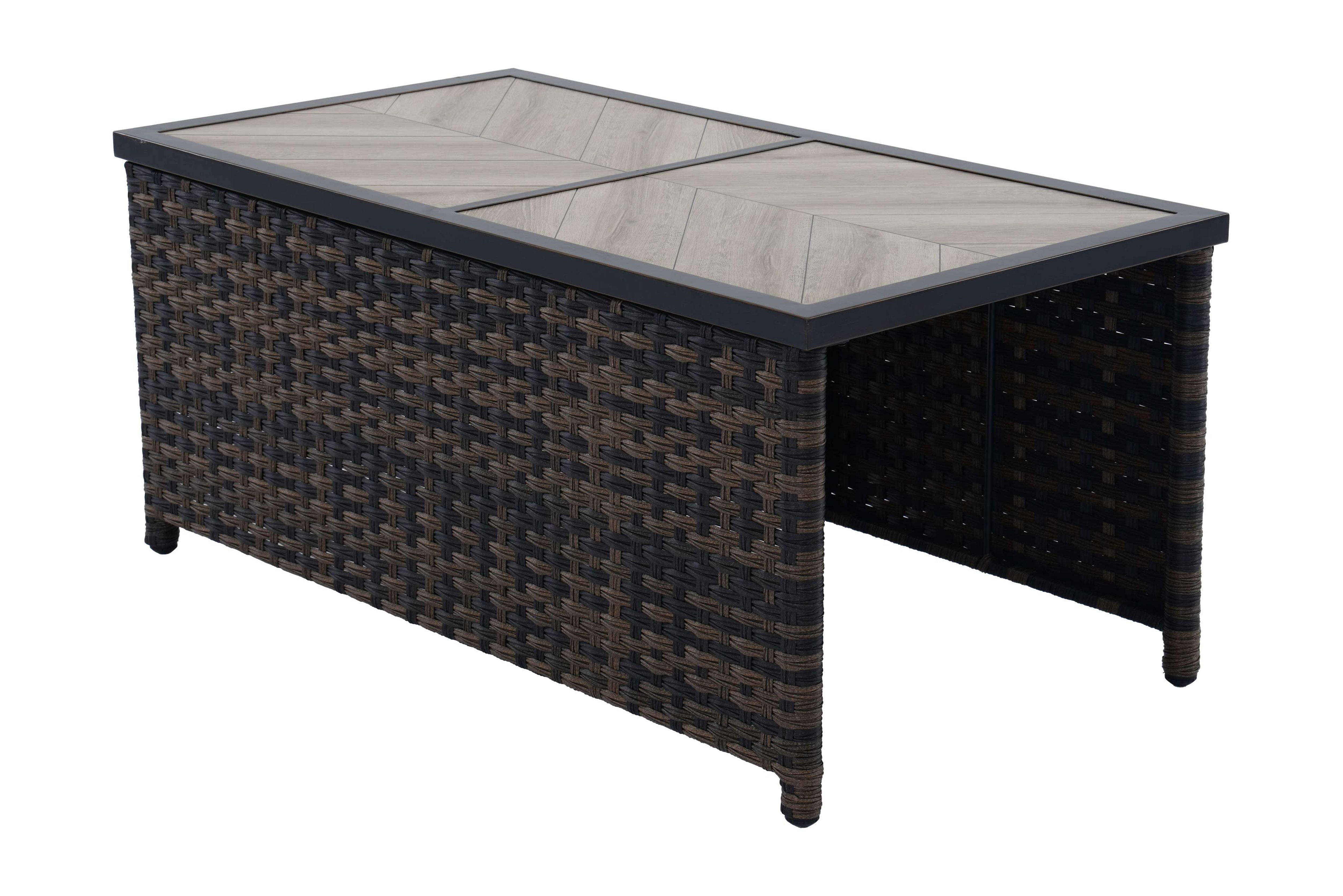 Materials and Construction: Handwoven all-weather wicker base E-coated and powder-coated rust-resistant steel frame Decorative ceramic tile top with wood-look herringbone pattern Configuration and Dimensions: 26.57″D x 50.79″W x 22.83″H Functionality Features: Spacious surface for drinks, décor, or snacks Weather Resistance: Built to resist fading, rusting, and damage from outdoor elements Assembly: Quick and easy assembly with included instructions Warranty: 3-year limited warranty on frame and wicker 1-year limited warranty on tile Maintenance Callout: Wipe clean with soapy water and a soft cloth Air dry Customer Service: For assistance, call 1-844-428-6923 (Mon–Fri, 8AM–8PM EST)