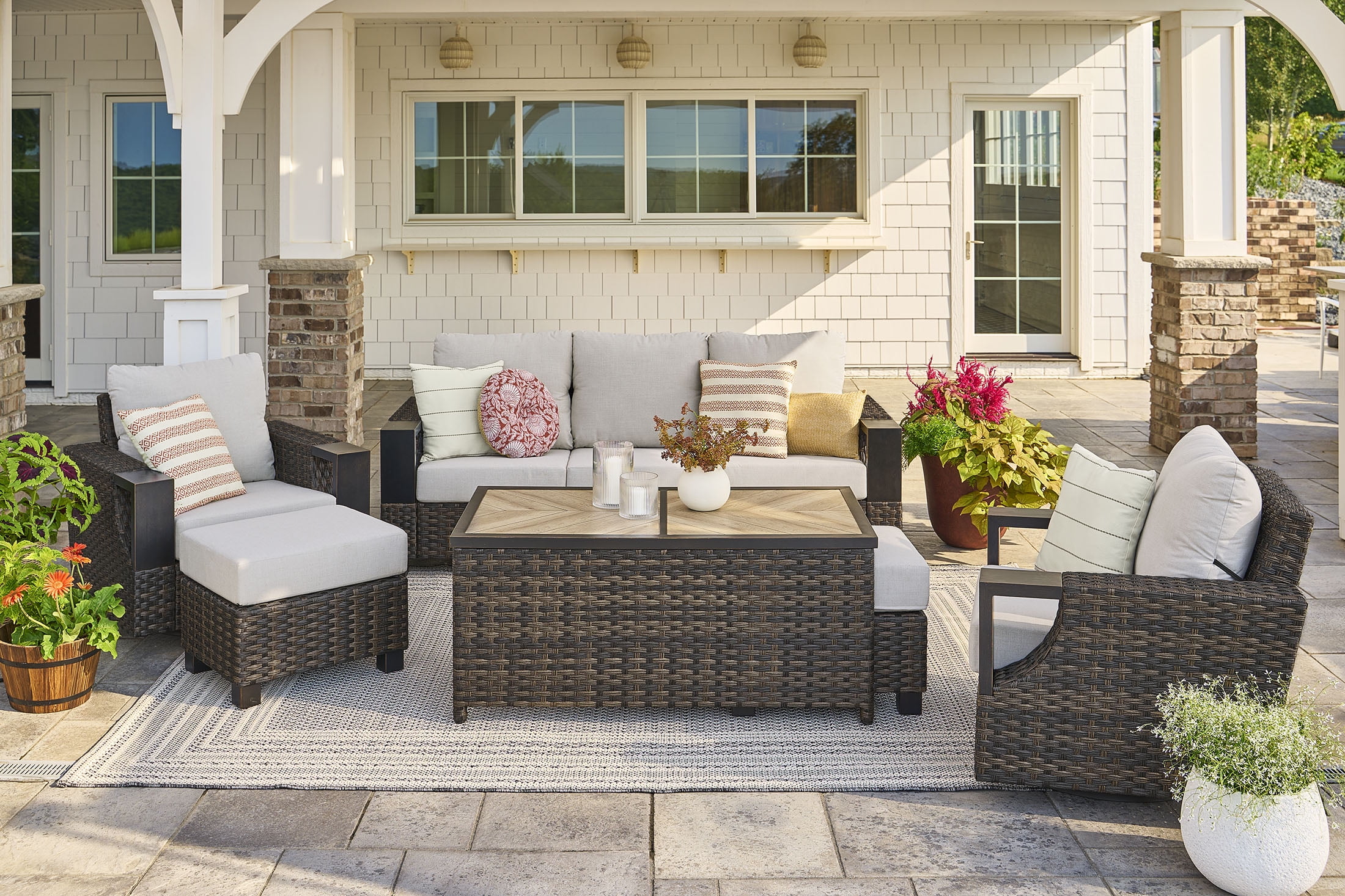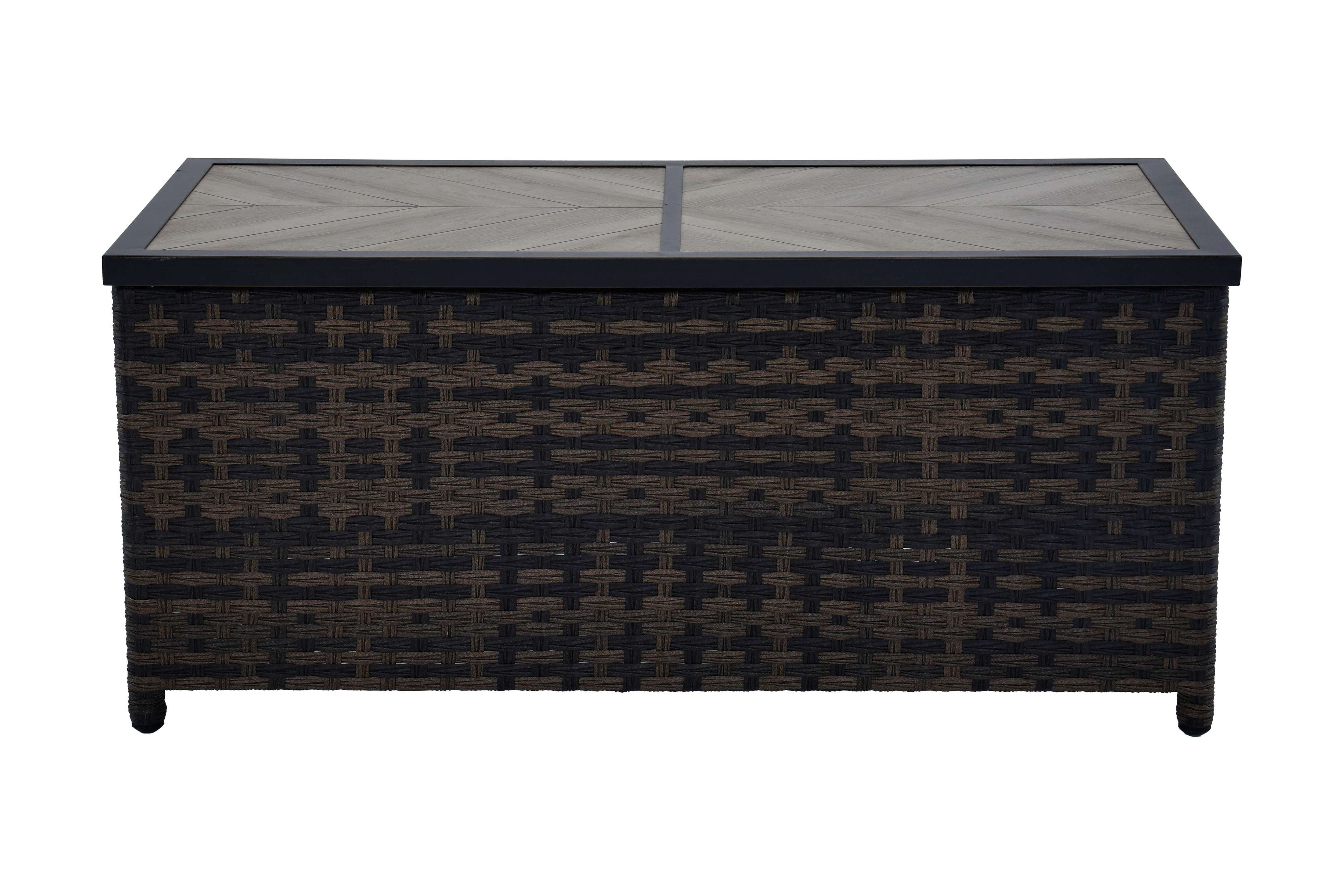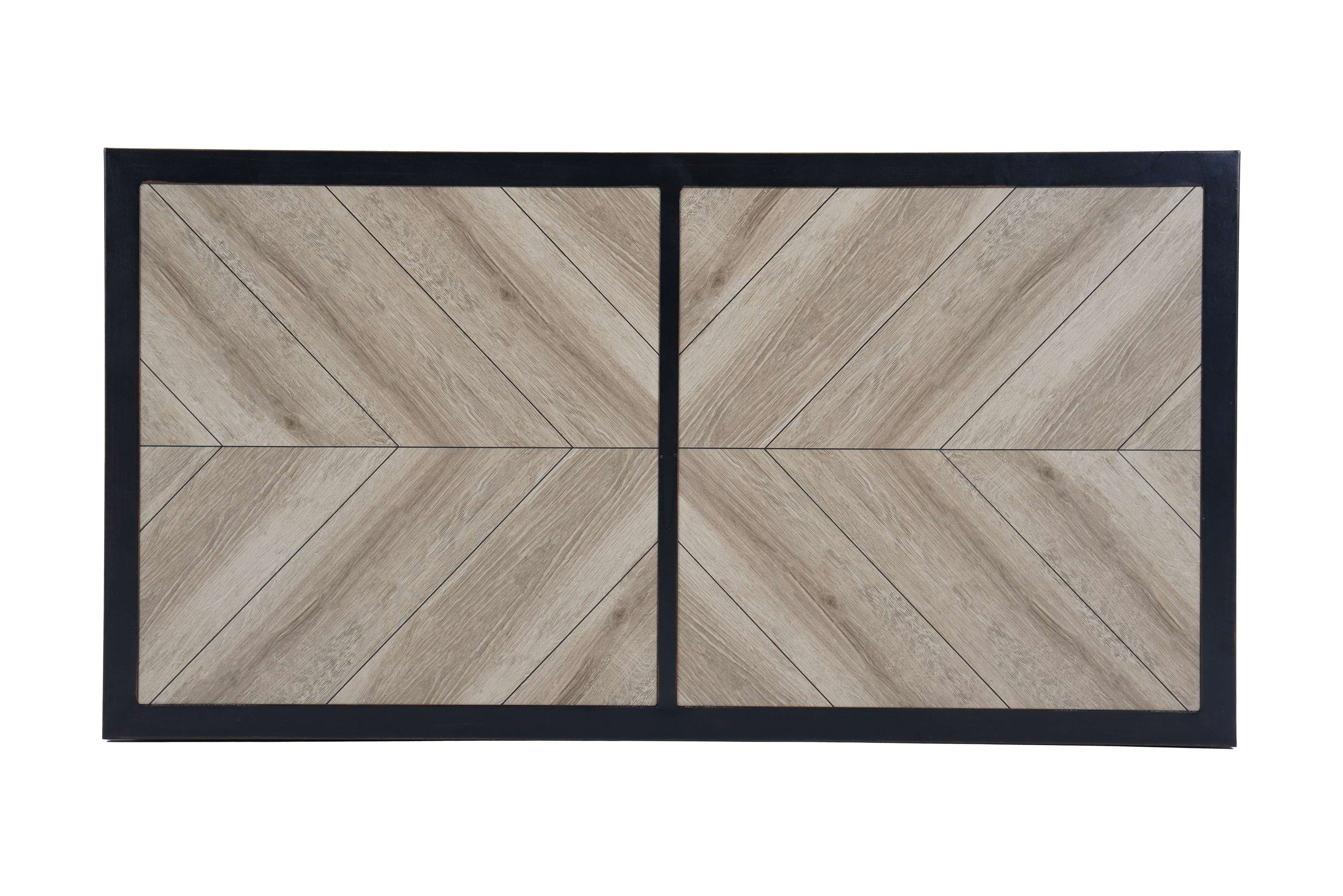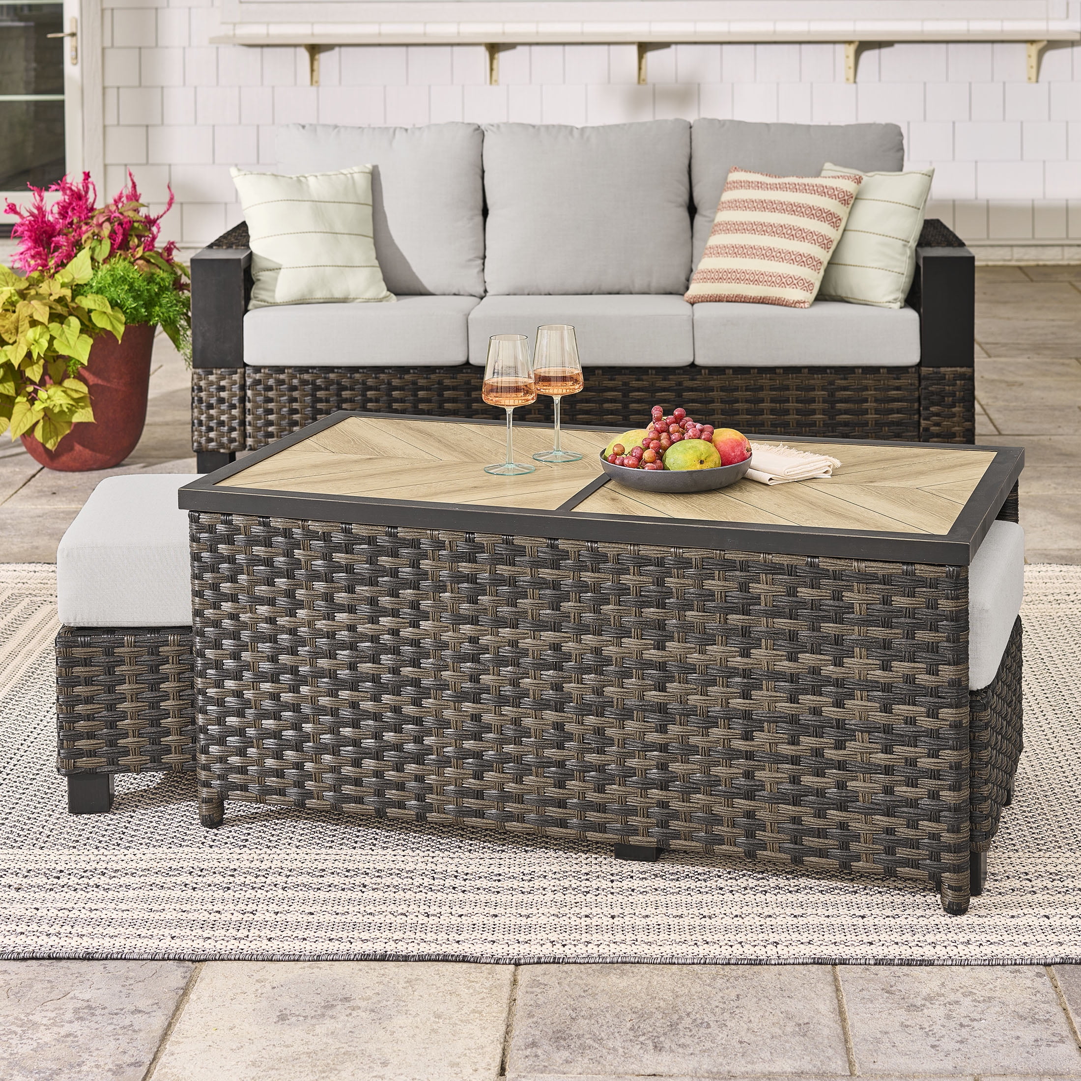 Materials and Construction: Handwoven all-weather wicker base E-coated and powder-coated rust-resistant steel frame Decorative ceramic tile top with wood-look herringbone pattern Configuration and Dimensions: 26.57″D x 50.79″W x 22.83″H Functionality Features: Spacious surface for drinks, décor, or snacks Weather Resistance: Built to resist fading, rusting, and damage from outdoor elements Assembly: Quick and easy assembly with included instructions Warranty: 3-year limited warranty on frame and wicker 1-year limited warranty on tile Maintenance Callout: Wipe clean with soapy water and a soft cloth Air dry Customer Service: For assistance, call 1-844-428-6923 (Mon–Fri, 8AM–8PM EST)