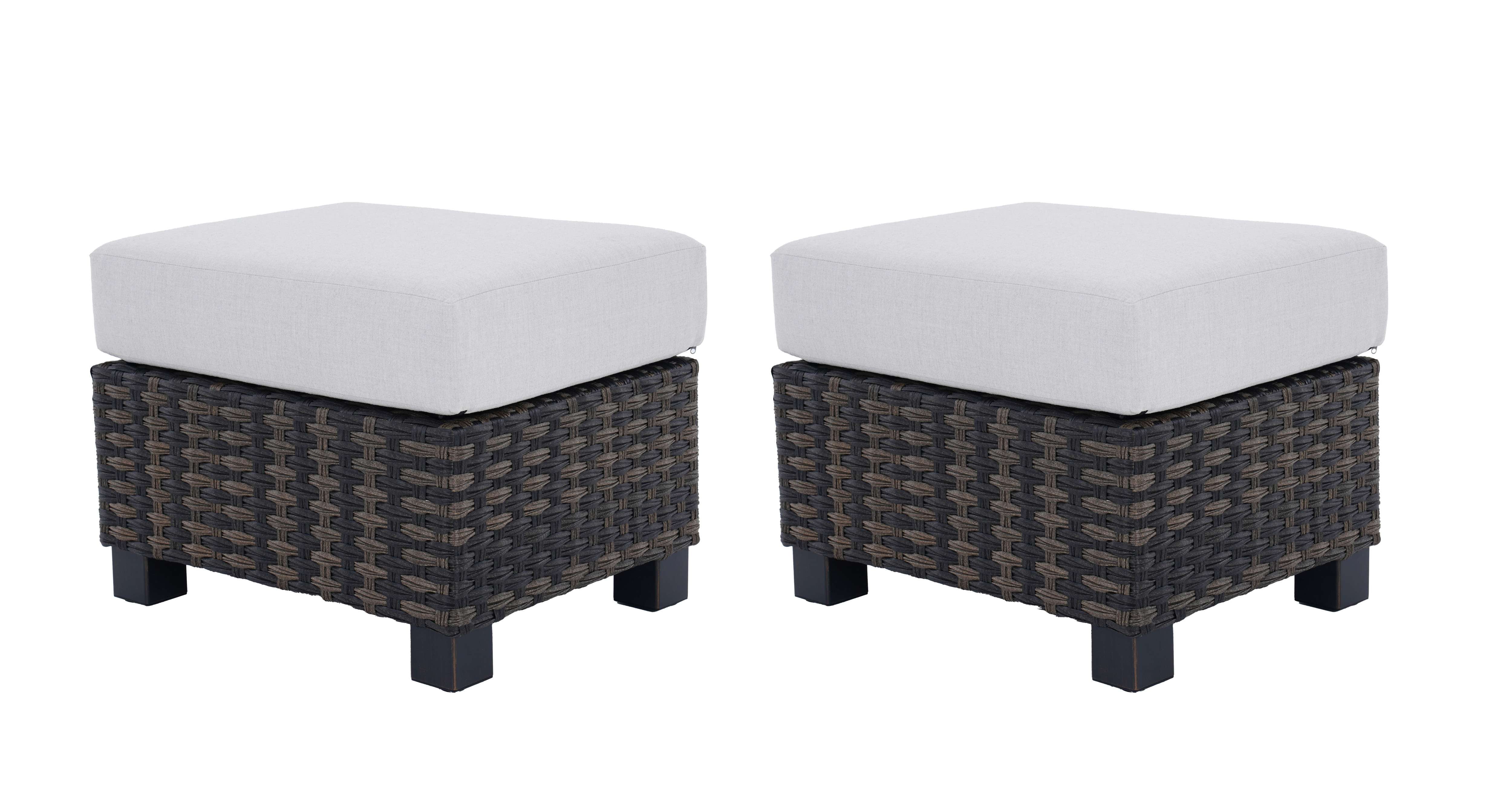 Complete your patio setup with the Better Homes and Gardens Rockport Wicker Outdoor Ottomans, Set of 2. Designed for versatility and comfort, these ottomans can serve as footrests, ottoman side tables, or additional seating on your patio, porch or deck. Handwoven in rich black and brown all-weather wicker, each ottoman features an e-coated and powder-coated rust-resistant steel frame for long-lasting durability. The thick foam cushions are wrapped in 3M Scotchgard treated acrylic fabric, which resists fading, water, and stains for season after season of outdoor use. Pair them with the Rockport Swivel Chairs or Rockport Ceramic Tile Top Coffee Table to complete your outdoor entertaining space look. Site to Store Pick Up Note: This item is packaged in 1 large box that may not fit into a standard-sized vehicle. Please make sure you have a large car or truck for store pickup.