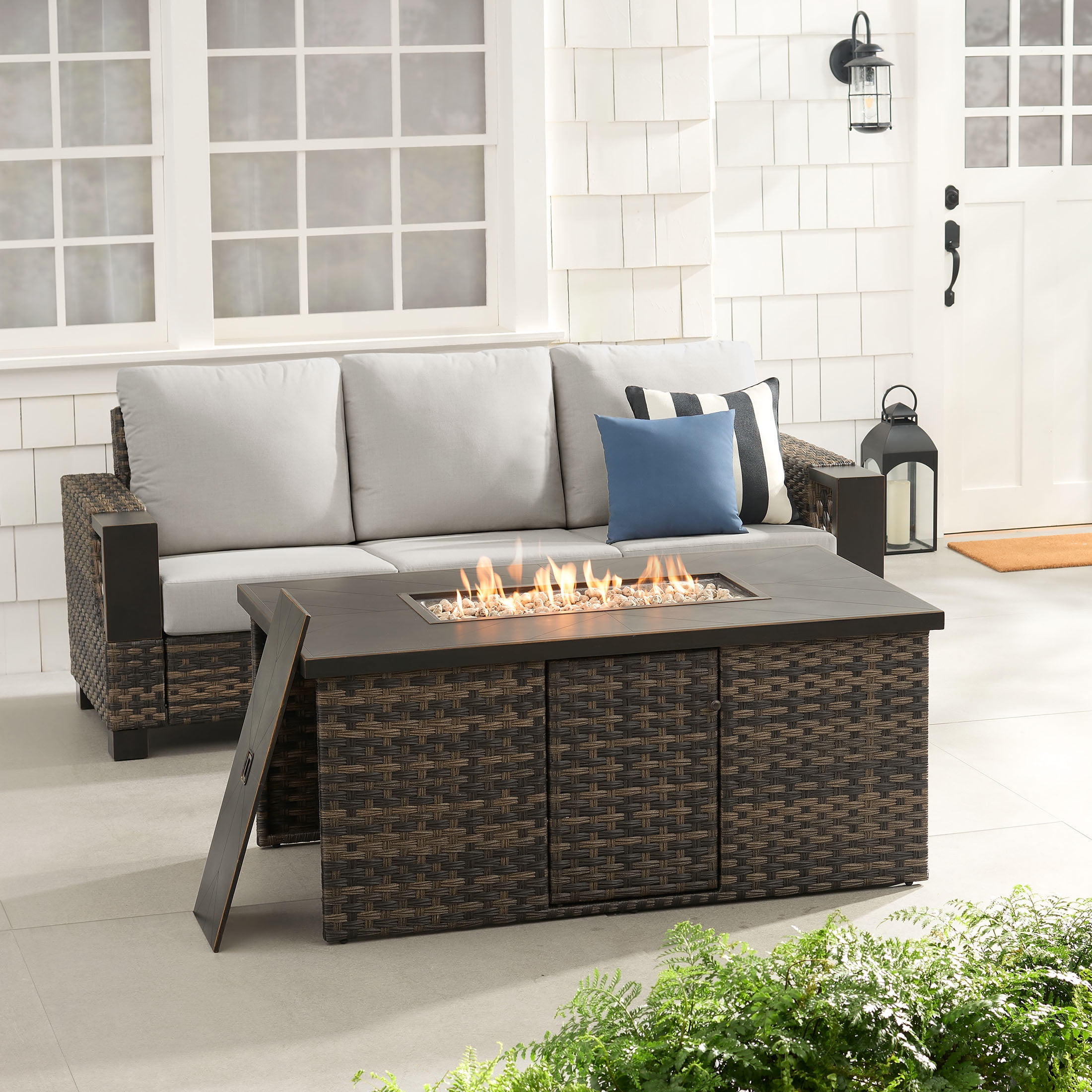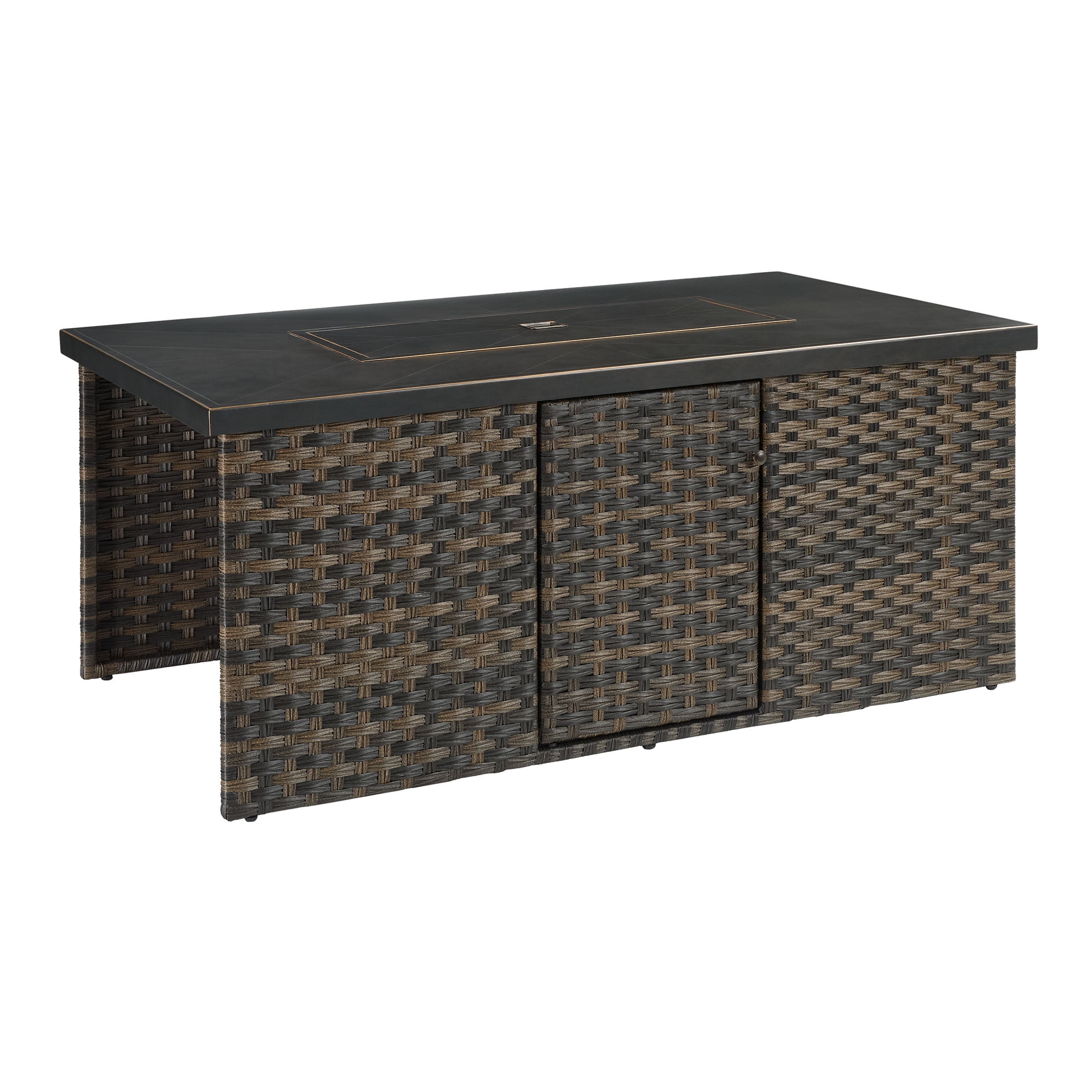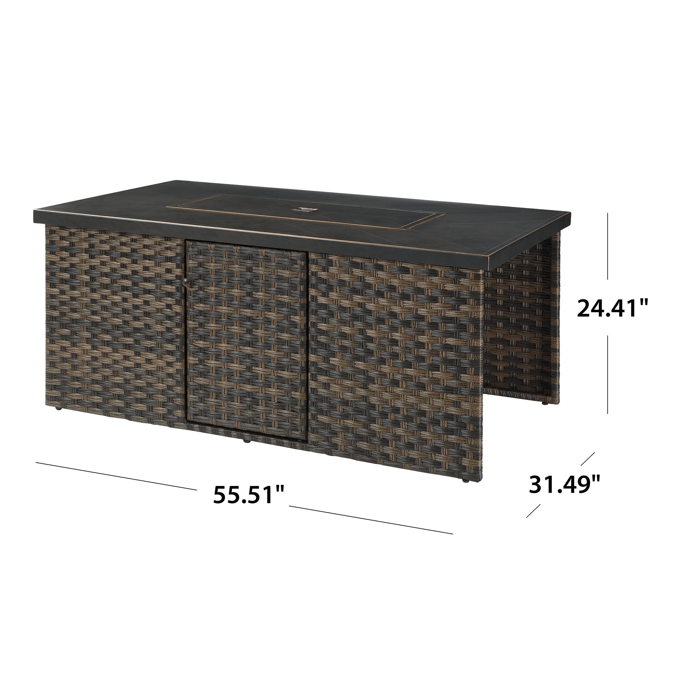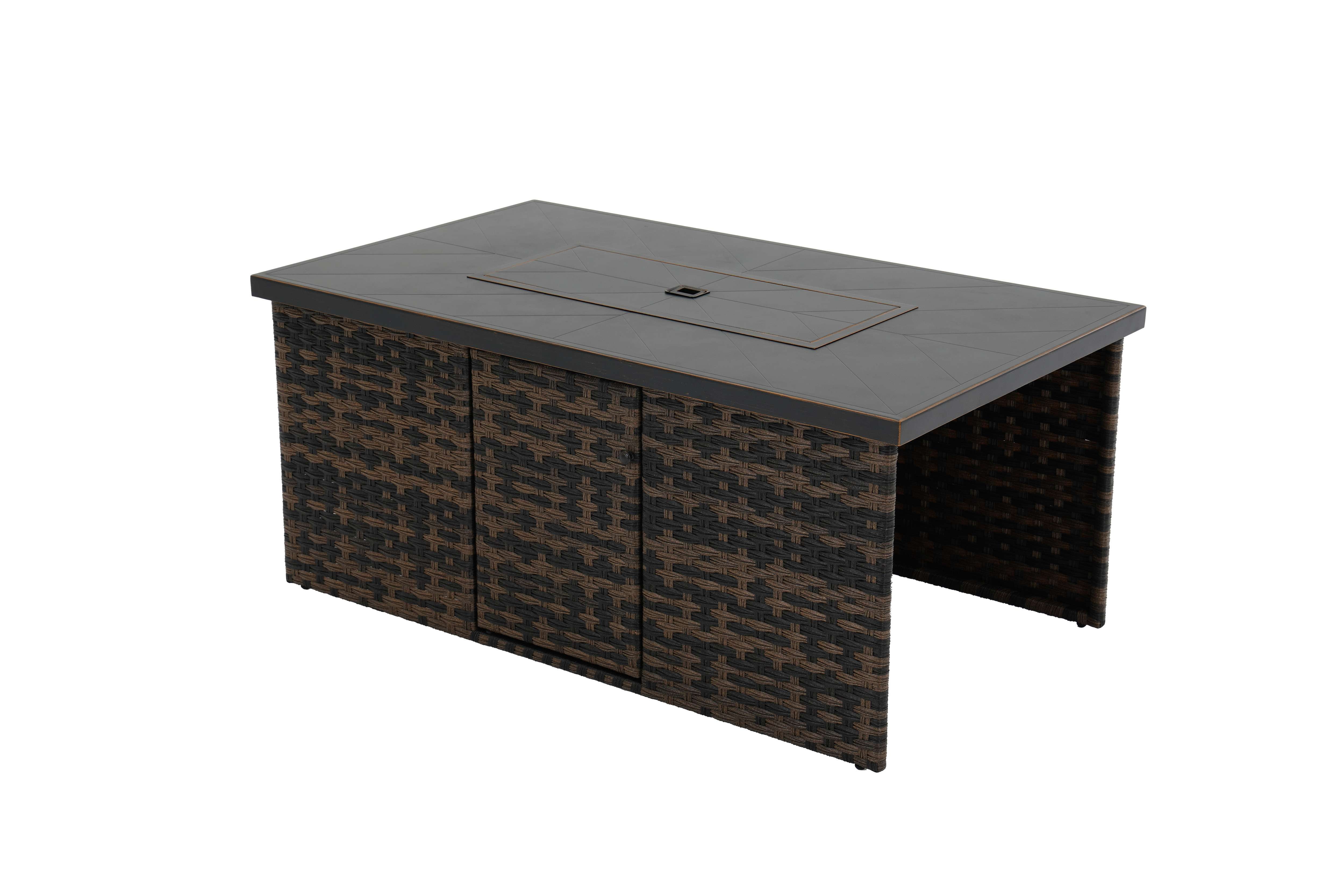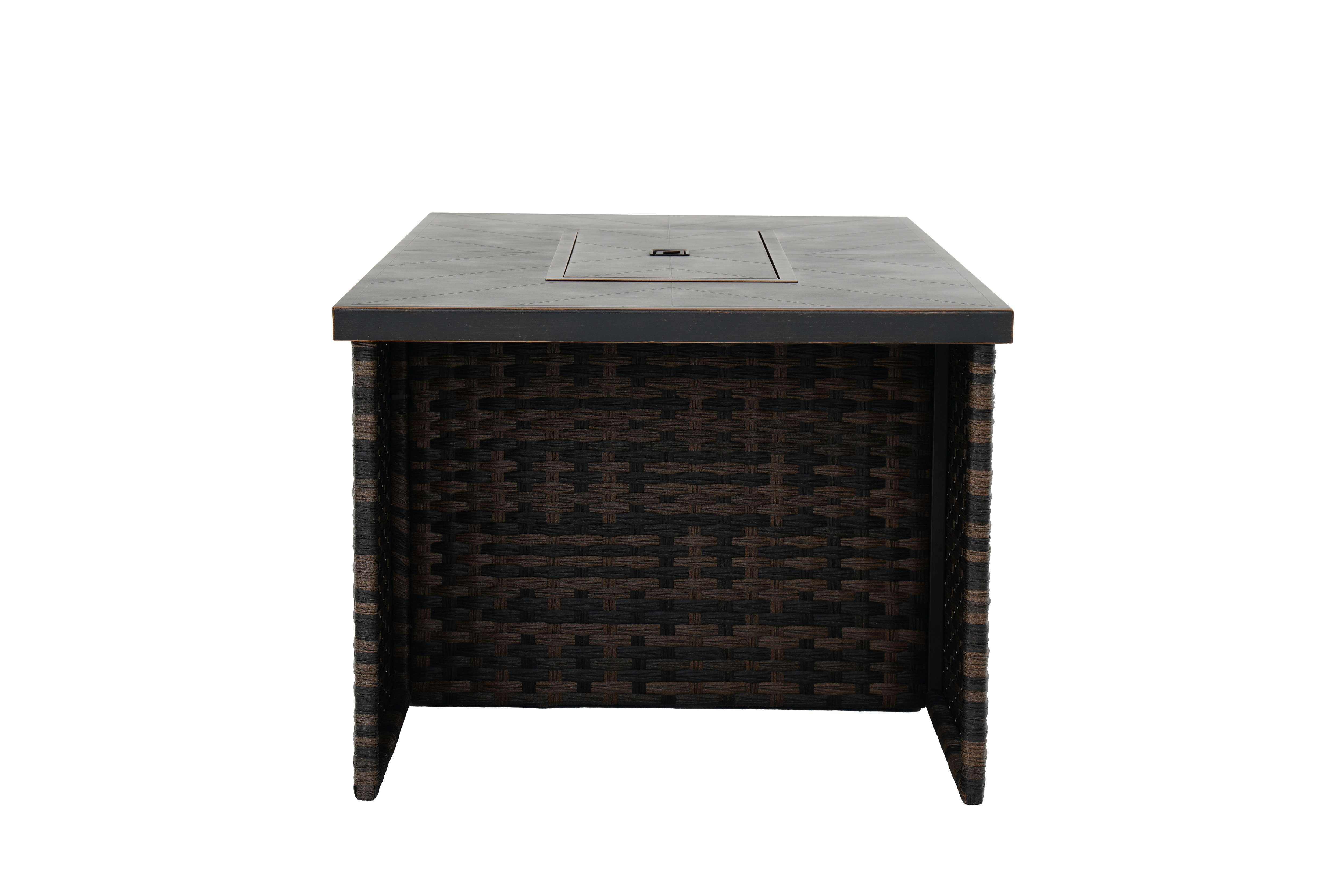 Better Homes & Gardens Rockport Fire Pit Table, Brown Materials & Construction: Hand-painted metal tabletop with herringbone pattern | Handwoven all-weather wicker base | E-coated and powder-coated steel frame Configuration & Dimensions: 55.51″L x 31.5″W x 24.41″H Firepit Features: 50,000 BTU (20lb. propane tank not included) | Electric push button ignition and flame level control knob | Propane tank access side door Weather Resistance: Designed to resist rust and outdoor wear Assembly: Easy assembly with instructions included Warranty: 3-year limited warranty on frame and wicker Maintenance Callout: Wipe down with soapy water as needed and allow to air dry Customer Service: For support, call 1-844-428-6923 (Mon–Fri, 8:00 AM – 8:00 PM EST)