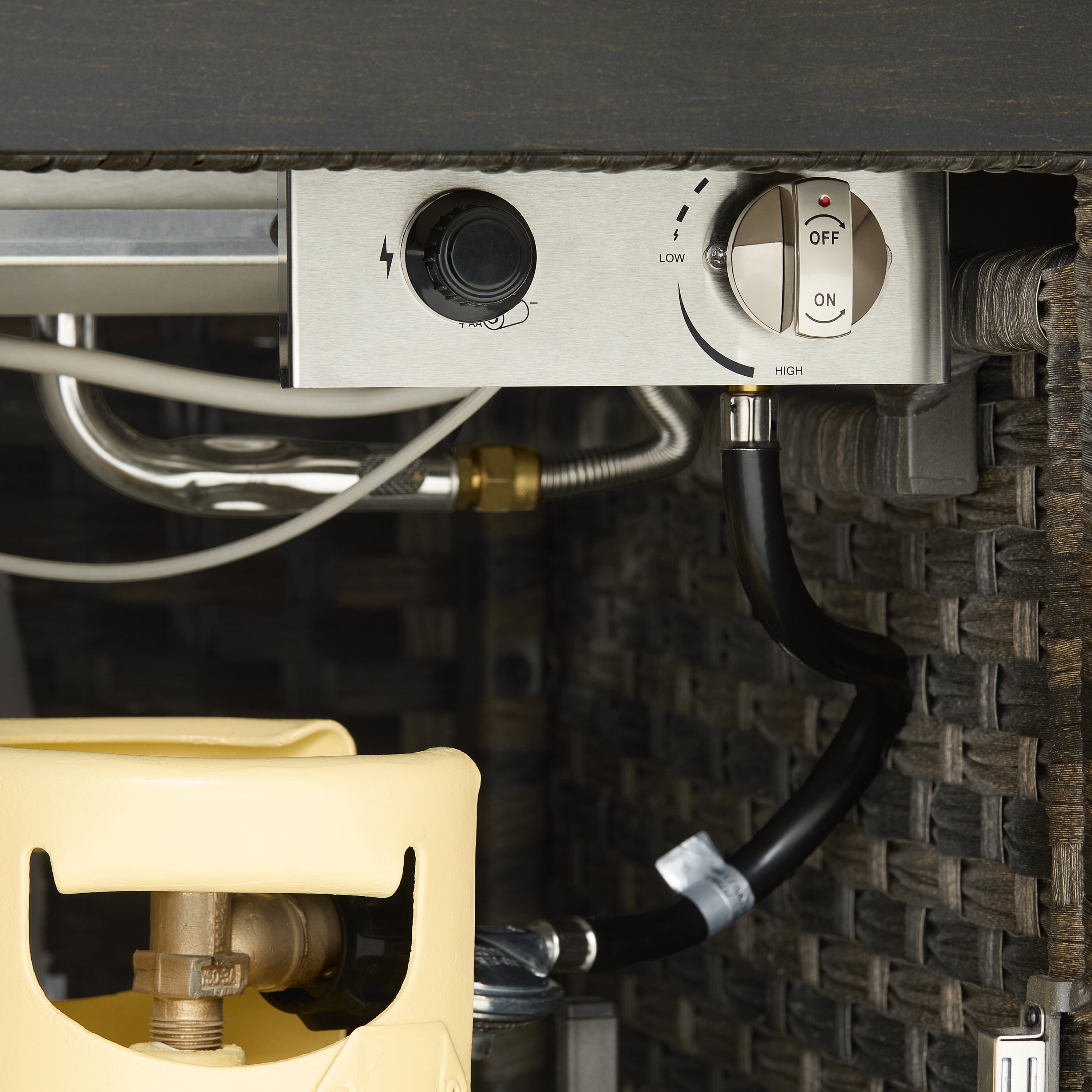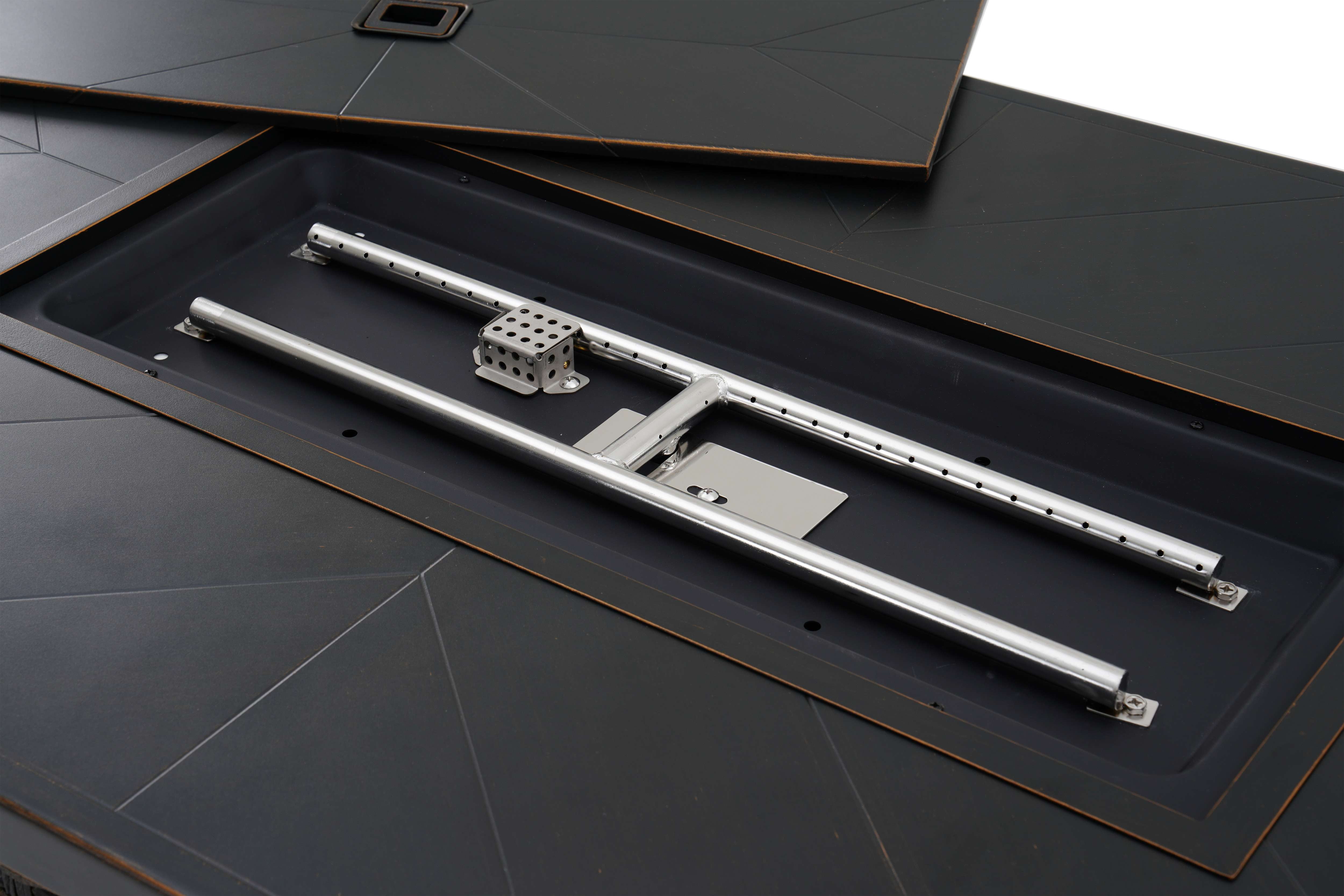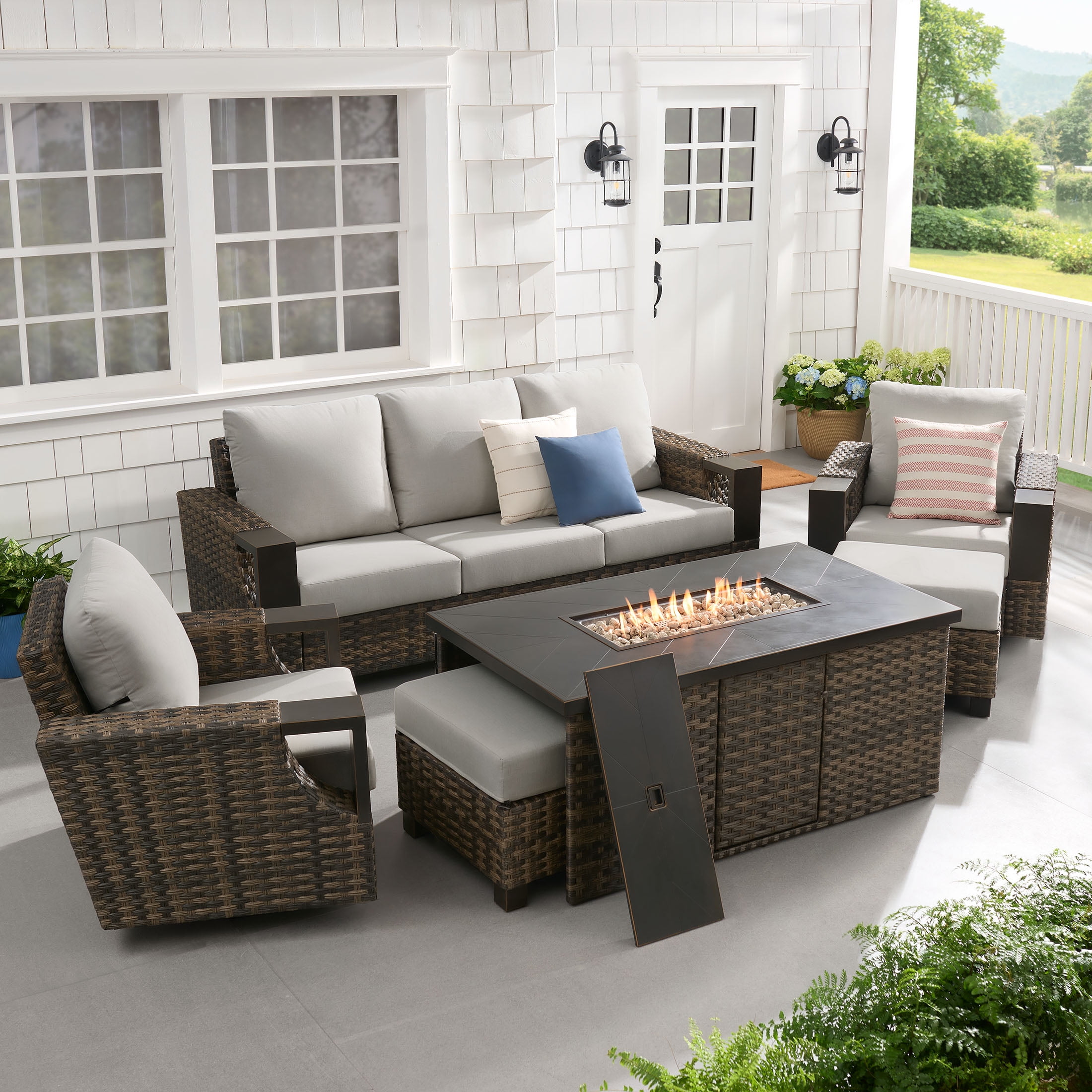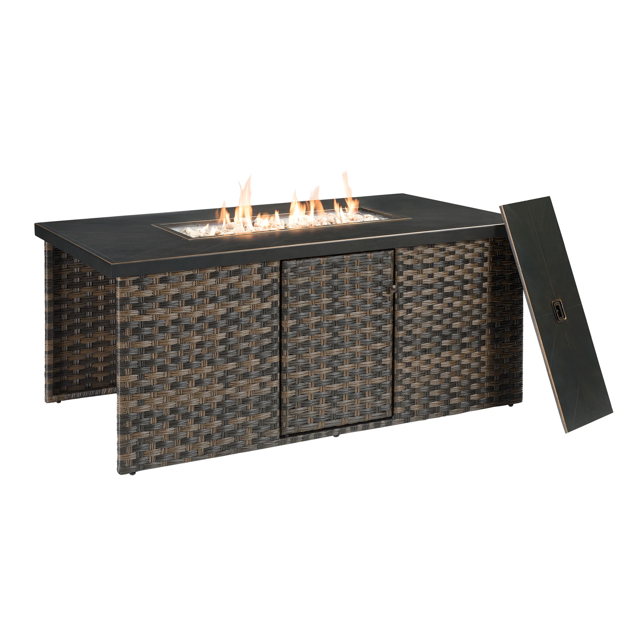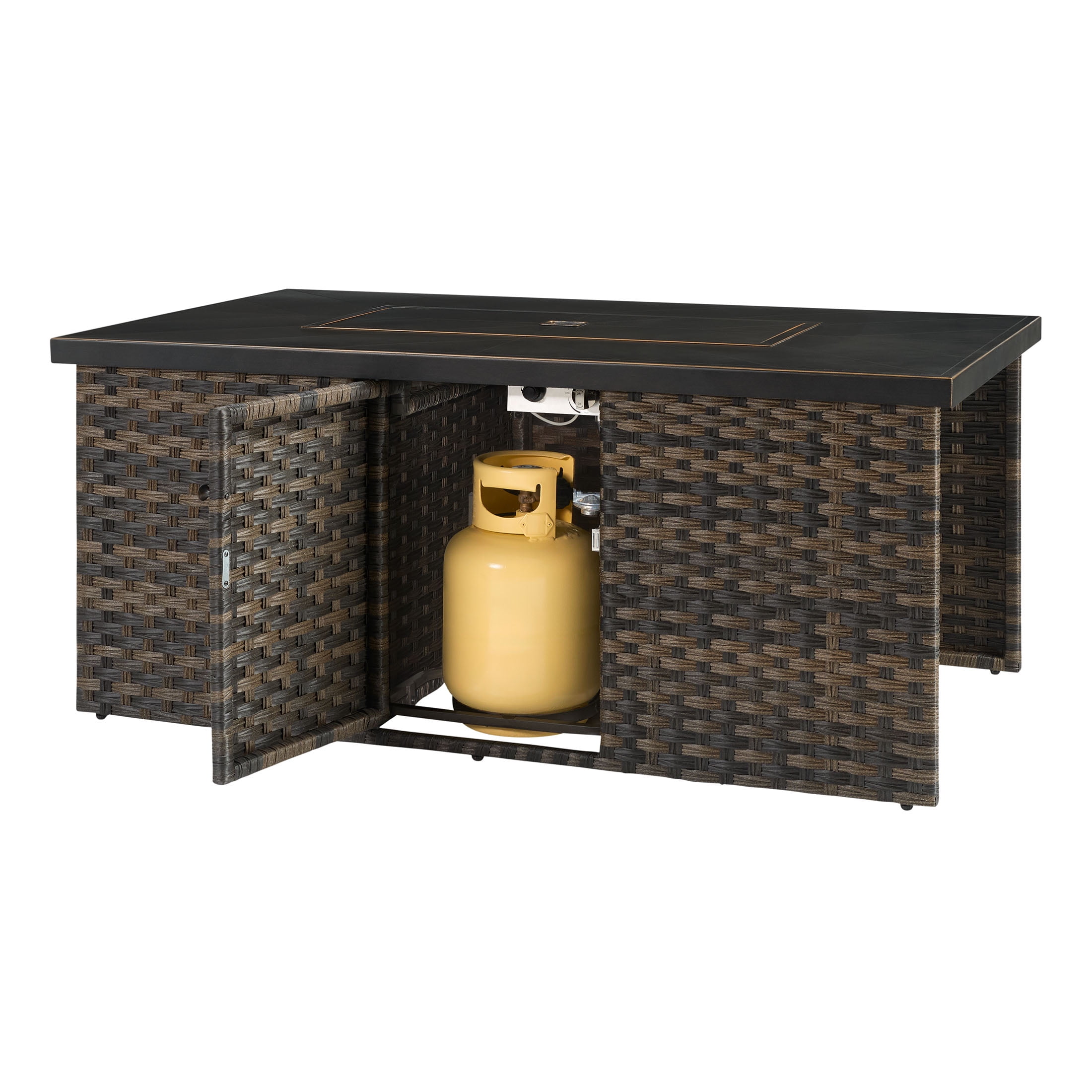 Better Homes & Gardens Rockport Fire Pit Table, Brown Materials & Construction: Hand-painted metal tabletop with herringbone pattern | Handwoven all-weather wicker base | E-coated and powder-coated steel frame Configuration & Dimensions: 55.51″L x 31.5″W x 24.41″H Firepit Features: 50,000 BTU (20lb. propane tank not included) | Electric push button ignition and flame level control knob | Propane tank access side door Weather Resistance: Designed to resist rust and outdoor wear Assembly: Easy assembly with instructions included Warranty: 3-year limited warranty on frame and wicker Maintenance Callout: Wipe down with soapy water as needed and allow to air dry Customer Service: For support, call 1-844-428-6923 (Mon–Fri, 8:00 AM – 8:00 PM EST)