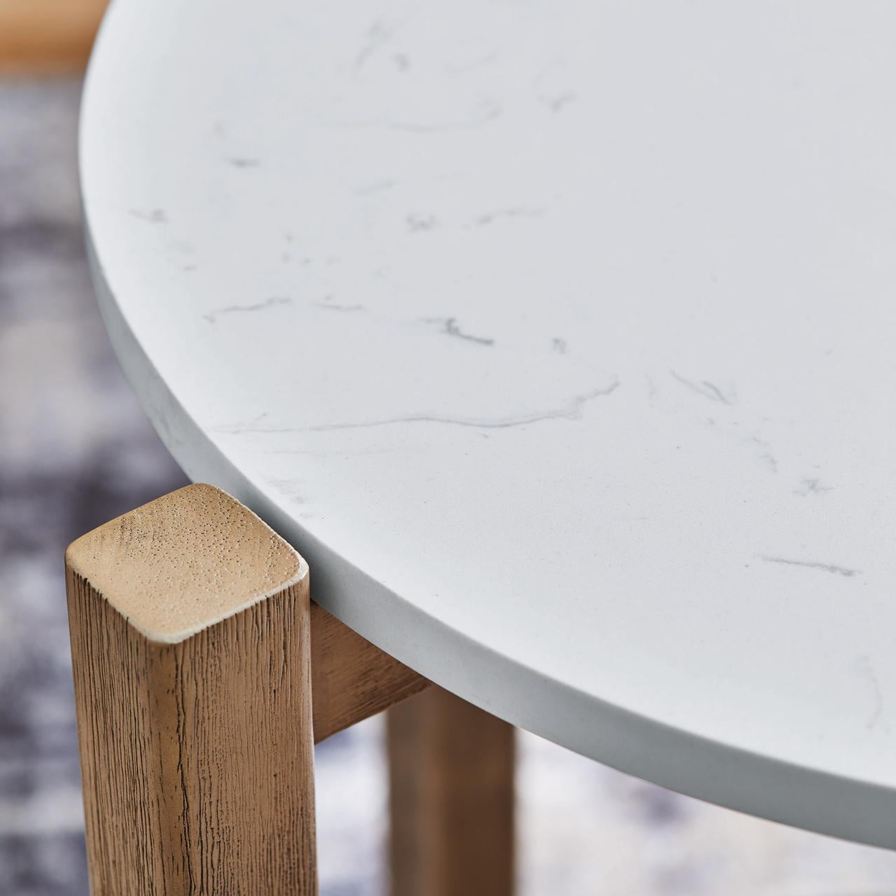 Better Homes & Gardens Marble End Table Add a modern classy feel to your home Cultured marble stone top – 16.9 Inch Diameter Surface Two-tiered design provides additional surface space and functionality Solid wood frame with natural finish Perfect addition to your living room, office or bedroom 19.9 IN x 19.9 IN x 24 IN H (50.6 cm x 50.6 cm x 61 cm H) Assembled Weight: 22.5 lbs