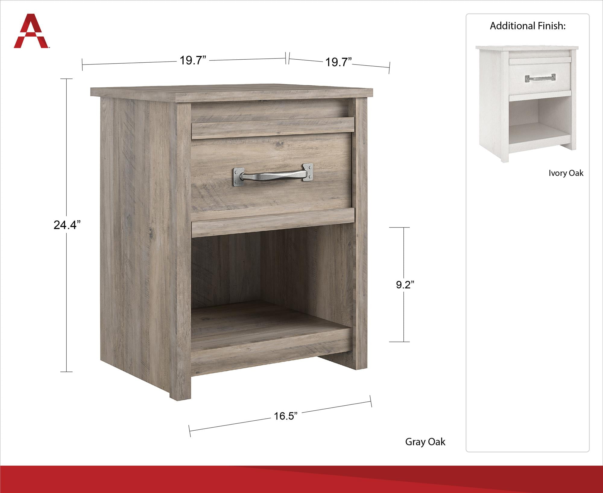 Add a rustic touch to your bedroom with the Ameriwood Home Bassinger Nightstand. The nightstand combines a textured distressed gray and brown woodgrain finish on laminated particleboard and MDF with a pewter handle to give your bedroom a sleek and updated look that fits any decor. Along with a great place to put a reading lamp or alarm clock, the nightstand also features a drawer where you can store reading glasses, pens and paper, or your cell phone. A small cubby at the bottom of the stand is a handy space to keep your books and magazines. Each Nightstand ships flat to your door and requires assembly upon opening. Two adults are recommended for proper assembly. The top shelf and bottom cubby can hold up to 40 lbs. and the drawer can hold 15 lbs. Assembled dimensions are 24.37″H x 19.69″W x 19.69″D.