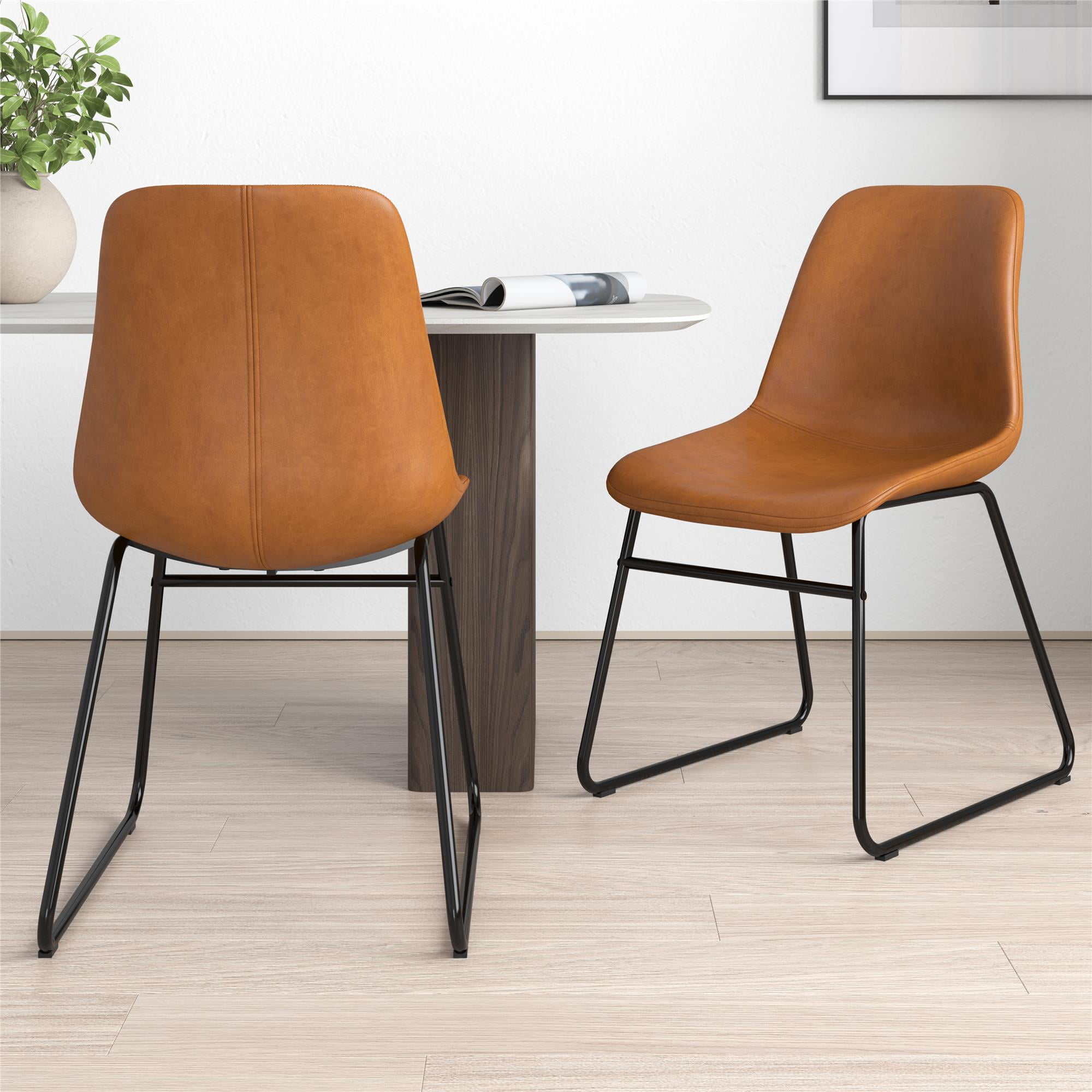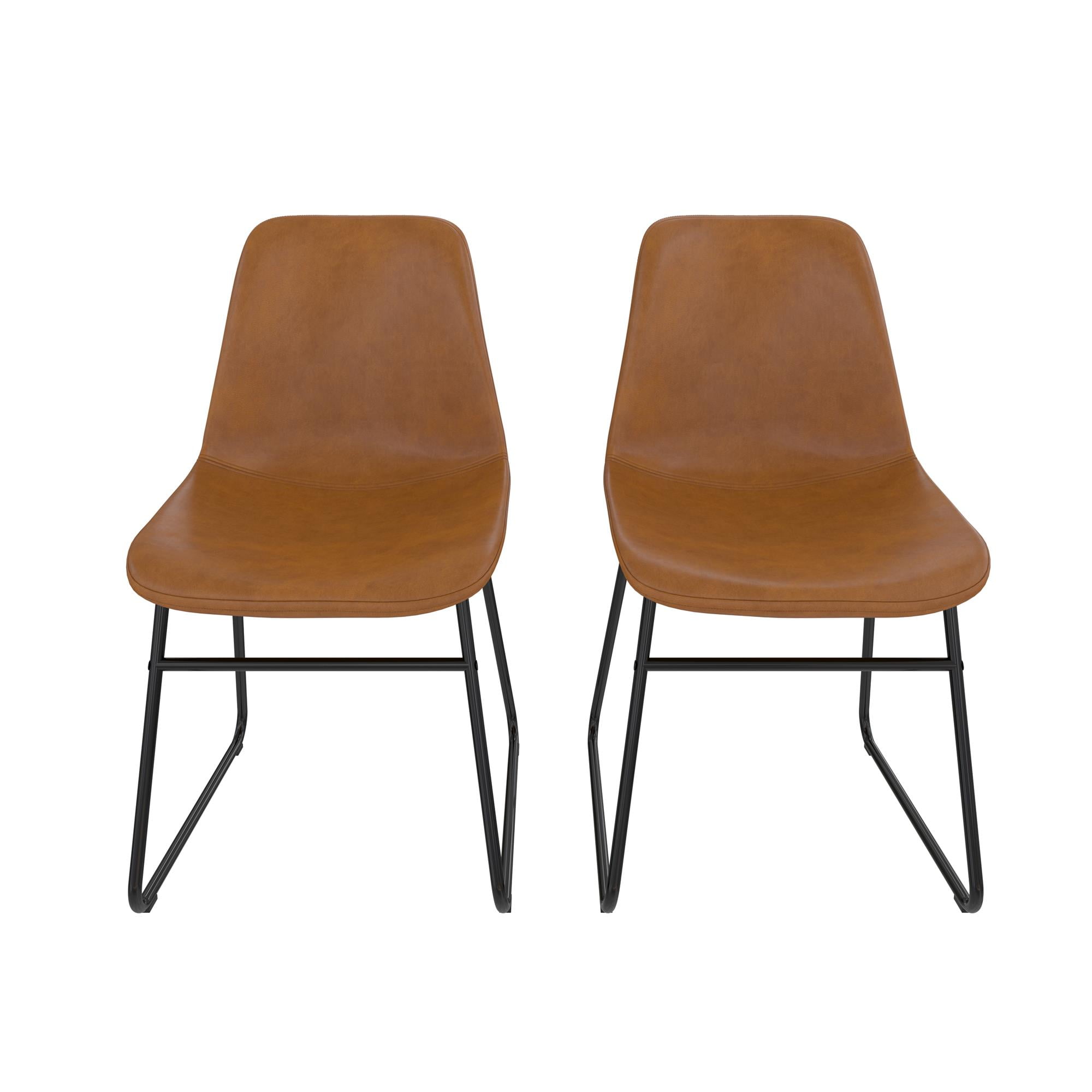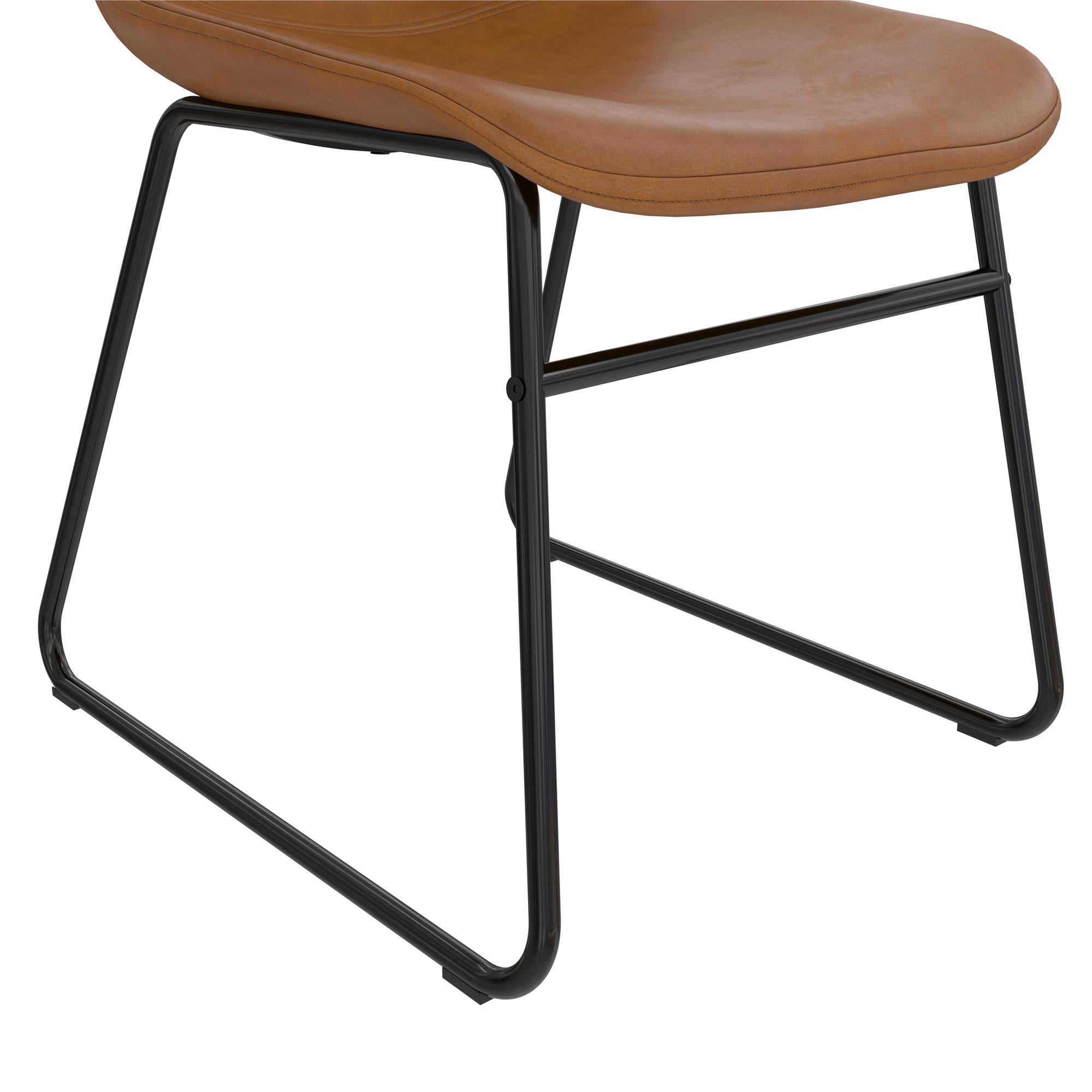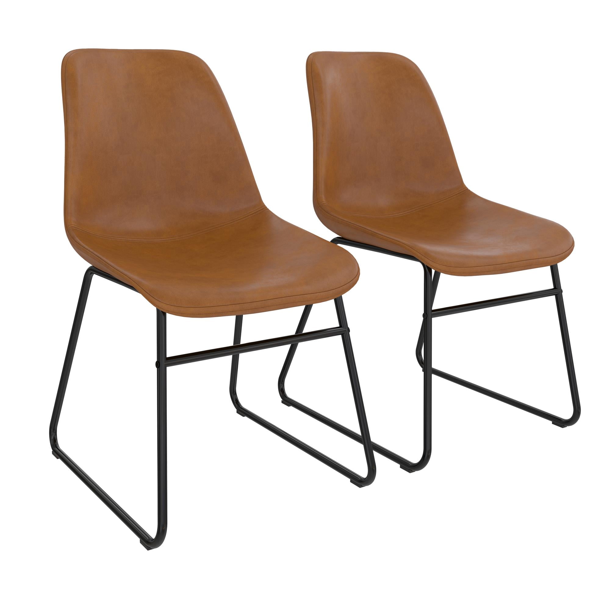 SIT & CHAT: Your dining table looks lonesome – make it the social hub it was meant to be with a modern industrial set of 2 dining chairs that bring practical style to your dining room and kitchen spaces for eating, drinking, and engaging with friends CASUAL COMFORT: Foam padded for a slightly cushioned feel, the molded scoop seat adapts to the curves of your body for reliable support while the low-profile backrest lets you lay back. Perfect as living room or entertainment area side accent chairs STURDY DESIGN: Upholstered in richly warm camel faux leather upholstery, the seating is made from a robust wood frame and rests on top of a durable steel metal sled base in a classic black finish that is powder-coated to resist rust and corrosion FAST ASSEMBLY: Ships in one easy to handle box with all parts, tools, and instructions included for quick assembly in under 15 minutes. Gliders beneath the legs make it easy to pull up a seat without damaging floors. Each set sold separately COMPACT SIZE: Dining chair dimensions: 18″L x 24″W x 33″H. Seating dimensions: 17″W x 18″D x 17.5″H. Weight Limit: 250 lbs. Net weight (each chair): 14 lbs. 1-year limited warranty. Matching stool available (not included). Gently wipe clean