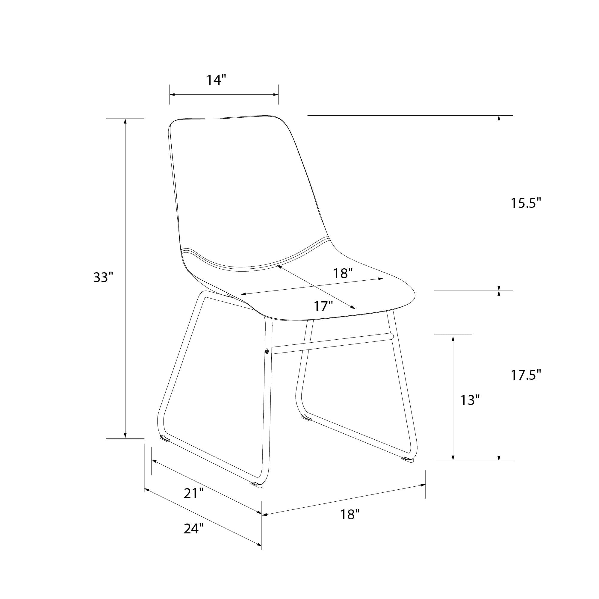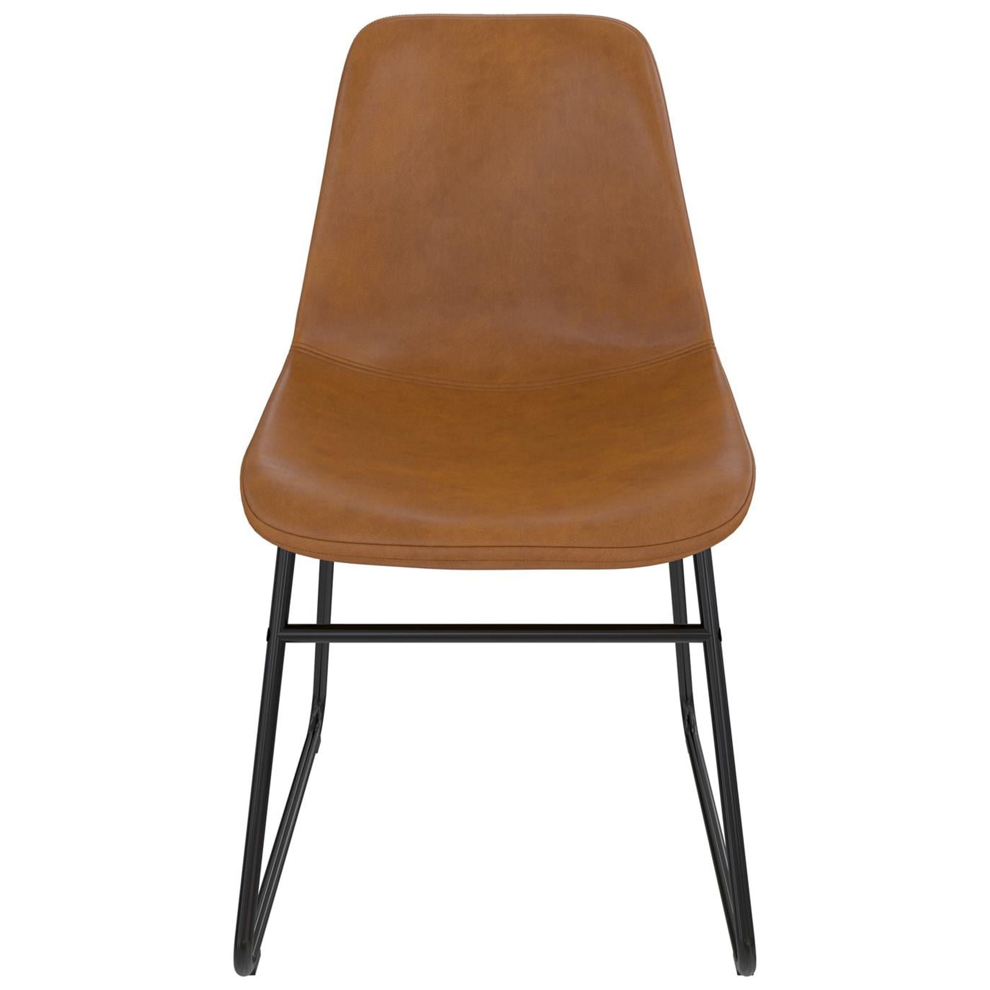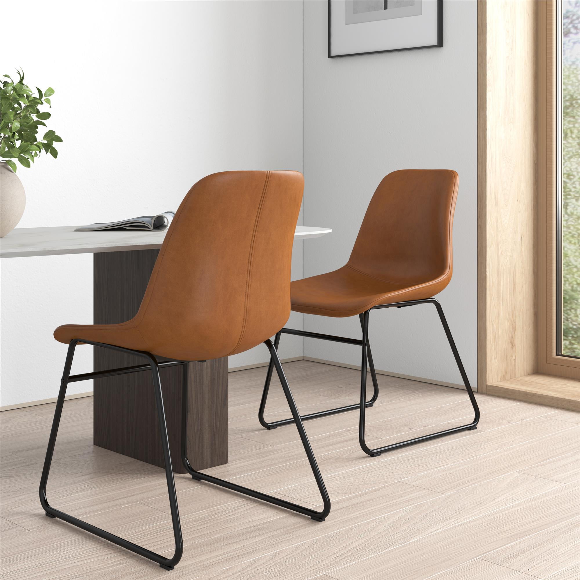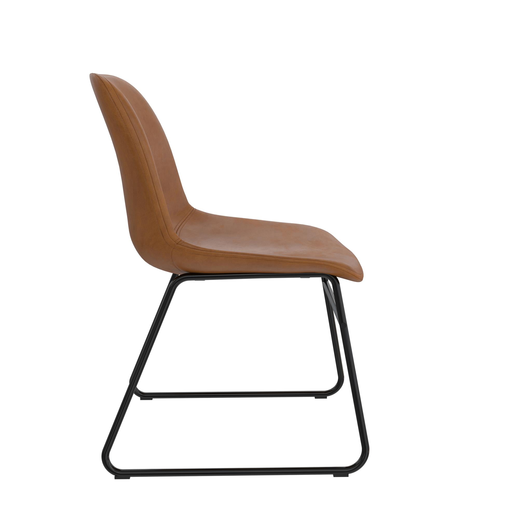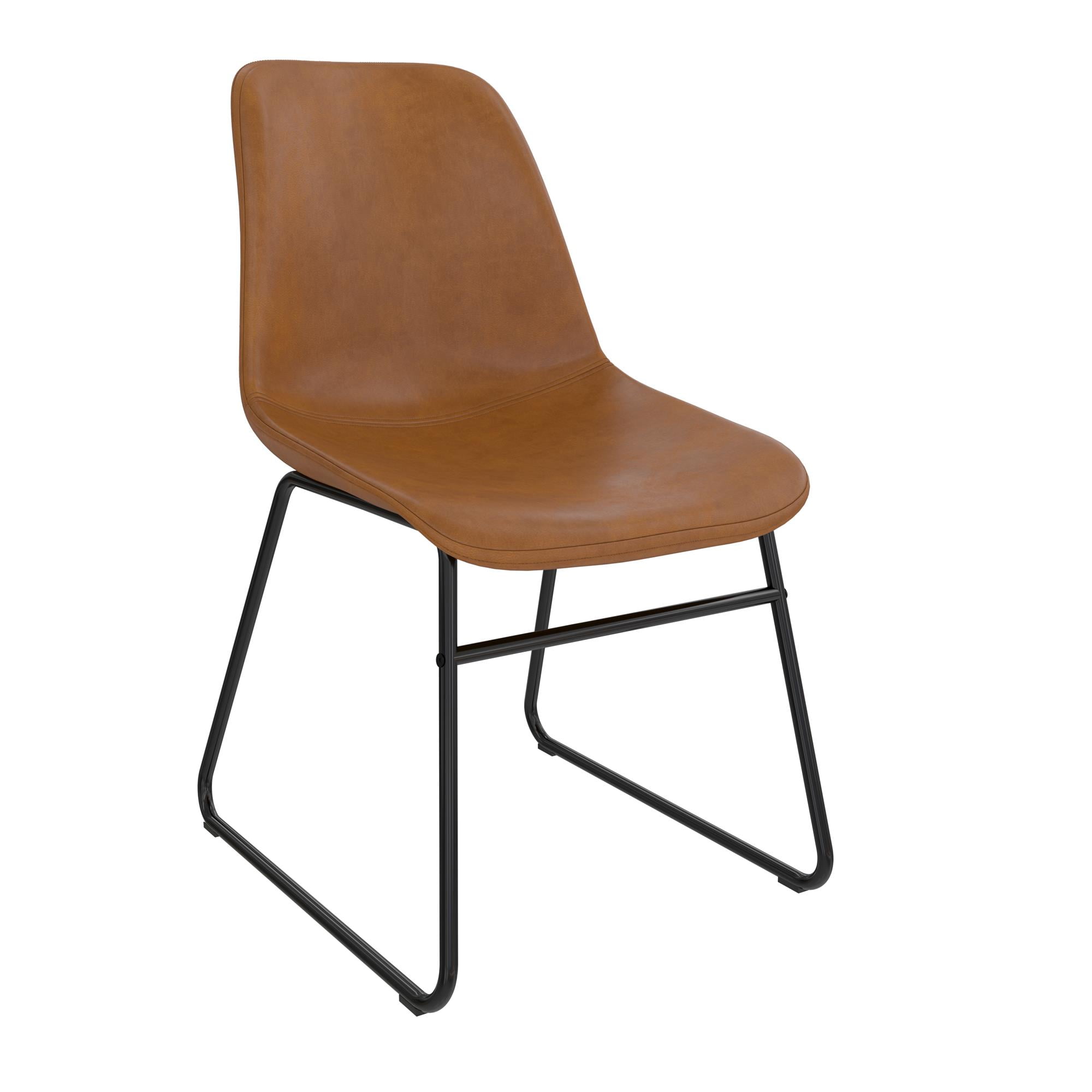 SIT & CHAT: Your dining table looks lonesome – make it the social hub it was meant to be with a modern industrial set of 2 dining chairs that bring practical style to your dining room and kitchen spaces for eating, drinking, and engaging with friends CASUAL COMFORT: Foam padded for a slightly cushioned feel, the molded scoop seat adapts to the curves of your body for reliable support while the low-profile backrest lets you lay back. Perfect as living room or entertainment area side accent chairs STURDY DESIGN: Upholstered in richly warm camel faux leather upholstery, the seating is made from a robust wood frame and rests on top of a durable steel metal sled base in a classic black finish that is powder-coated to resist rust and corrosion FAST ASSEMBLY: Ships in one easy to handle box with all parts, tools, and instructions included for quick assembly in under 15 minutes. Gliders beneath the legs make it easy to pull up a seat without damaging floors. Each set sold separately COMPACT SIZE: Dining chair dimensions: 18″L x 24″W x 33″H. Seating dimensions: 17″W x 18″D x 17.5″H. Weight Limit: 250 lbs. Net weight (each chair): 14 lbs. 1-year limited warranty. Matching stool available (not included). Gently wipe clean