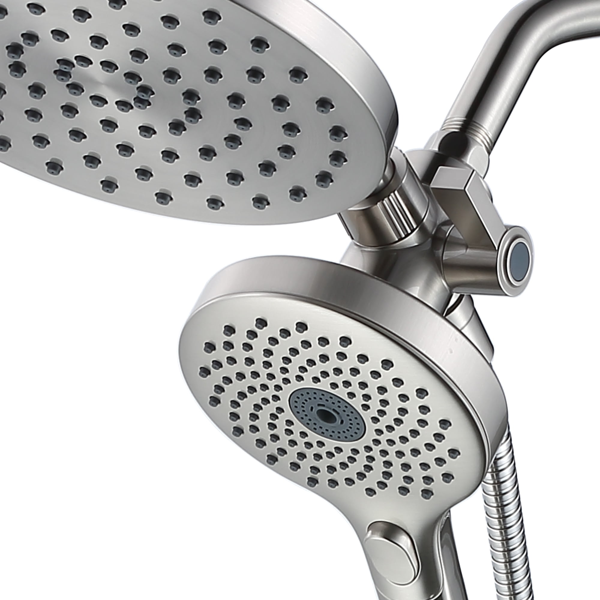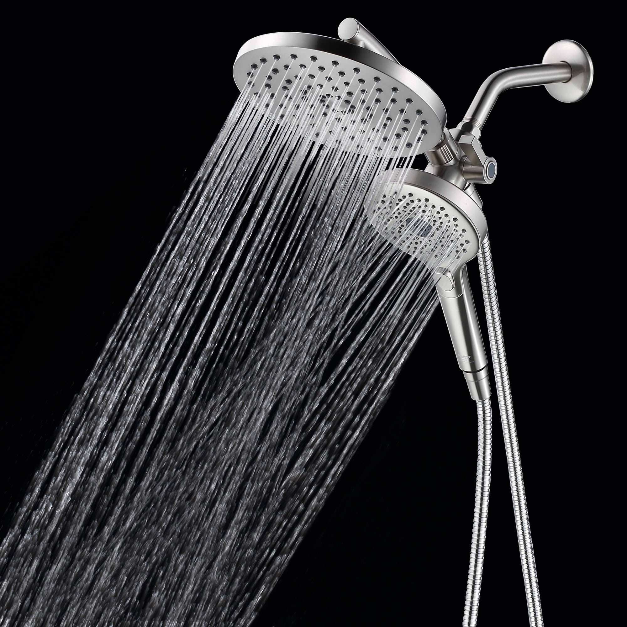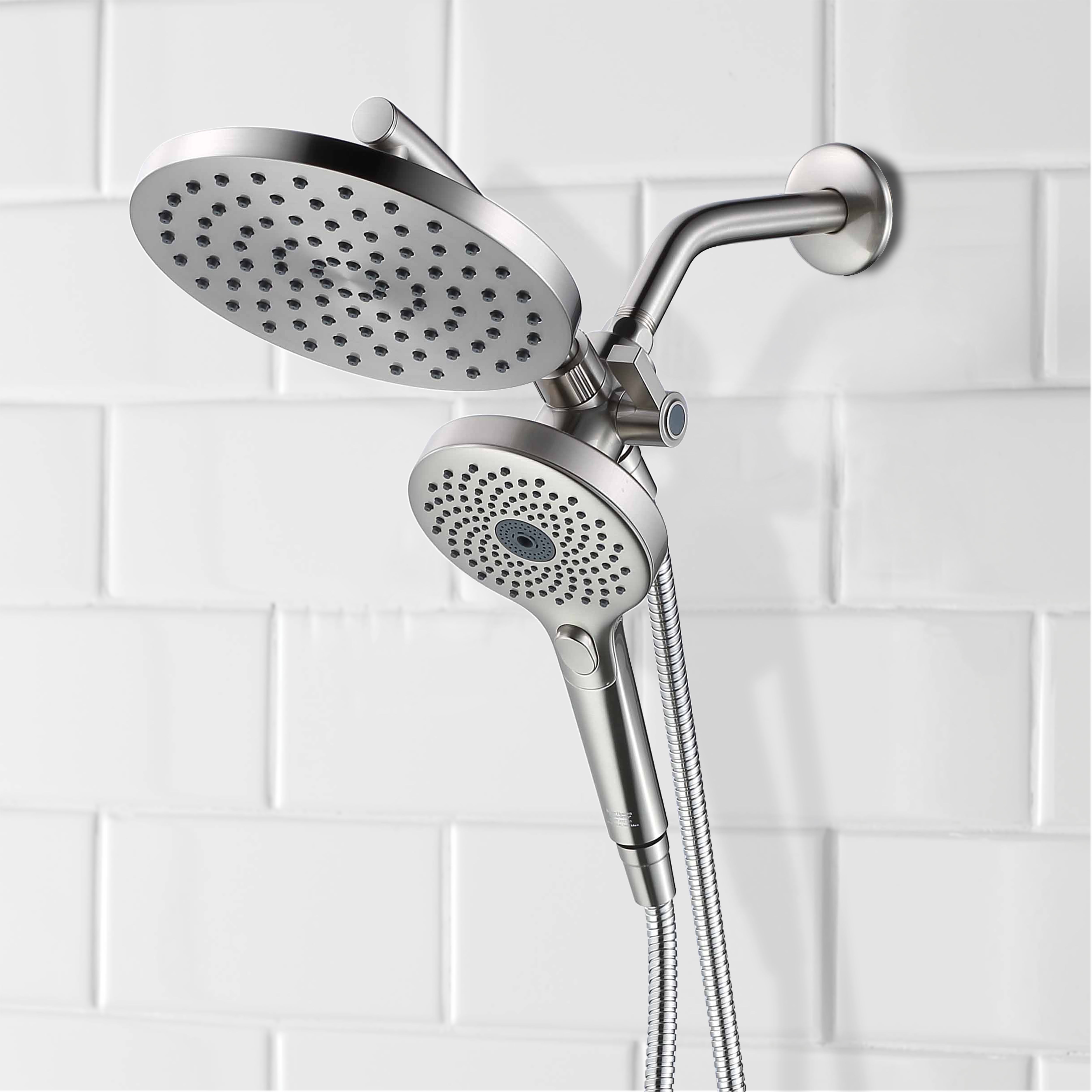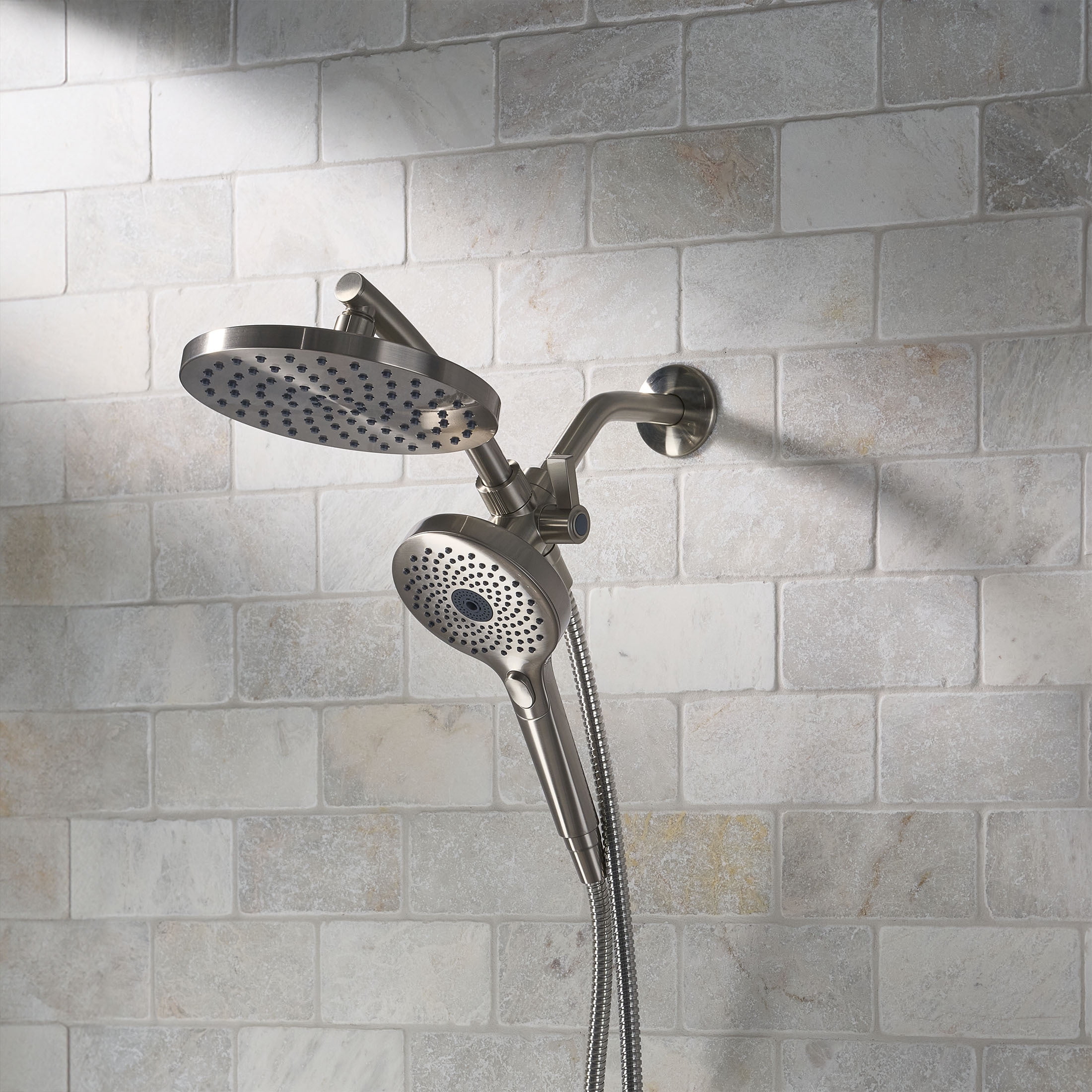 Magnetic docking for secure and convenient use Replaces most standard showerheads, mounting to existing shower arm Contemporary design for a stylish upgrade Large 8” high pressure showerhead with 1.8GPM flow rate Three-function diverter allows you to run both showerheads together or independently Hand shower with push button control featuring full spray, pulse spray, and power spray for high pressure cleaning