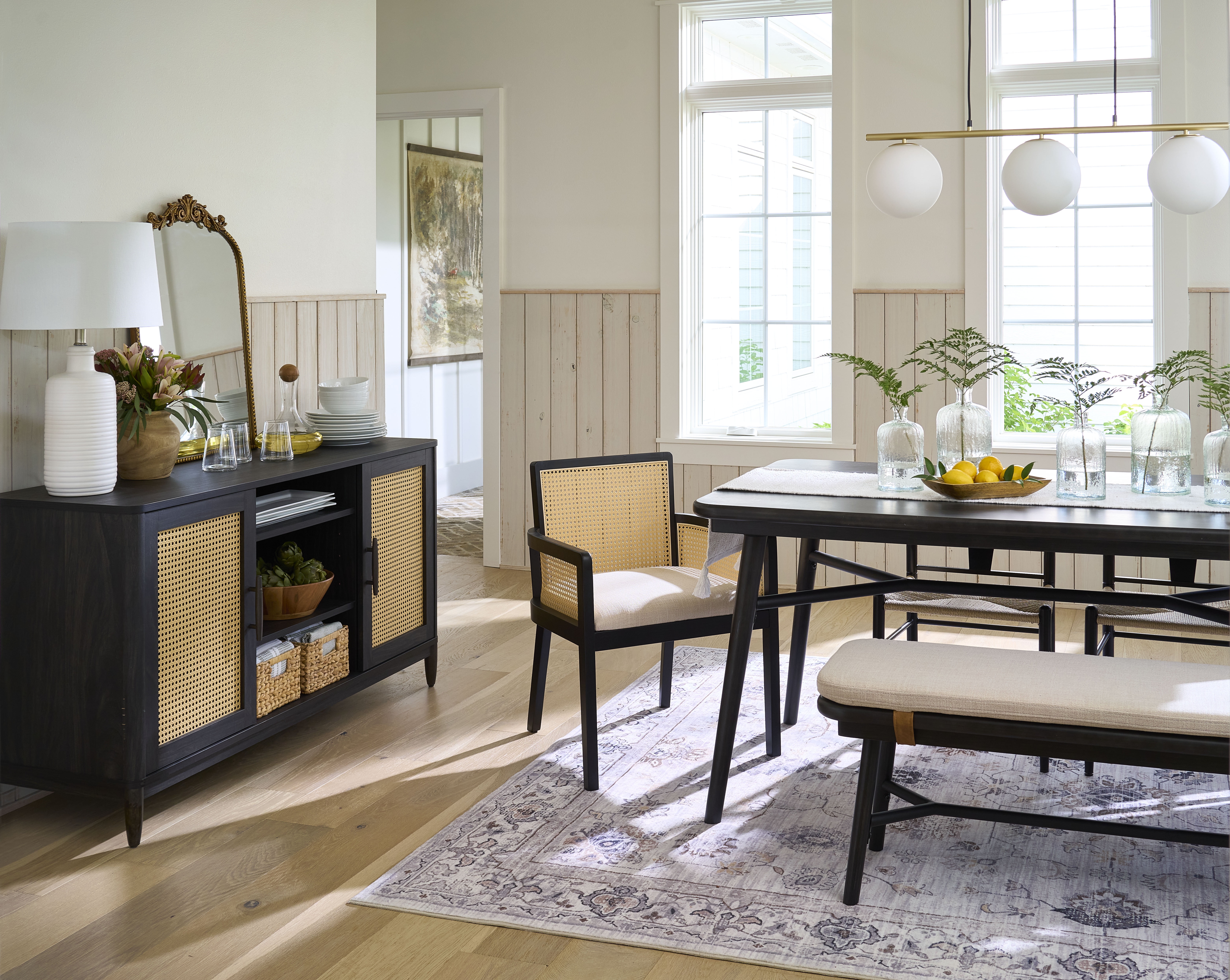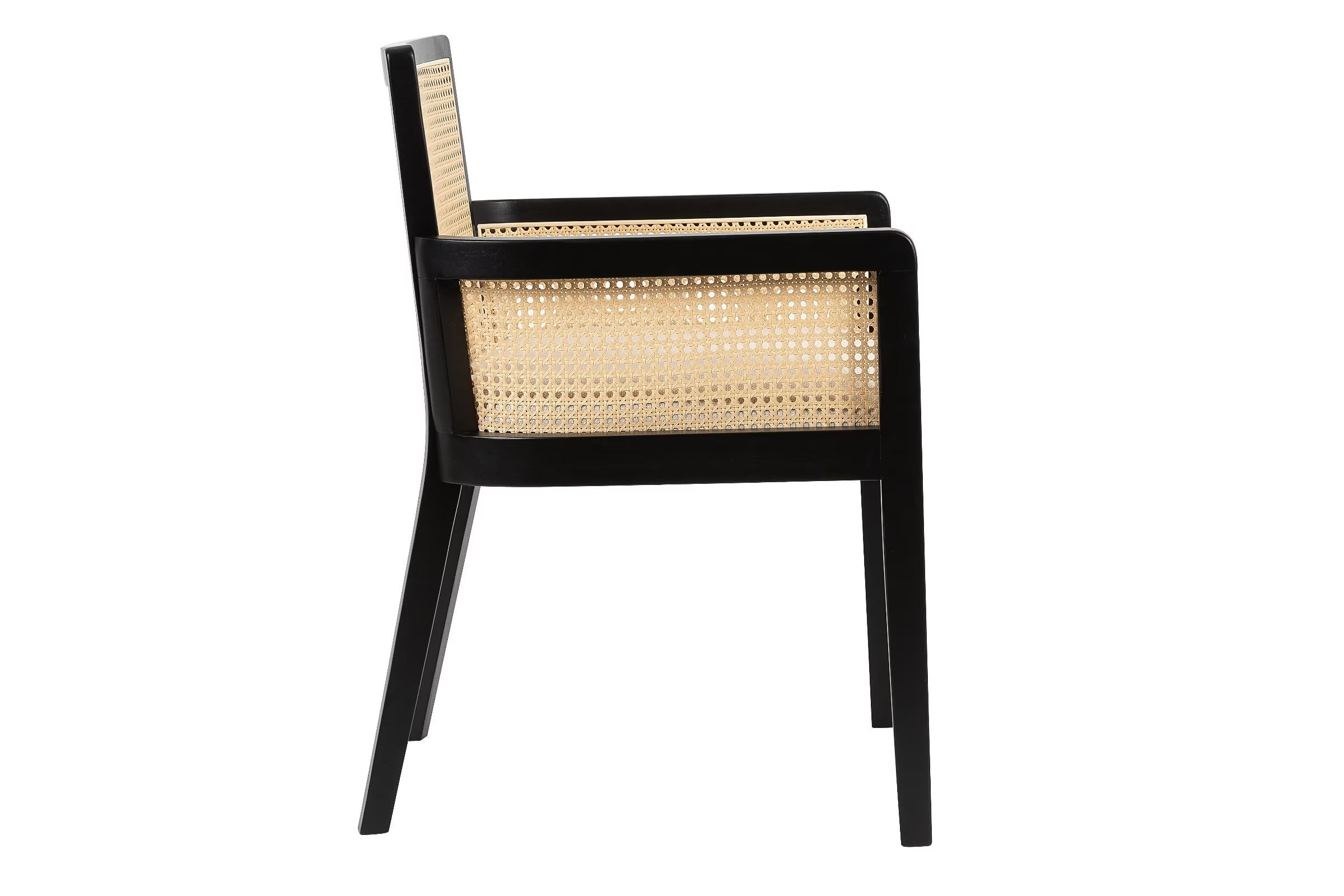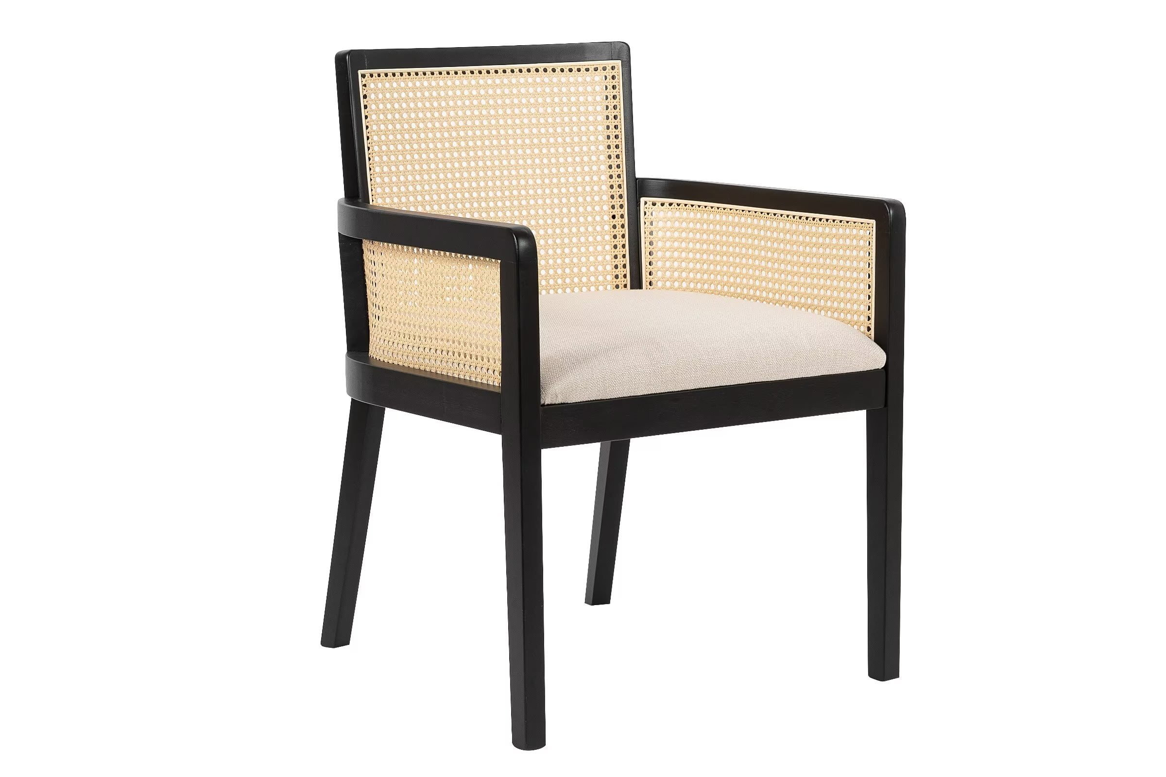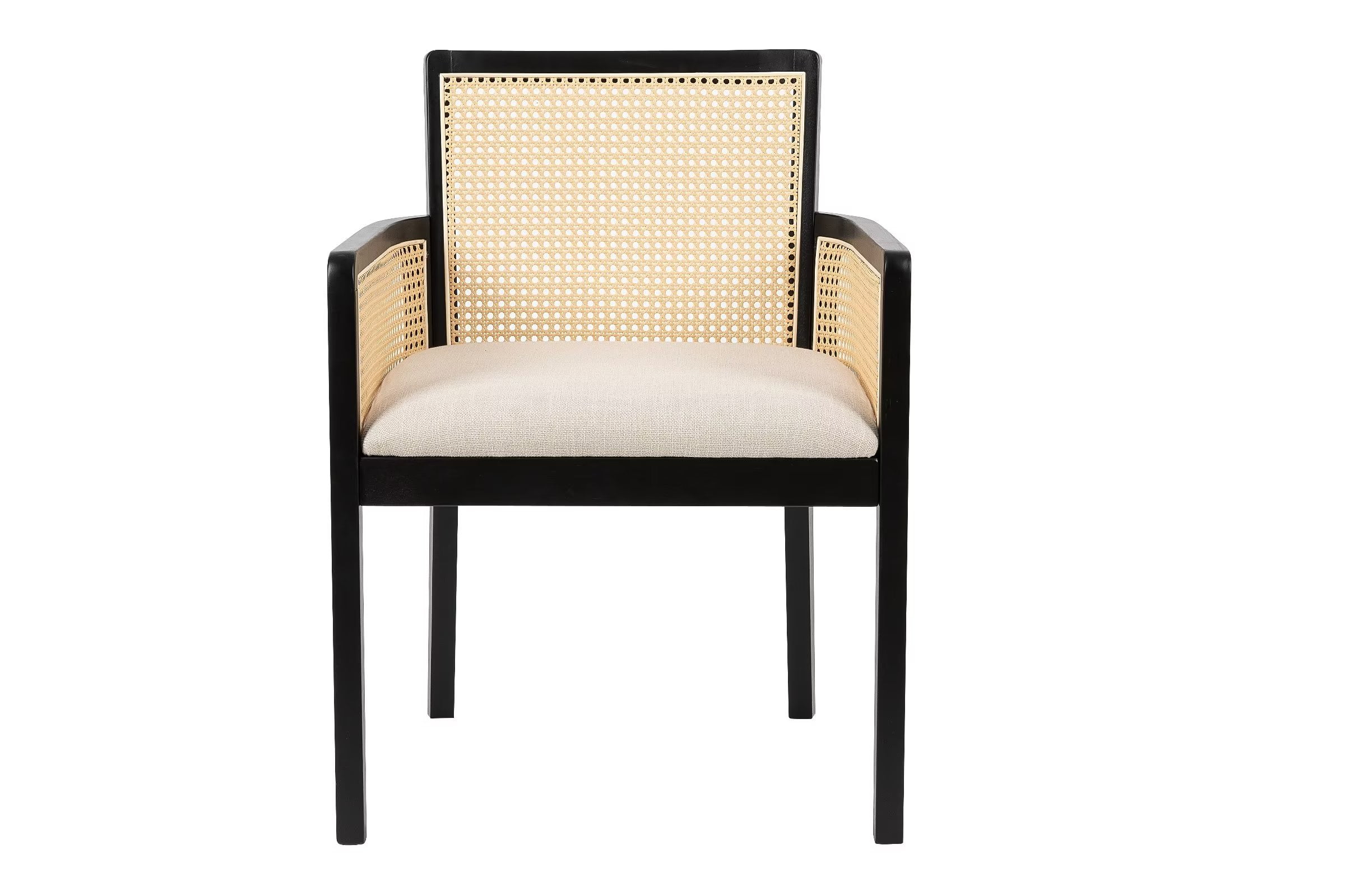 The set of 2 Better Homes & Gardens Springwood Caning Captains Dining Chairs adds style and function for your dining room, kitchen, or home office. A blend of comfort and design, the rattan back and armrest sides add a trendy, mid-century modern to any space. The seat cushion is upholstered in linen-like, wipe-clean fabric, making care a breeze. The seat pad cushion is constructed of high-density foam and is made to last. The solid wood seat base offers stability and support. The organic rattan texture adds a natural element, blending with the charcoal black wood legs and linen cushion for simply stated refinement. It’s easy to assemble and ready to use in minutes.