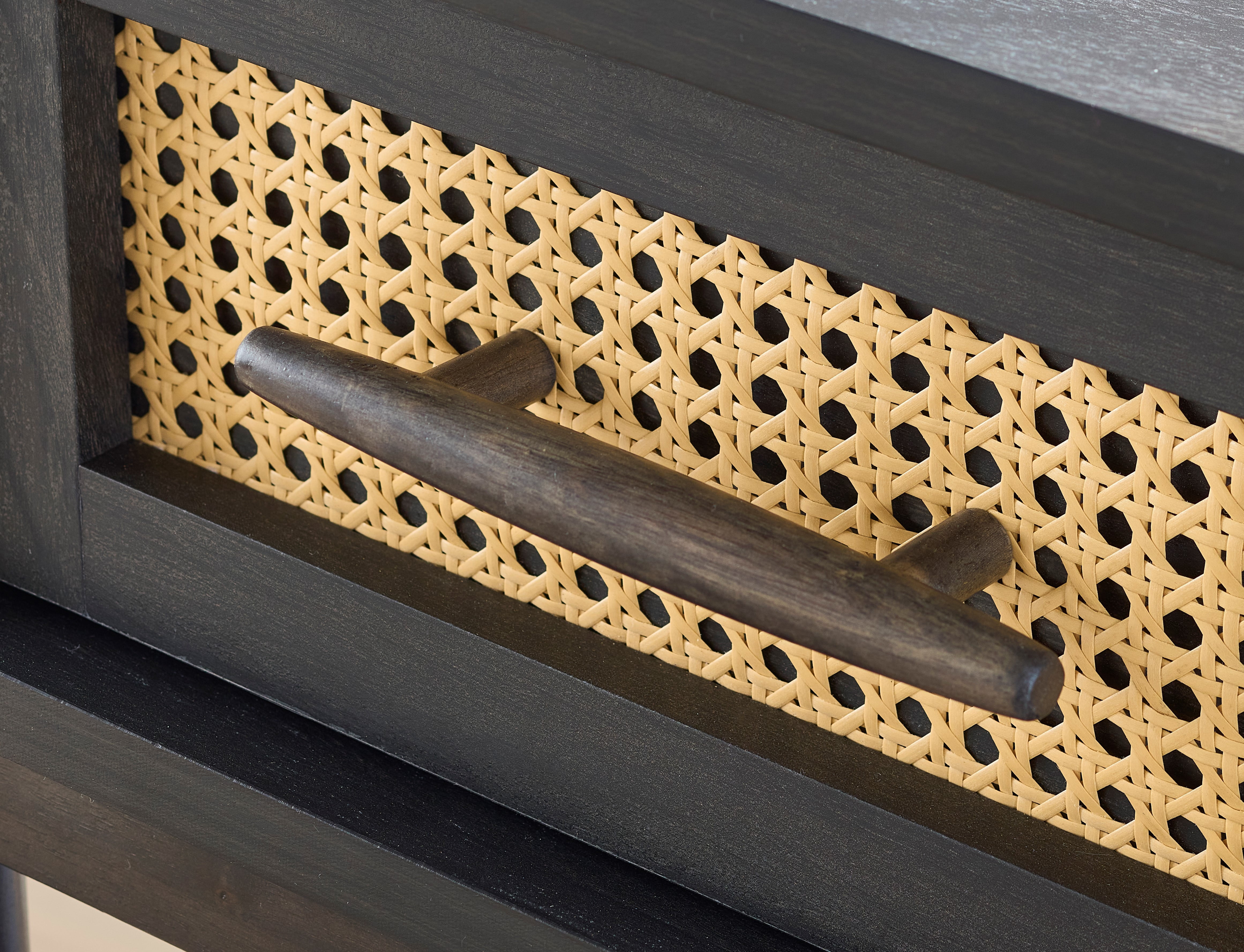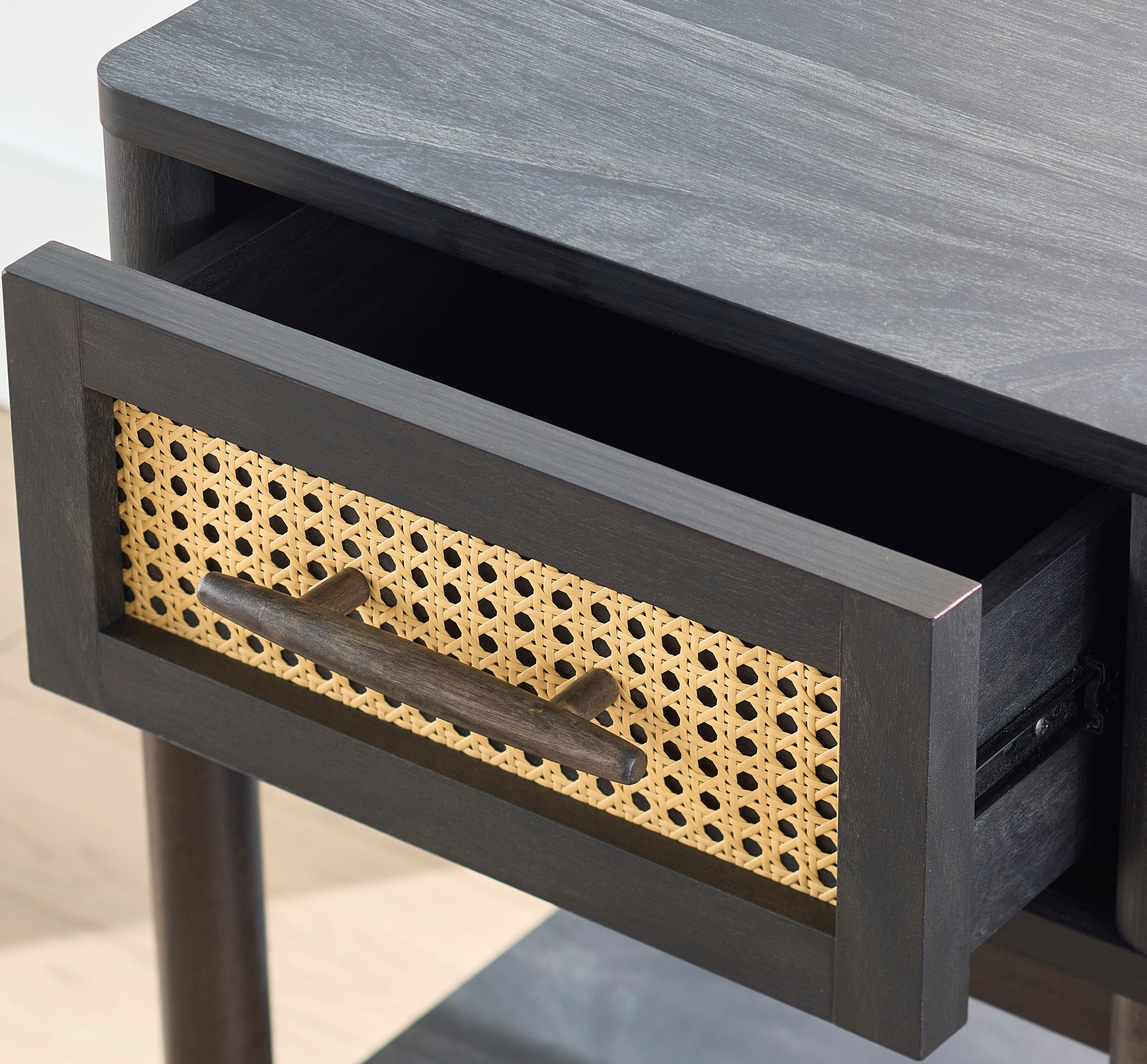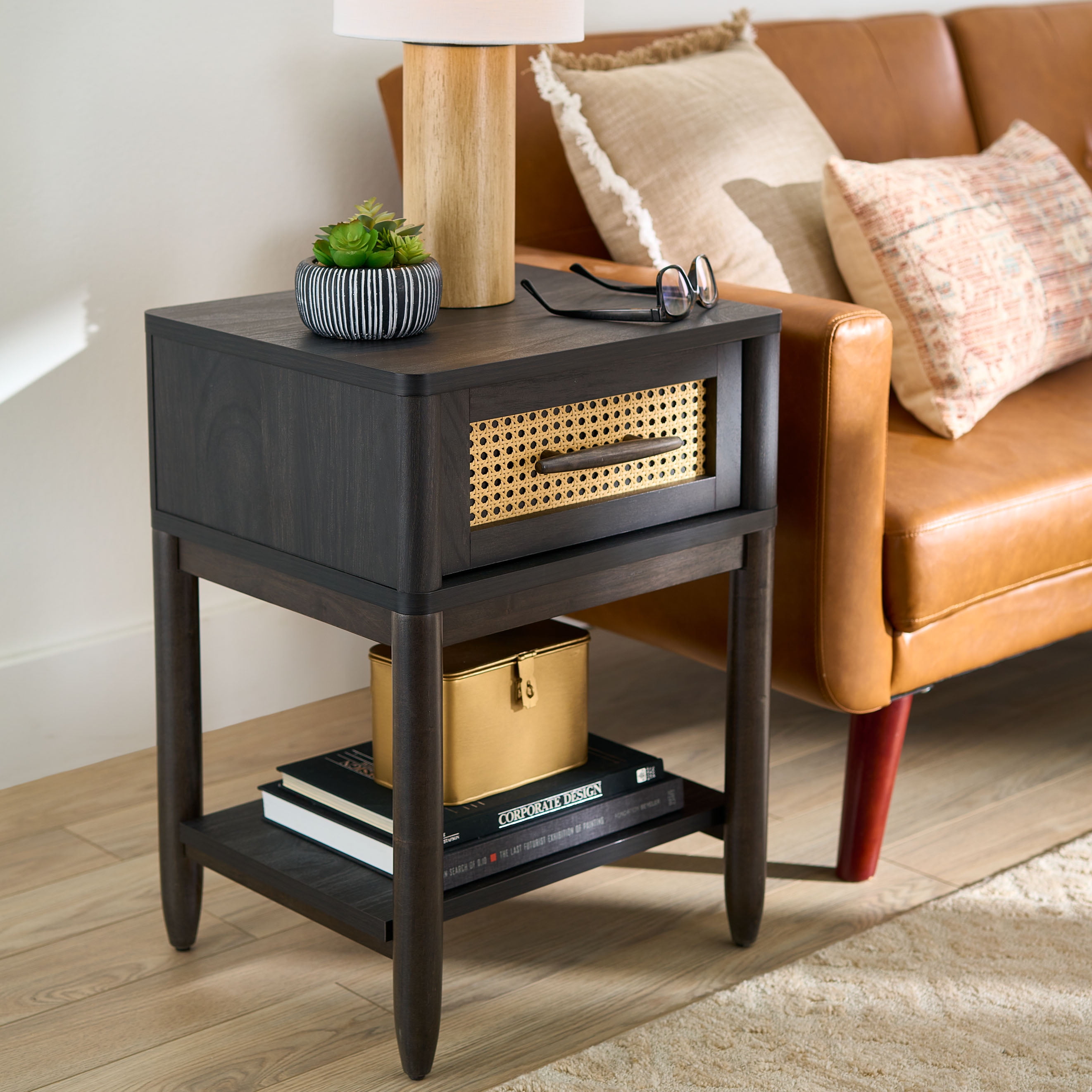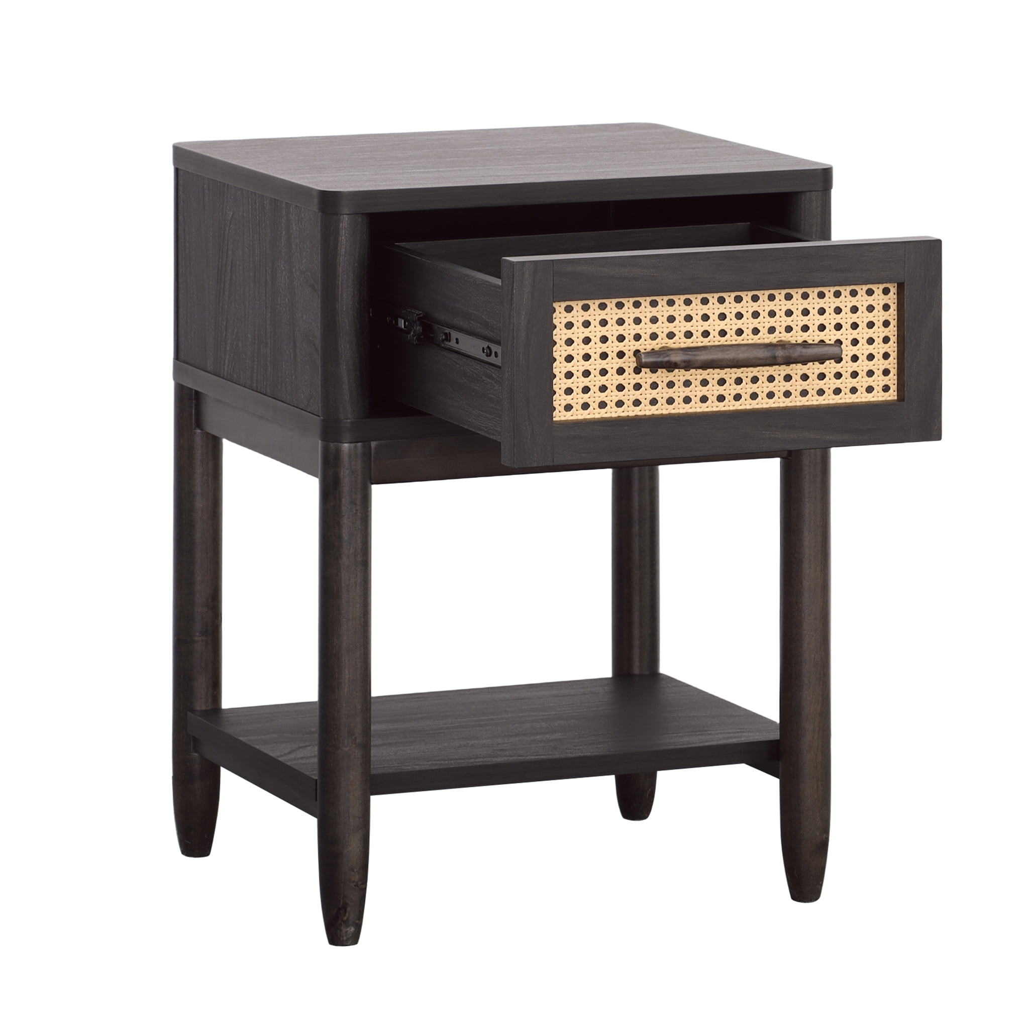 Give your home a touch of elemental beauty with this versatile and modern single drawer nightstand from the Better Homes & Gardens® Springwood collection. Finished in a dark, neutral Charcoal and accented with a decorative faux rattan drawer front, this trendy nightstand with open storage is everything you need beside you. Bringing sophistication and convenience to the bedside, there’s plenty of room for an alarm clock. This petite, 1 drawer nightstand has a spacious top surface providing plenty of room for must-have items like an accent lamp, smart phone, photos, or a refreshing beverage too. The mid-century modern style of this nightstand with open shelf doubles as an end table as well, making the perfect sofa-side companion for keeping beverages and books within arm’s reach. It features a large storage drawer that opens and closes on smooth metal runners for easy access storage of miscellaneous items like reading glasses, the TV remote, tissues or collection of crossword puzzles. This bedside table with drawer also includes an open bottom shelf for additional storage space. It is finished on all sides for versatile placement in the living room, bedroom, the entryway or standing alone on stylish tapered legs, as an accent piece. This black side table with contrasting natural caning is the perfect accent to any room.