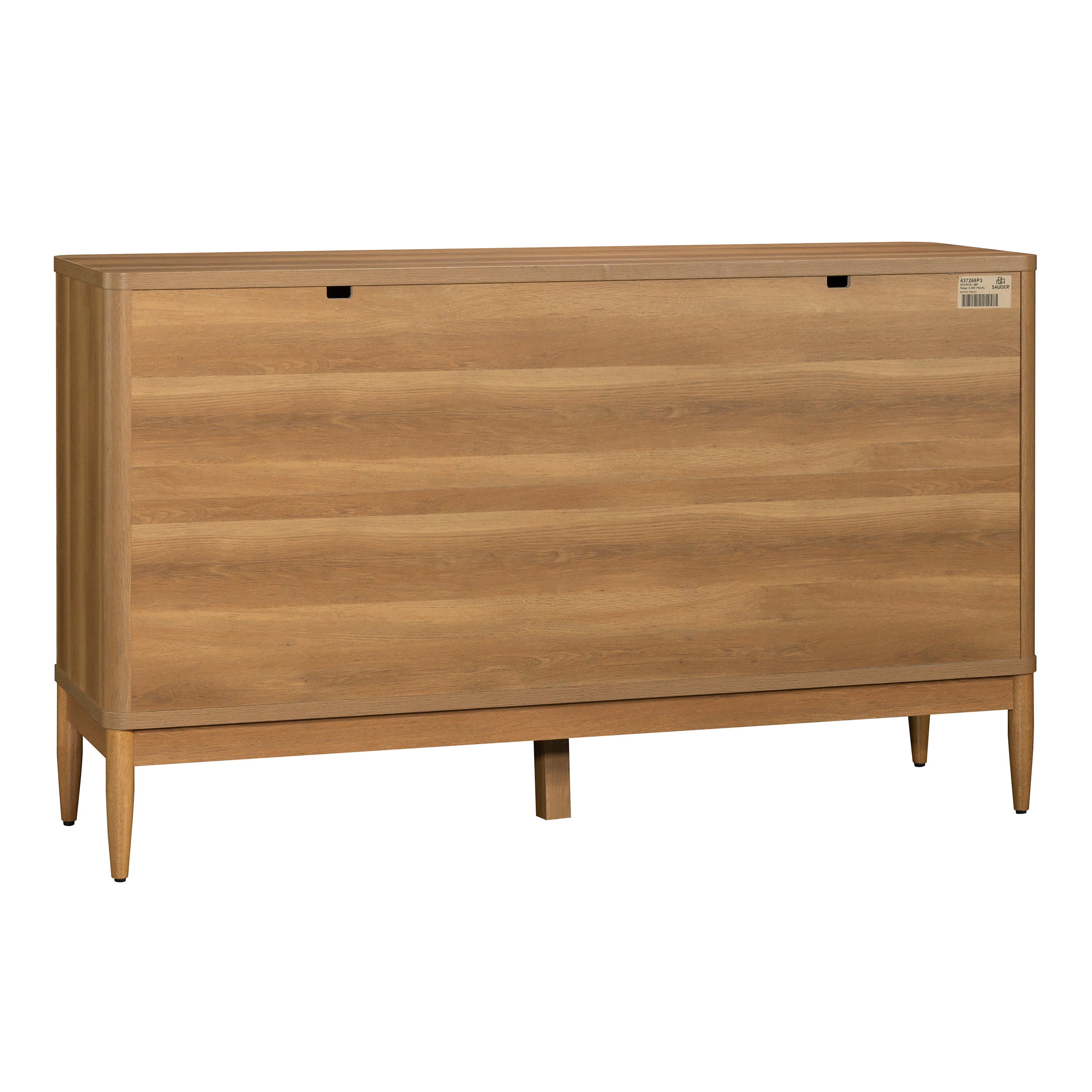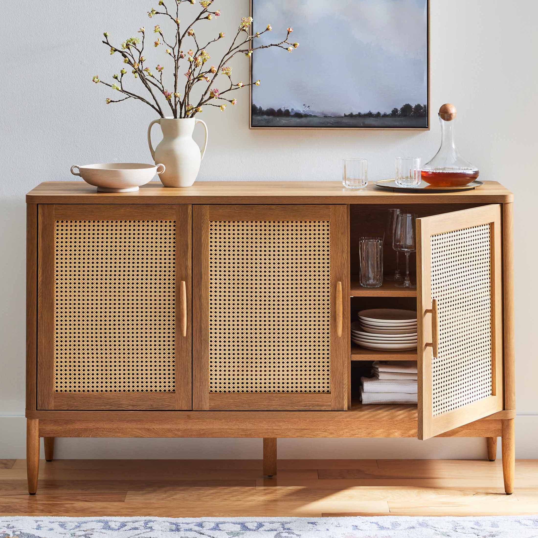 Upgrade the home entertainment experience with this stunning dining room buffet from the Better Homes and Gardens Springwood Caning Sideboard. Its durable 1″ thick top is built to withstand daily use, while the decorative rattan insert on the door fronts adds a touch of tropical style. Ample storage space lies behind the three doors, with two adjustable shelves behind each door for versatile storage of dining room or living room essentials. Solid wood feet and adjustable levelers of this dining room hutch ensure that this living room storage cabinet stands firmly on any surface. With the ability to hold up to a 65-inch TV weighing up to 70 lbs, this rattan living room cabinets a versatile choice for multiple rooms. The Light Honey finish is neutral yet elegant, making this rattan entertainment credenza an ideal choice for blending into any décor. Whether used as a piece of furniture for daily use or a statement piece, this versatile Better Homes and Gardens Springwood Caning Sideboard is ready to entertain guests or store a variety of home goods.