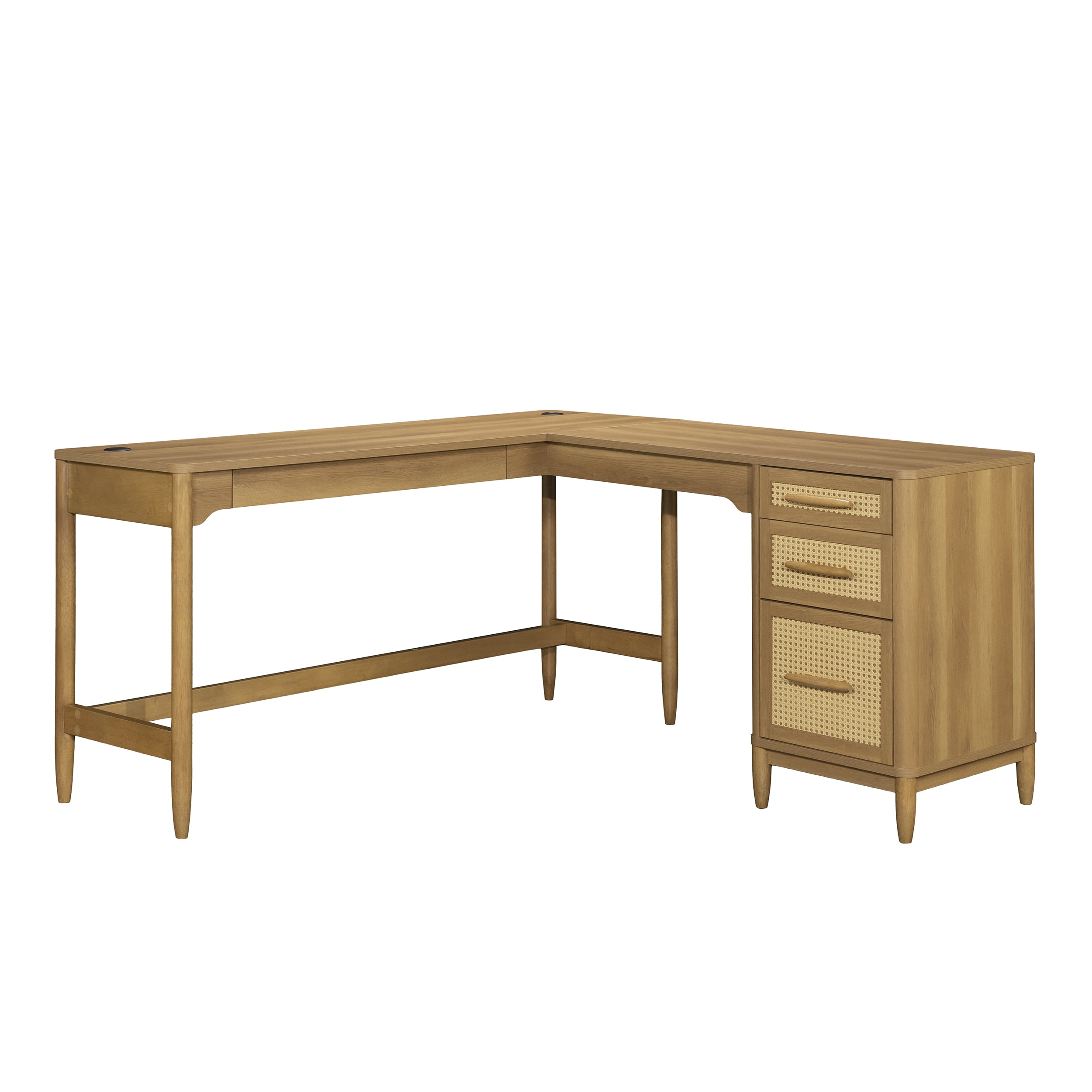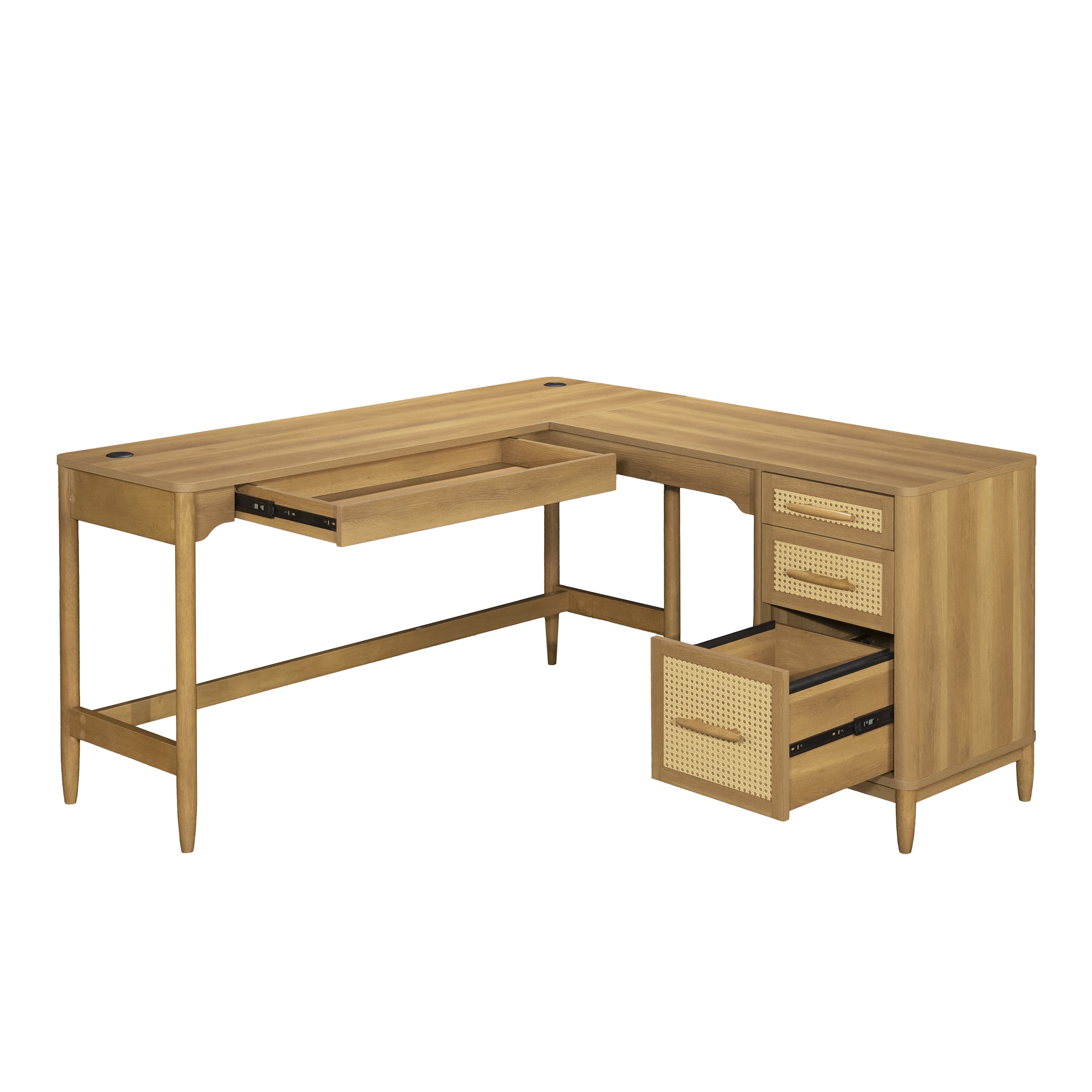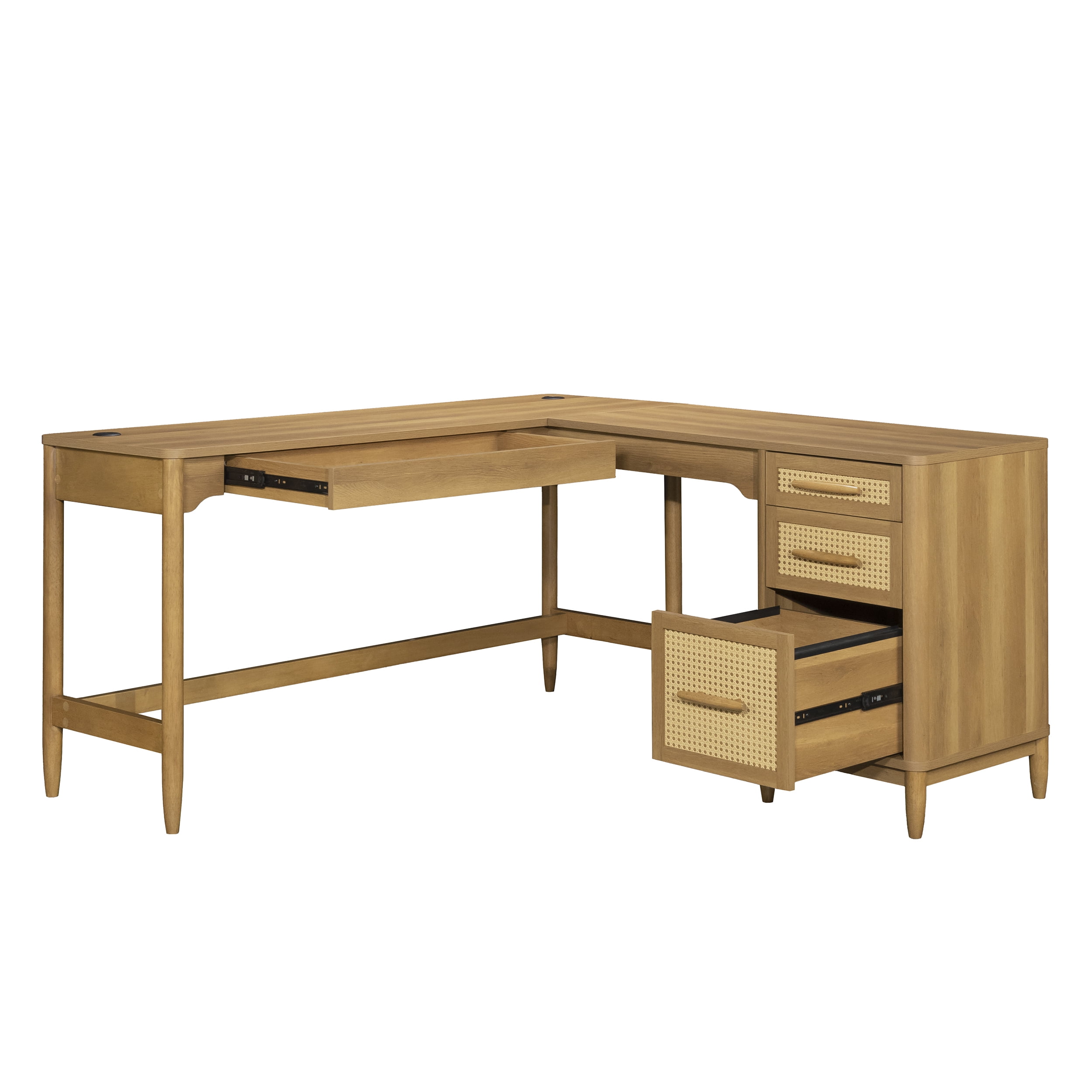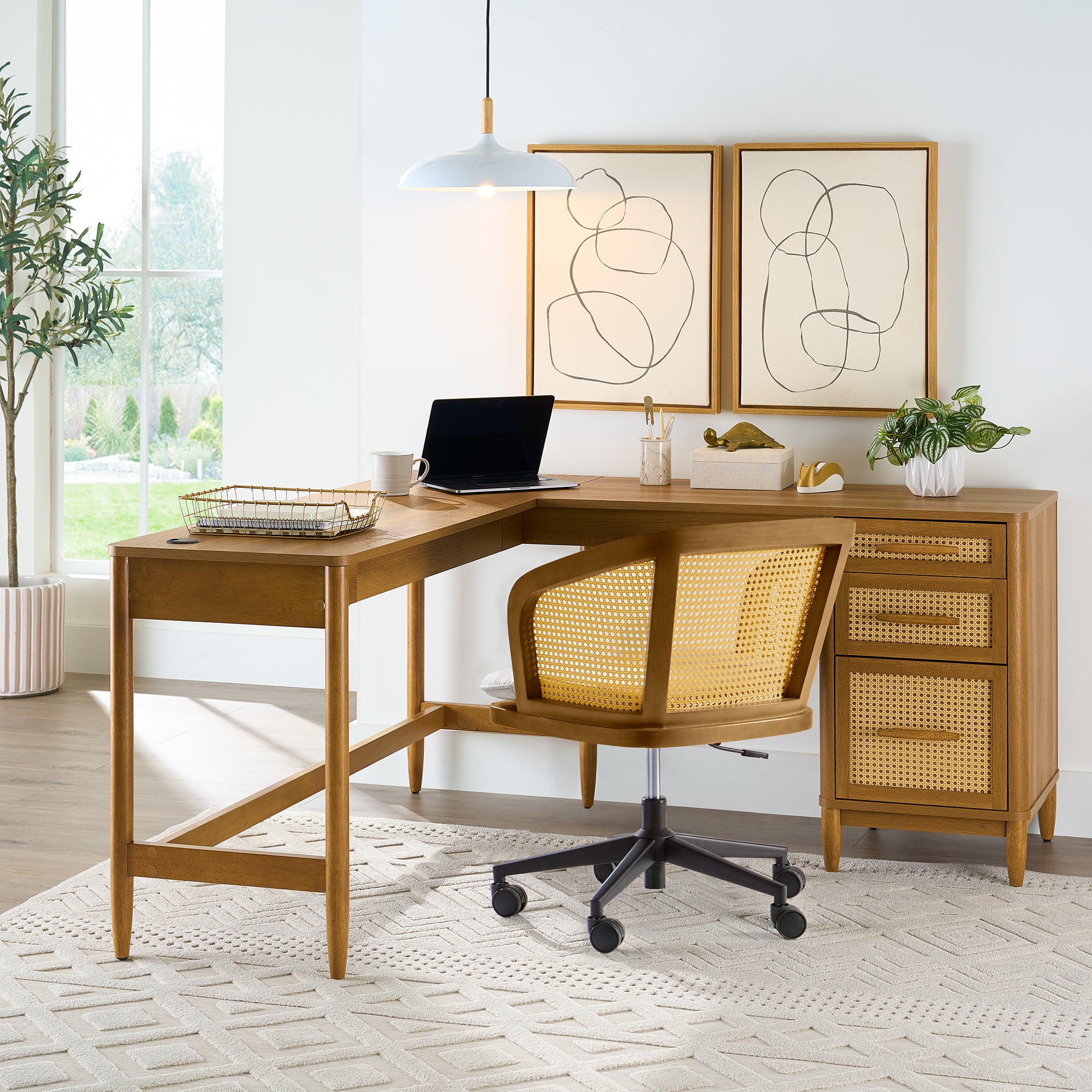 When it comes to a home office desk, we all want the perfect blend of style and functionality. The Better Homes and Gardens Springwood L-Shape Desk delivers just that. This desk with drawers offers a spacious work surface with plenty of room for a computer and printer to binders, files, or various décor, ensuring office necessities are always within reach. Designed with practicality in mind, this writing desk features a pencil drawer to keep even the smallest office accouterments close at hand. It also boasts three drawers with full extension slides, and it has desktop grommet holes for seamless cord management. The bottom drawer holds letter-size hanging files. The corner desk’s island-inspired drawer fronts are adorned with rattan inserts, and behind them, is plenty of storage for files, paper, pens and more. Finished on all sides in a light honey color, this rattan L-shaped home office desk looks stunning from every angle, offering versatile placement options in the home office. Elevate your home office with the Better Homes and Gardens L-Shape Desk.