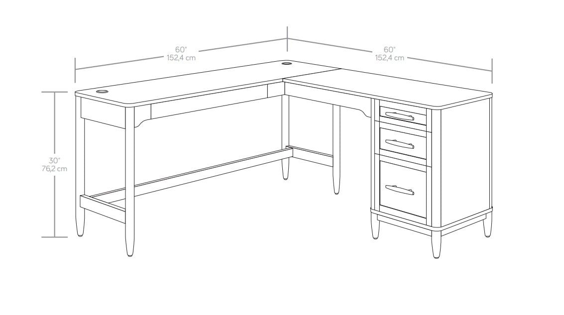 Assembled Dimensions: 60″ L X 60″ W X 30″ H Spacious work surface with room for everything from laptop to lamp Three drawers feature full extension slides; lower drawer holds letter-size hanging files making organization a breeze Drawer fronts feature decorative rattan insert for a touch of tropical style Desktop has two grommet holes for electrical cord access to reduce cord clutter Finished on all sides for versatile placement anywhere in the home or office Solid Rubber Wood Accents Charcoal finish Model #: 441378 Box Dimensions: 67.01″ L x 21.50″ W x 8.62″ H For additional questions or any issues, please contact the manufacturer at 1-800-523-3987. Be sure to check out the Better Homes & Gardens Springwood collection for more great items!