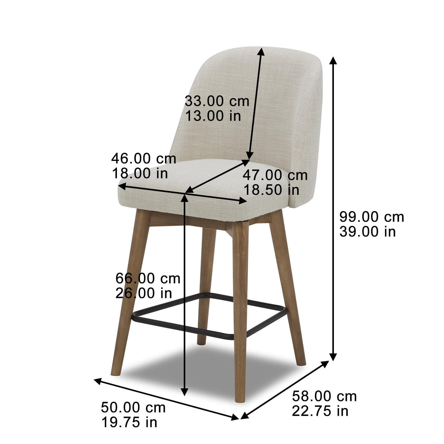 Modern Design with solid wood construction for stability and durability Functional and fashionable choice for a home bar, kitchen, or breakfast bar 360-degree swivel rotation with smooth rotation for optimal flexibility and convenience Easy-to-clean fabric Multiple finish choices: Light Honey and Charcoal Warm and inviting tone that complements various decor styles Easy assembly with easy-to-follow assembly guide for a quick and hassle-free setup Assembled Dimensions: 19.75″” W x 22.75″” D x 39″” H Product weight 12.45 lb