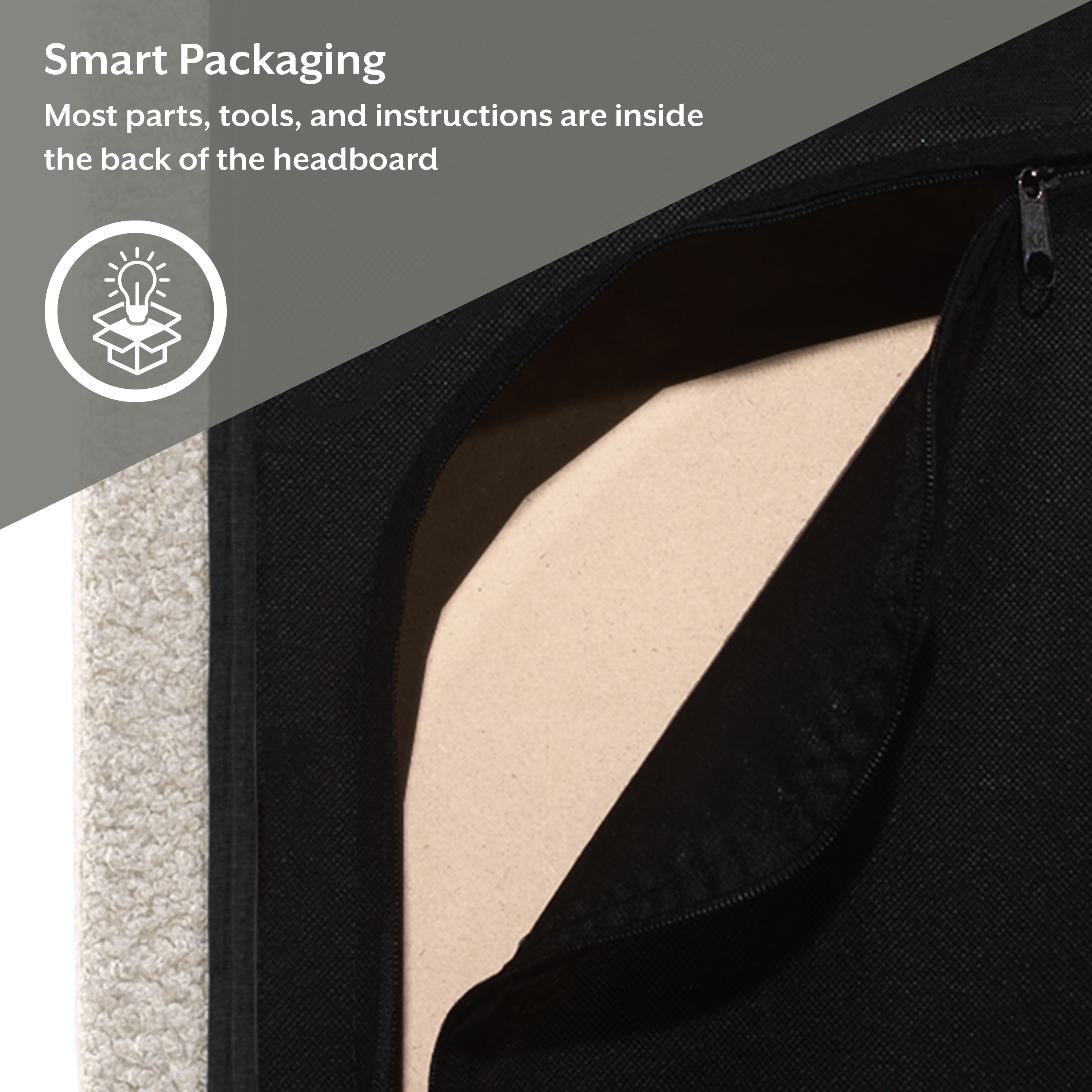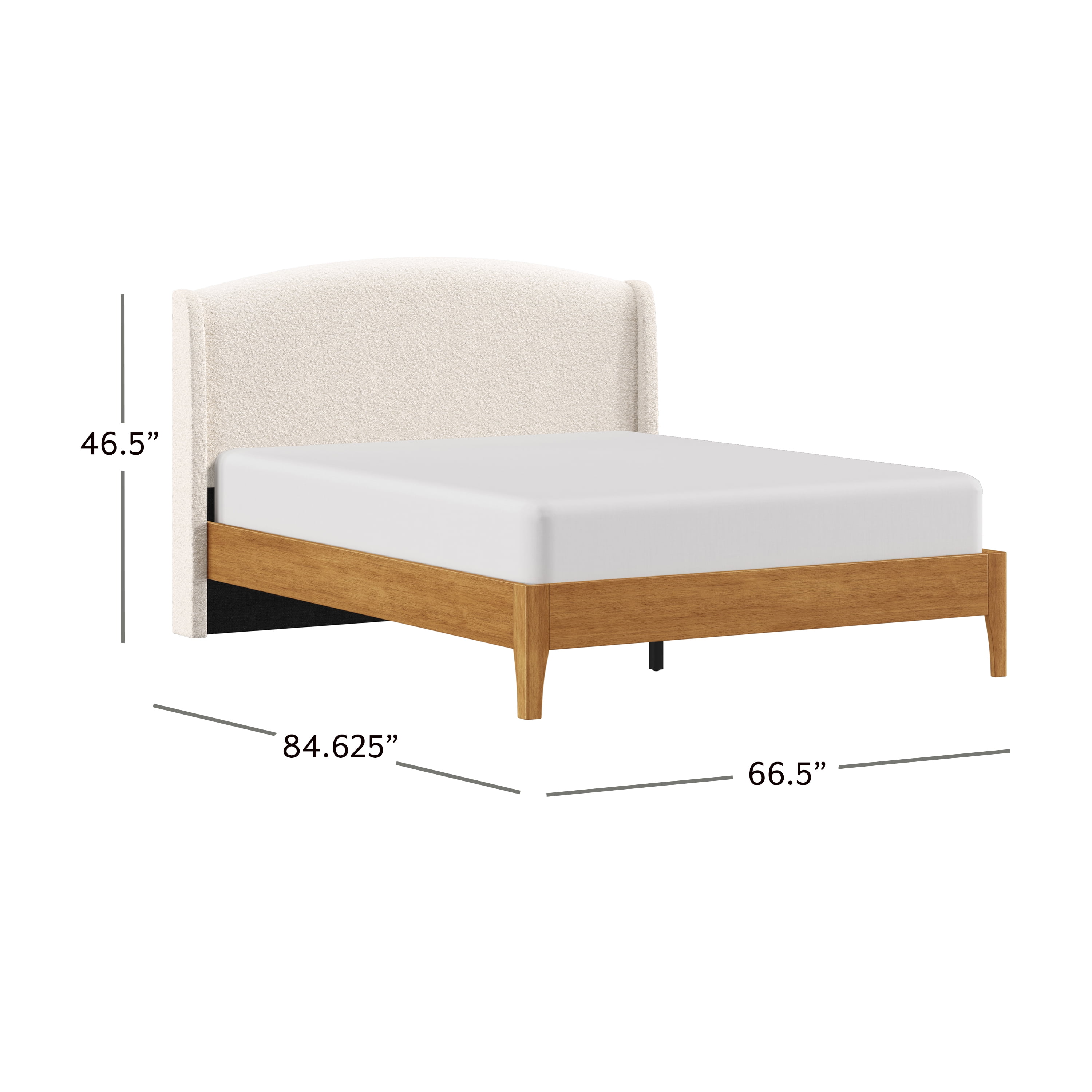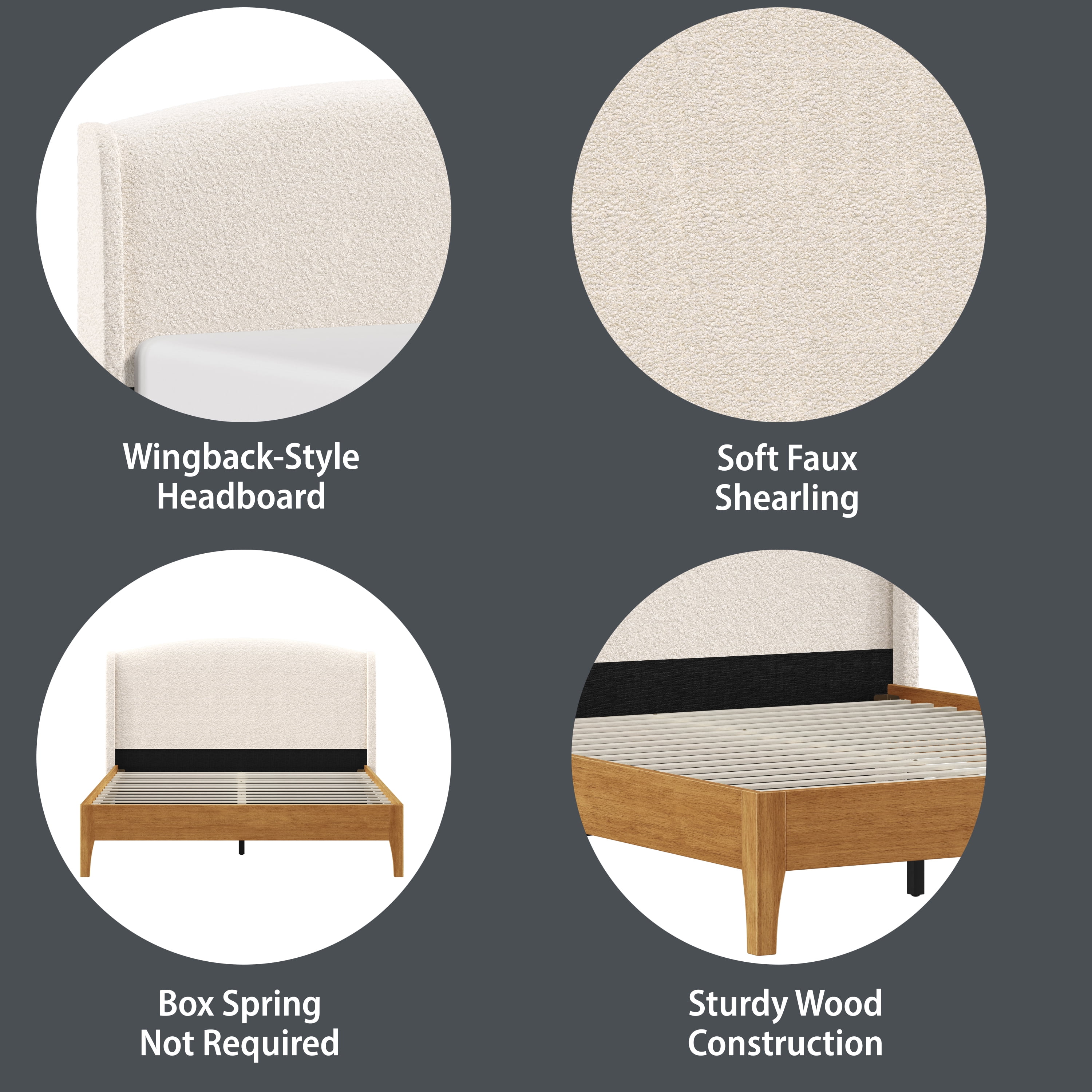 Sink back into the plush headboard of this queen platform bed, luxuriously upholstered in an oh-so-soft cream faux shearling. With an elegant wingback silhouette and a sleek wooden frame, this piece is as easy on the eyes as it is on your back as you take a moment to yourself after a long day. The arched shelter headboard joins the oak veneer-finished frame for an intriguing contemporary modern aesthetic. This adult platform bed doesn’t require a box spring. Mattress required; not included. Assembly required.