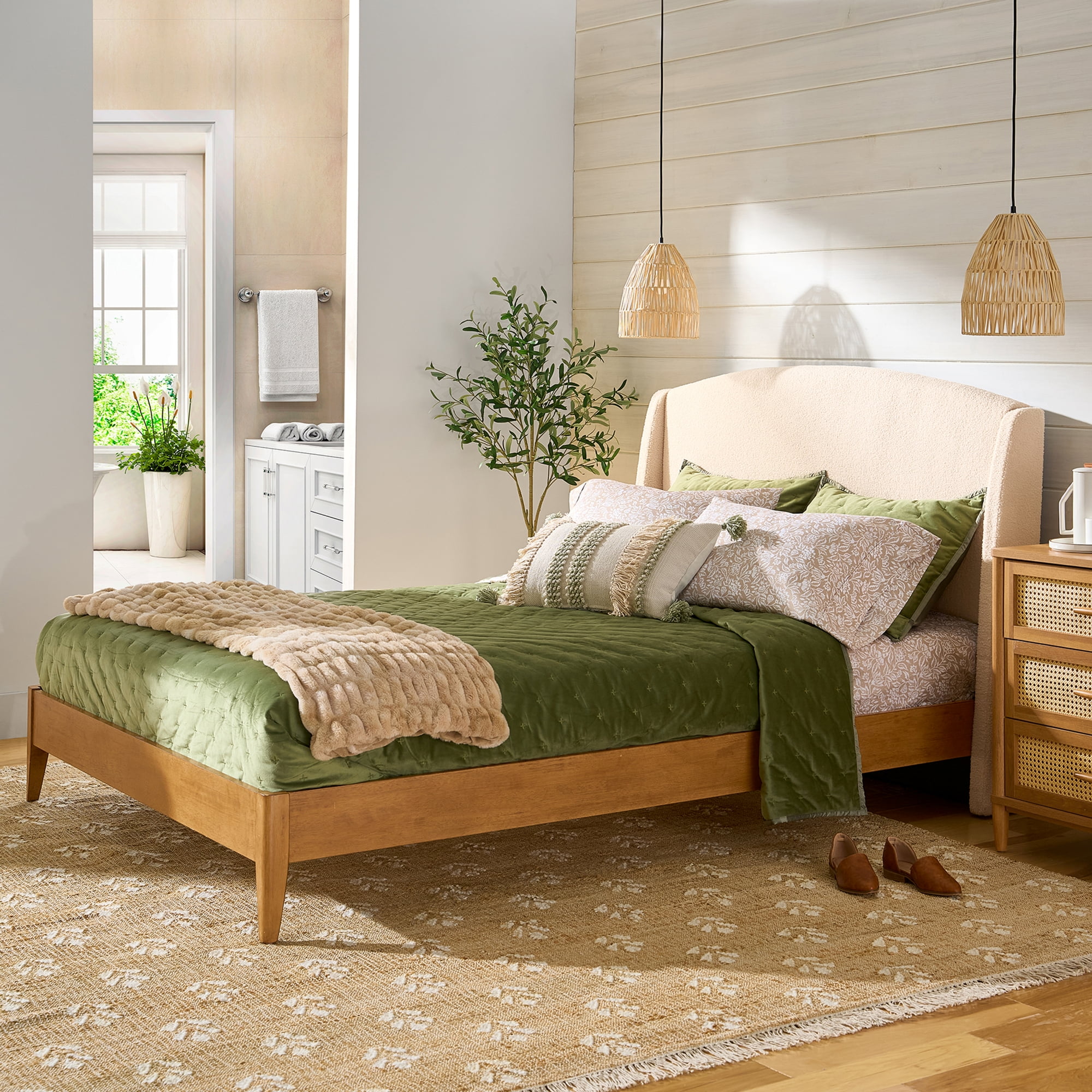 Better Homes & Gardens Springwood Upholstered Queen Bed, Shearling and Light Honey Finish