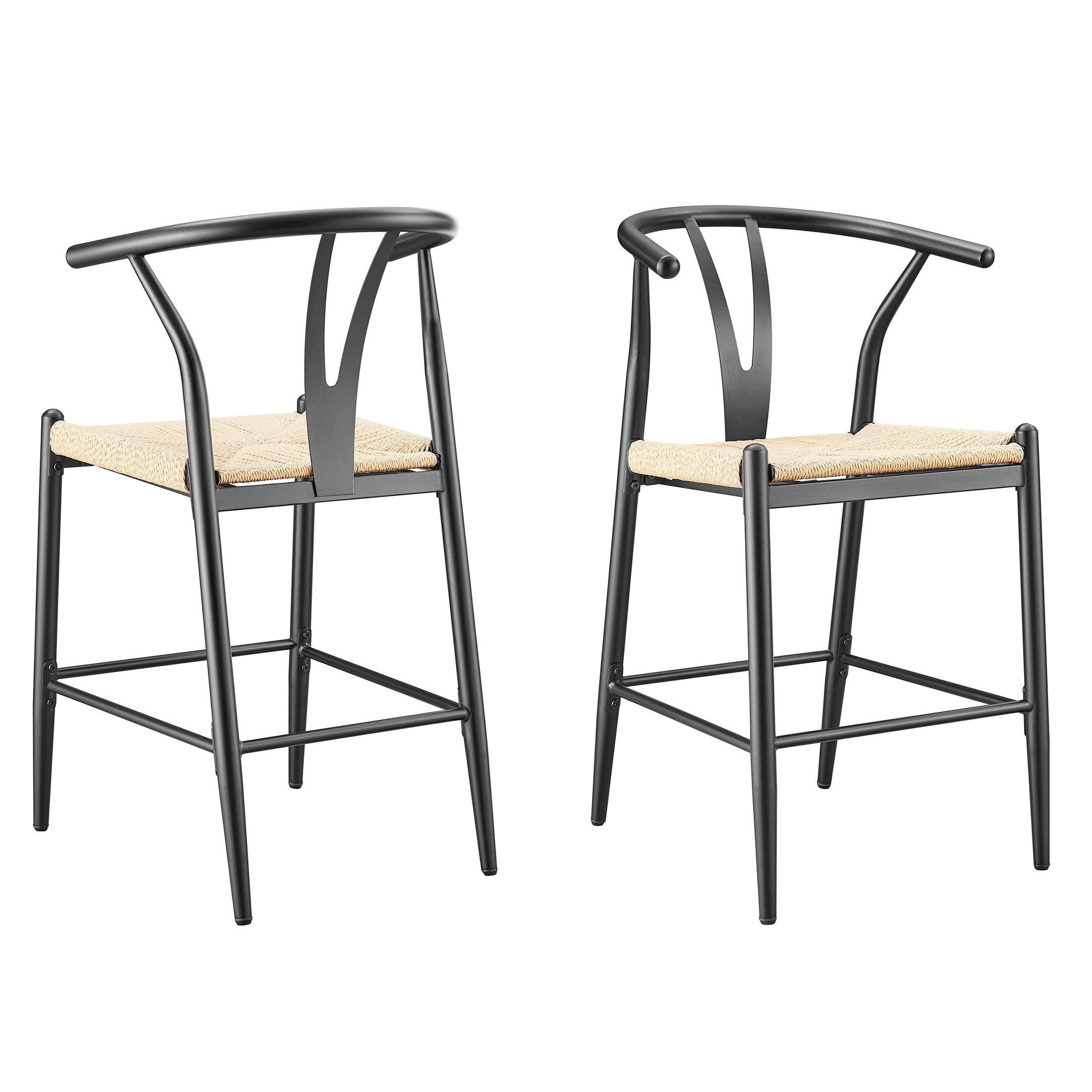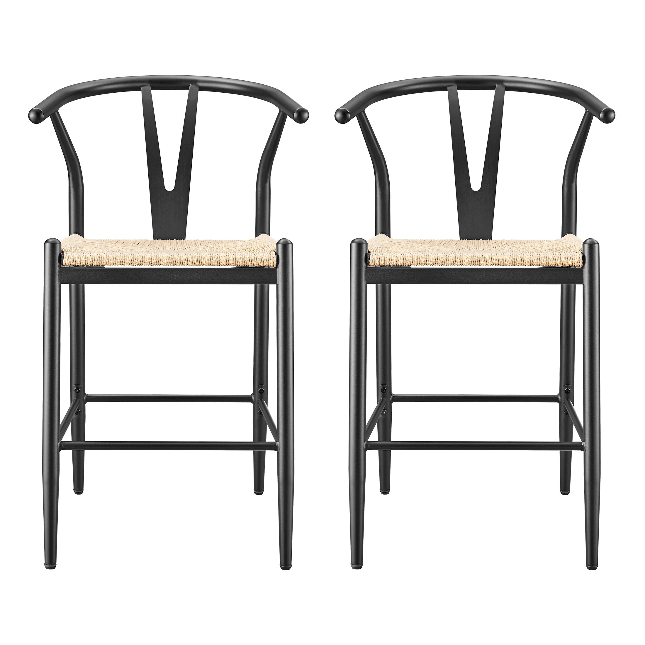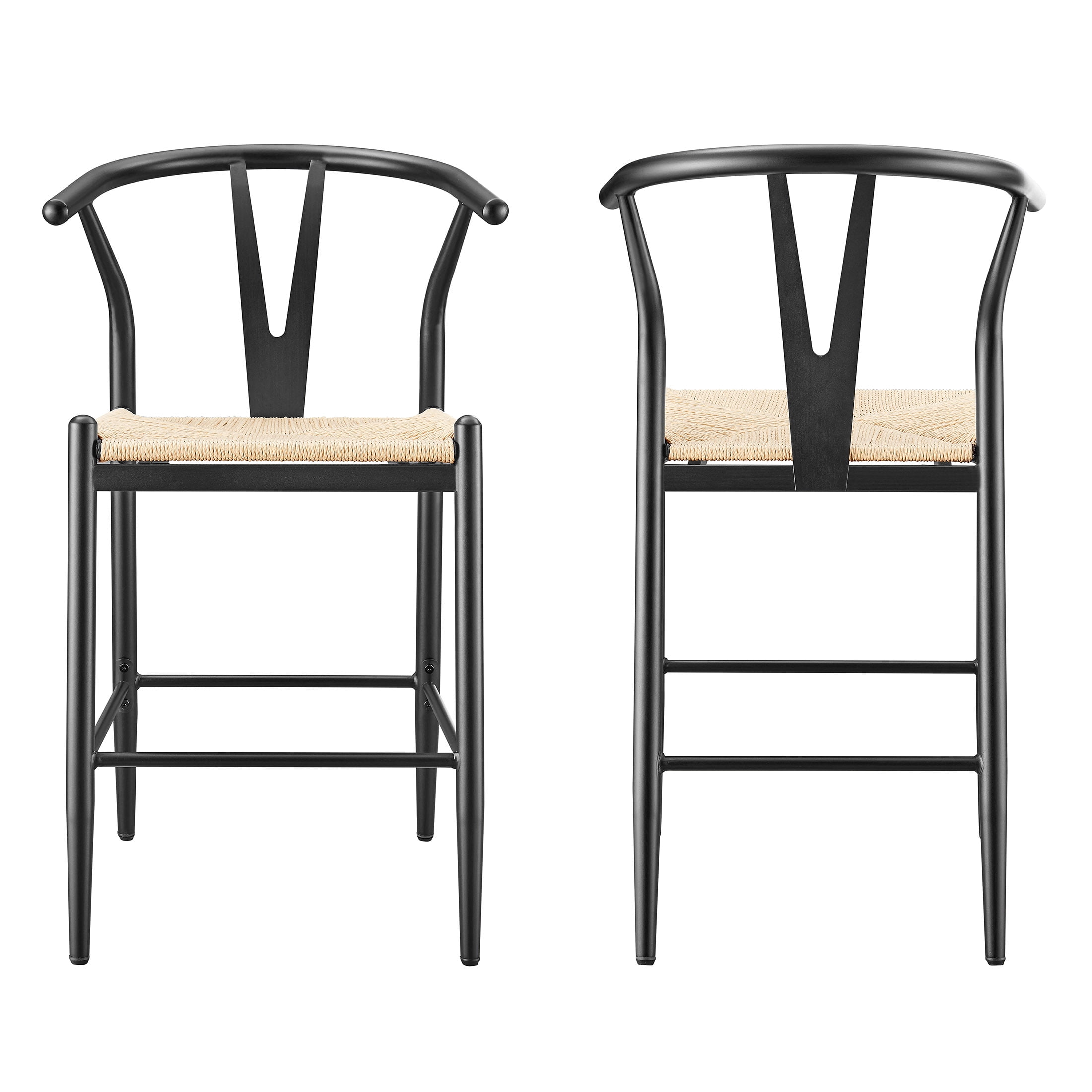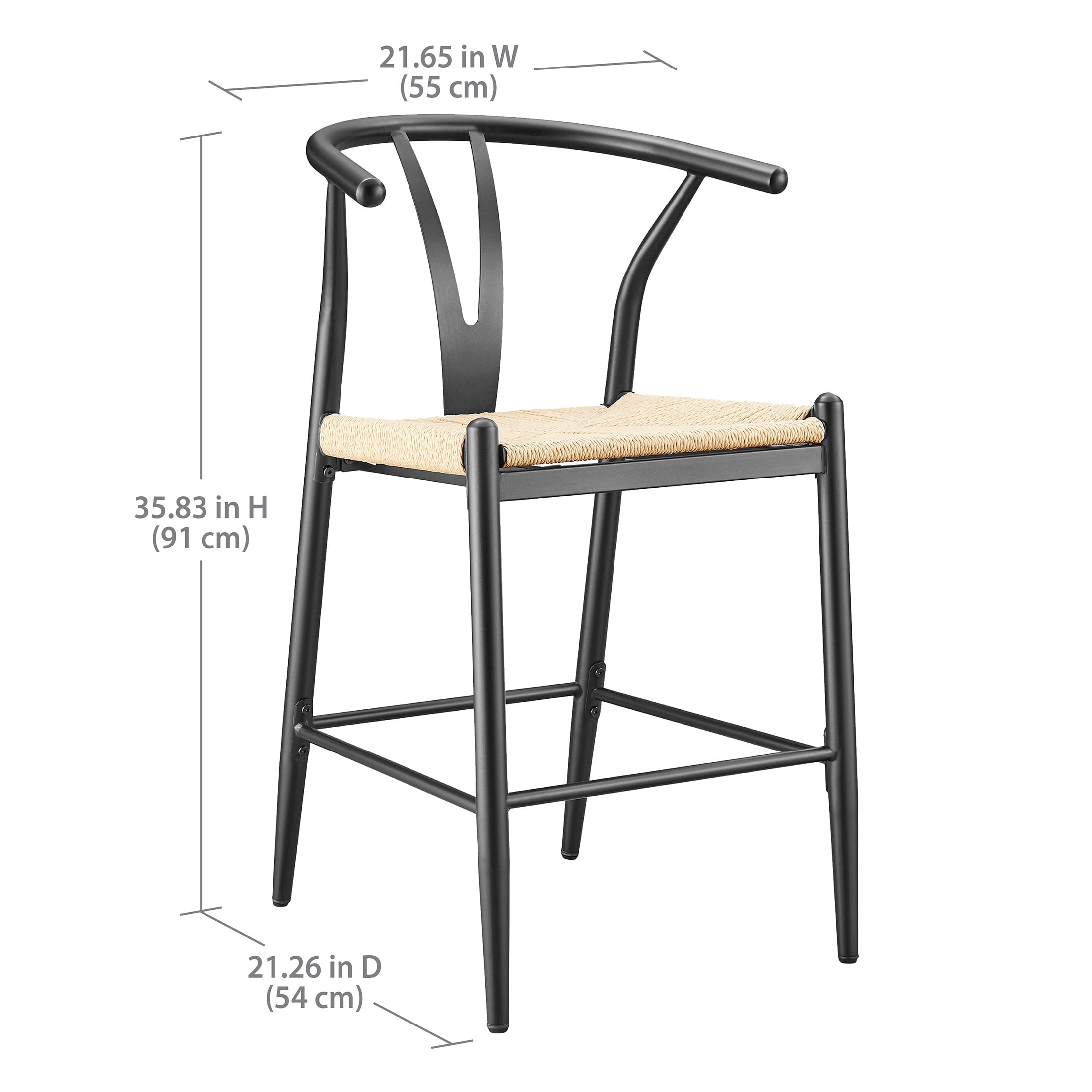 Midcentury Modern, Contemporary, Transitional style Black finish and natural seat Product material: Steel frame Seat pad: Durable, handwoven paper roping, square Sold as an indoor set (2-pack) Counter height Integrated armrests with Y-shaped backrest Feet levelers screw in Easy assembly required Clean with a soft cloth Stain resistant Weight limit: 250 lbs. Assembled product dimensions: 21.65” L X 35.83” H X 21.26” W Back height: 11.6” Seat height: 23.25” Seat width: 18” Product weight: 35 lbs. for 2 chairs Package dimensions: 38.6” L X 23.23” H X 16.34” W Package weight: 40.20 lbs Model #BH3302125171004
