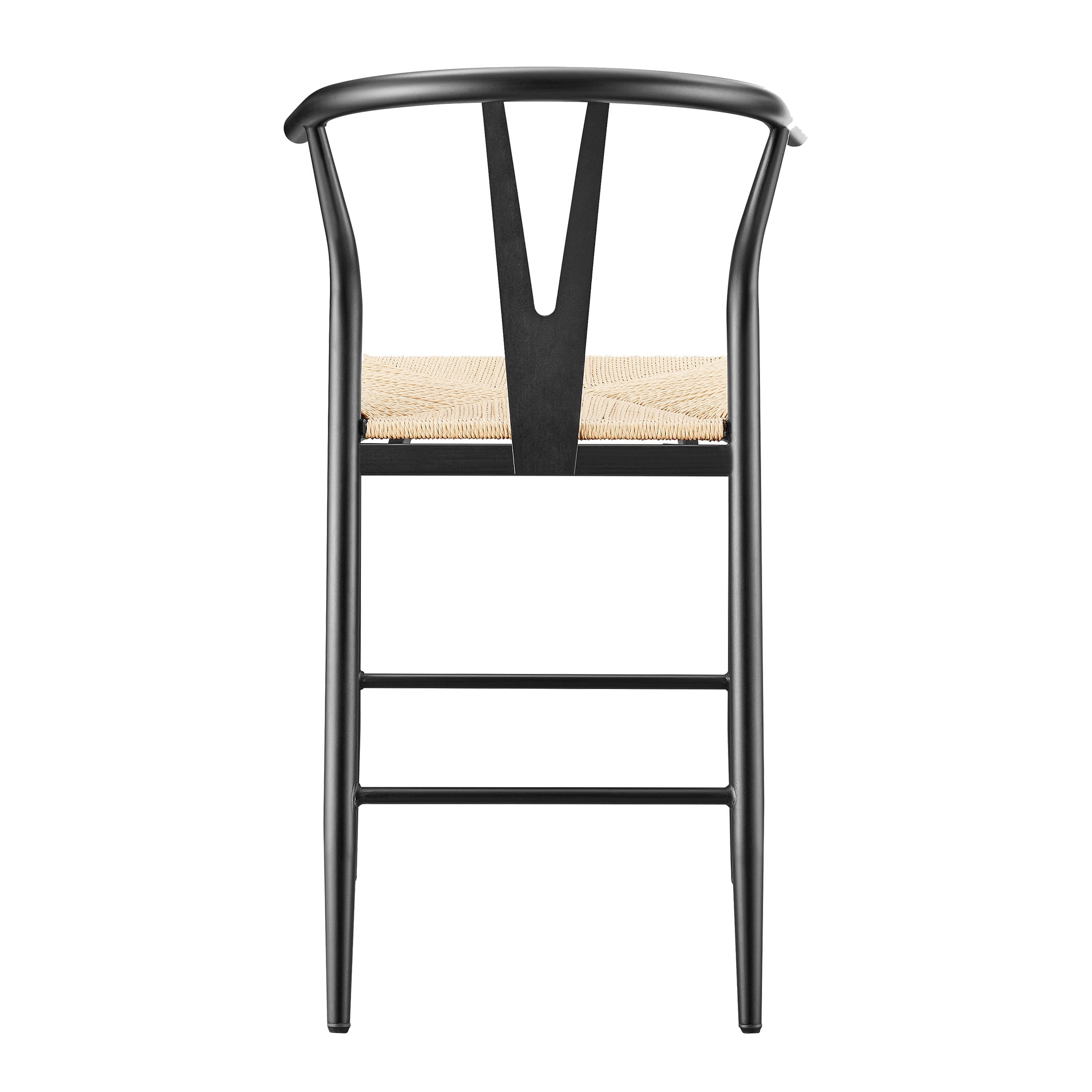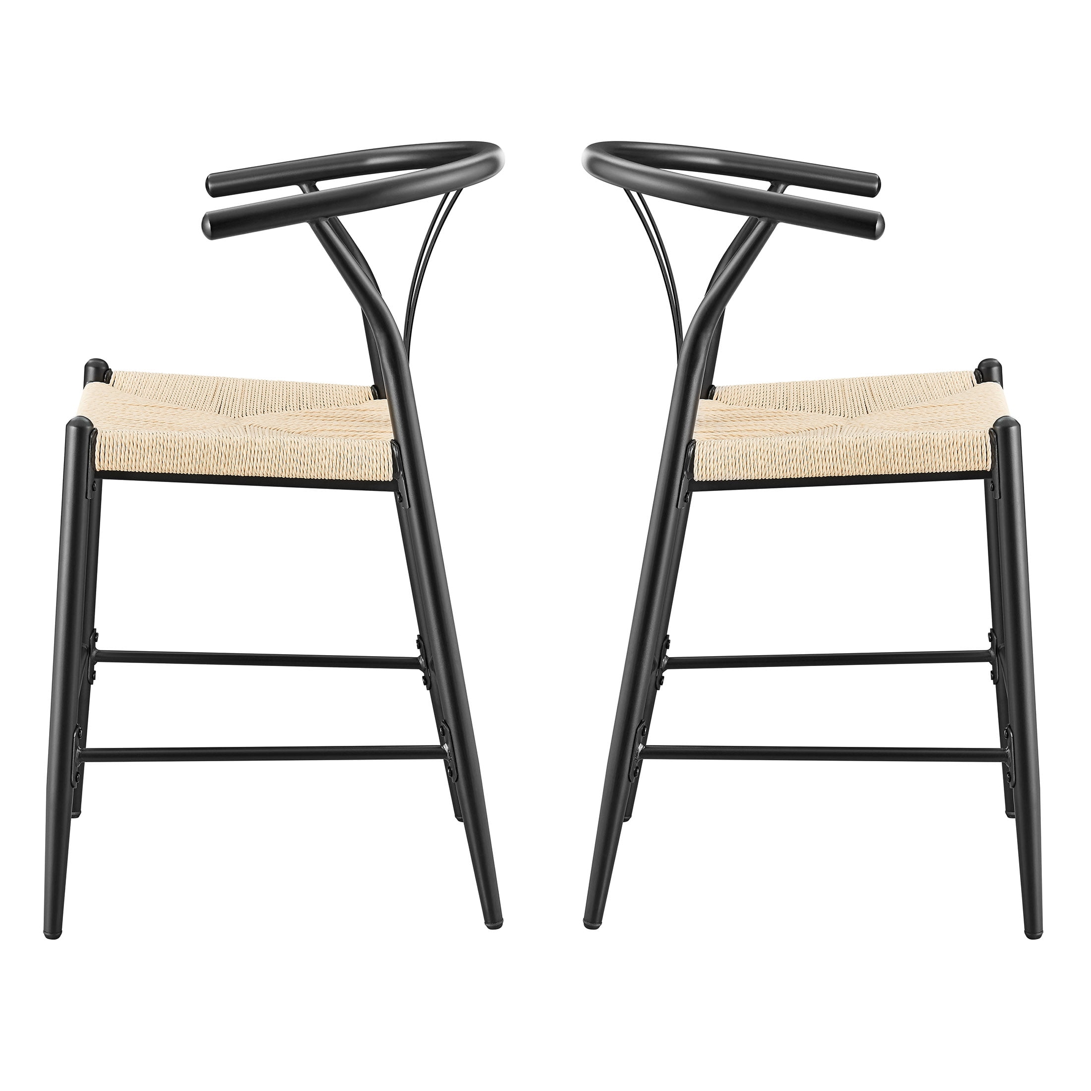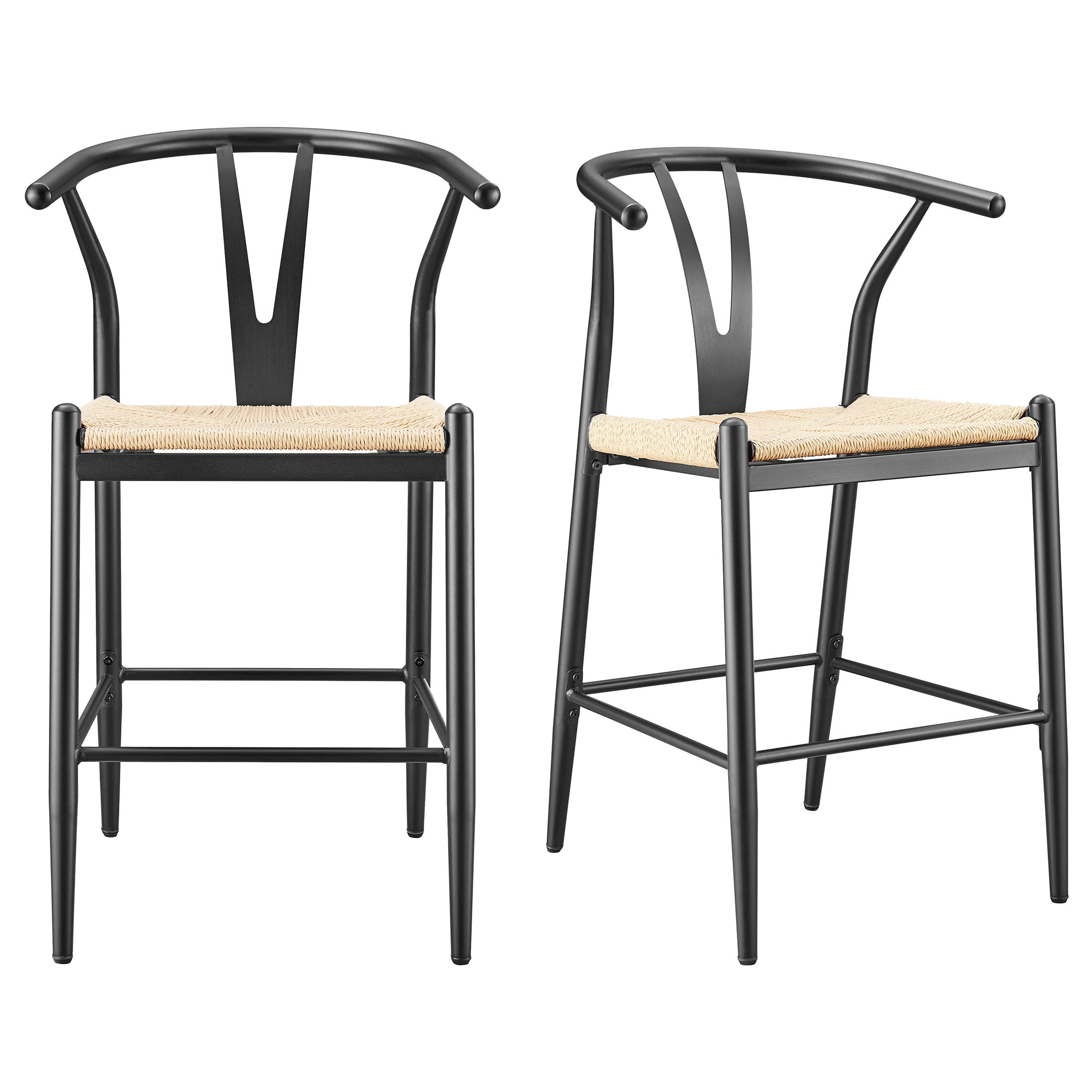 Midcentury Modern, Contemporary, Transitional style Black finish and natural seat Product material: Steel frame Seat pad: Durable, handwoven paper roping, square Sold as an indoor set (2-pack) Counter height Integrated armrests with Y-shaped backrest Feet levelers screw in Easy assembly required Clean with a soft cloth Stain resistant Weight limit: 250 lbs. Assembled product dimensions: 21.65” L X 35.83” H X 21.26” W Back height: 11.6” Seat height: 23.25” Seat width: 18” Product weight: 35 lbs. for 2 chairs Package dimensions: 38.6” L X 23.23” H X 16.34” W Package weight: 40.20 lbs Model #BH3302125171004