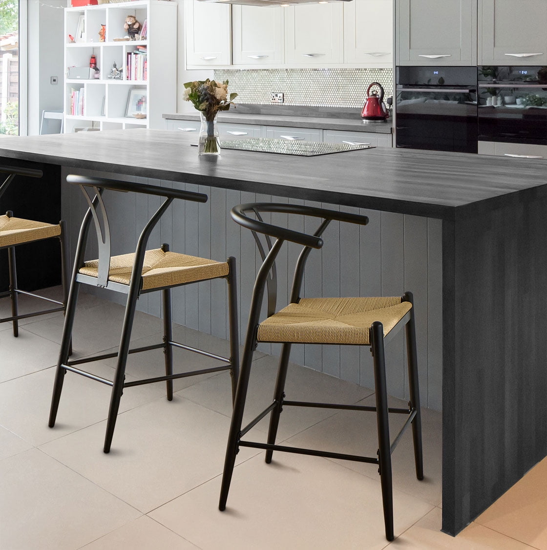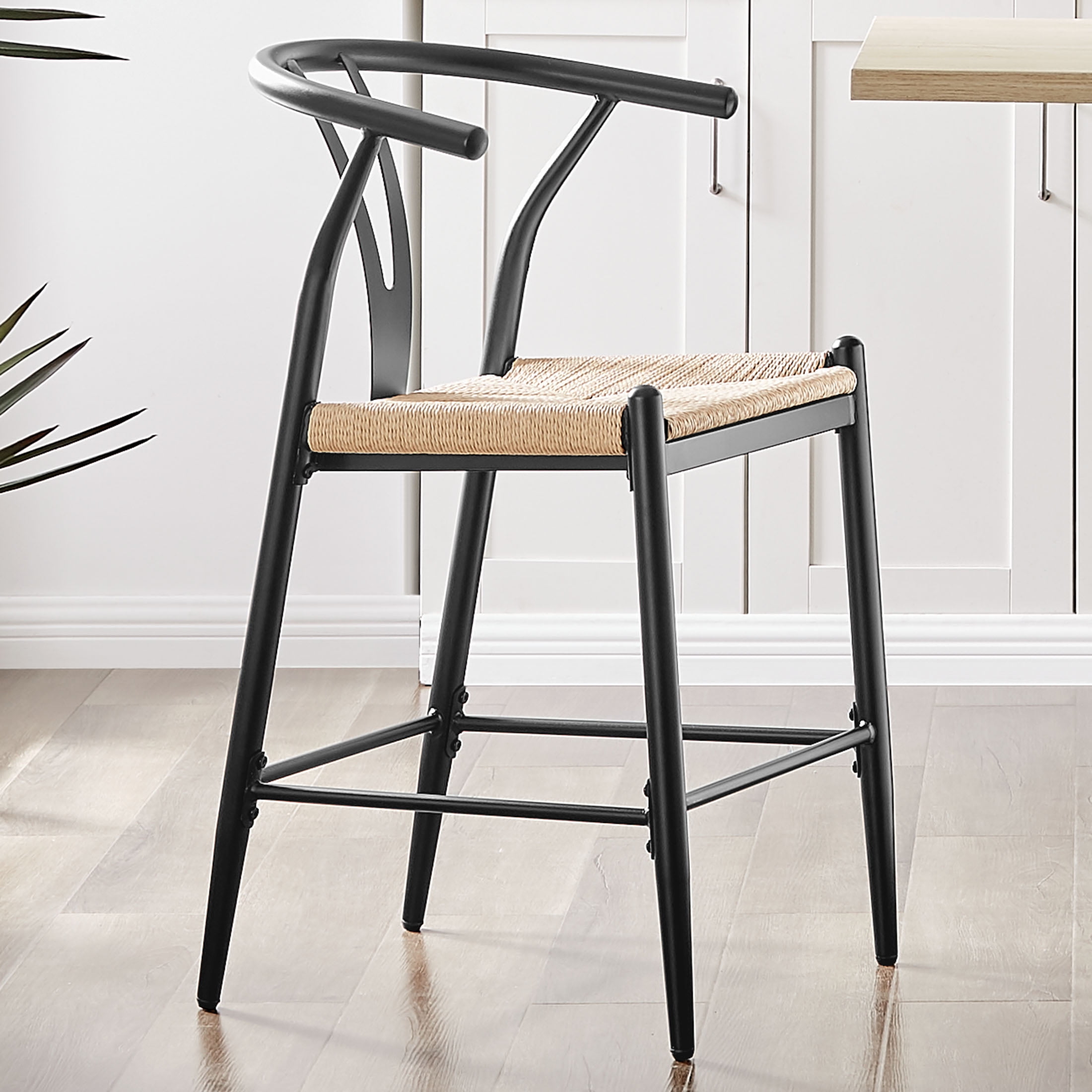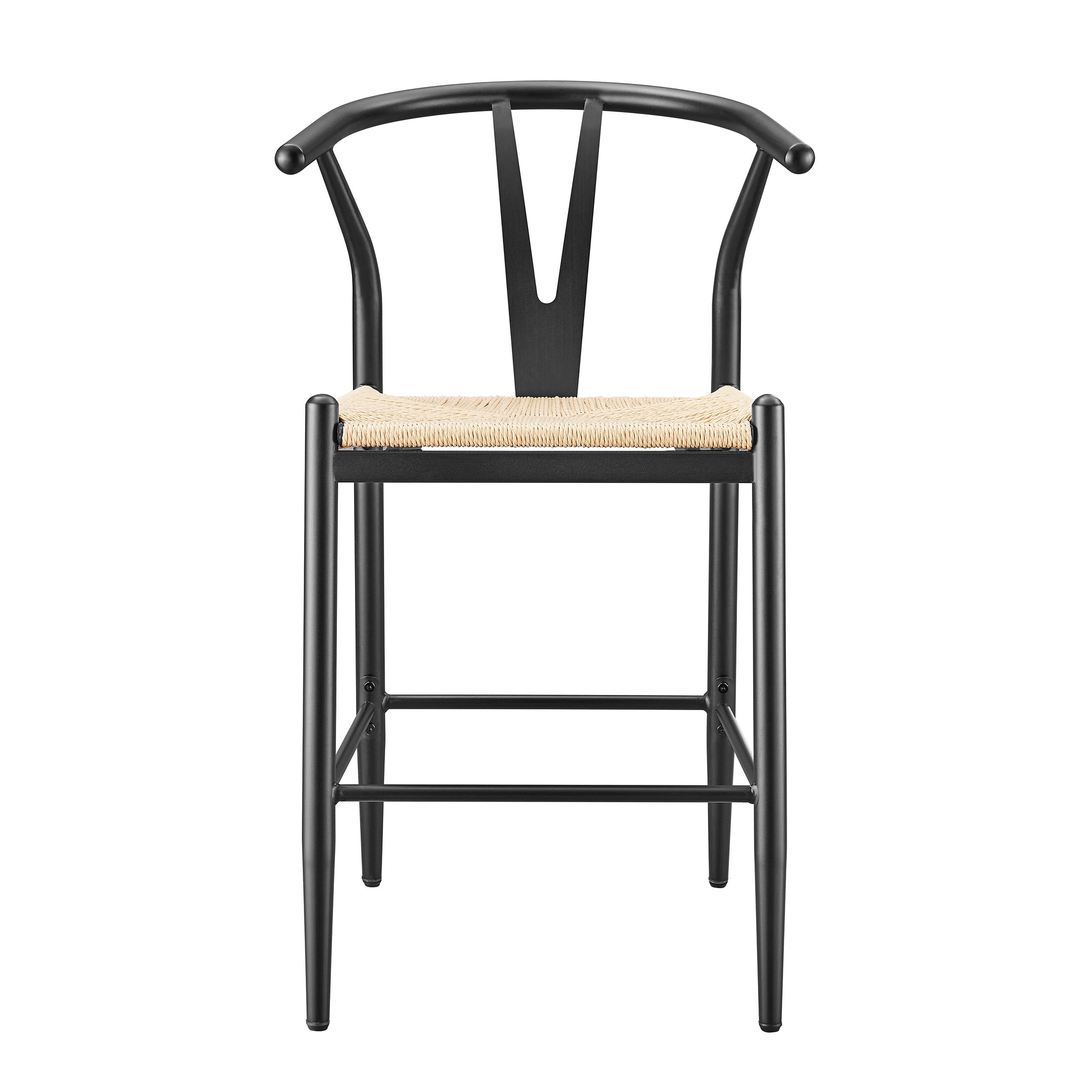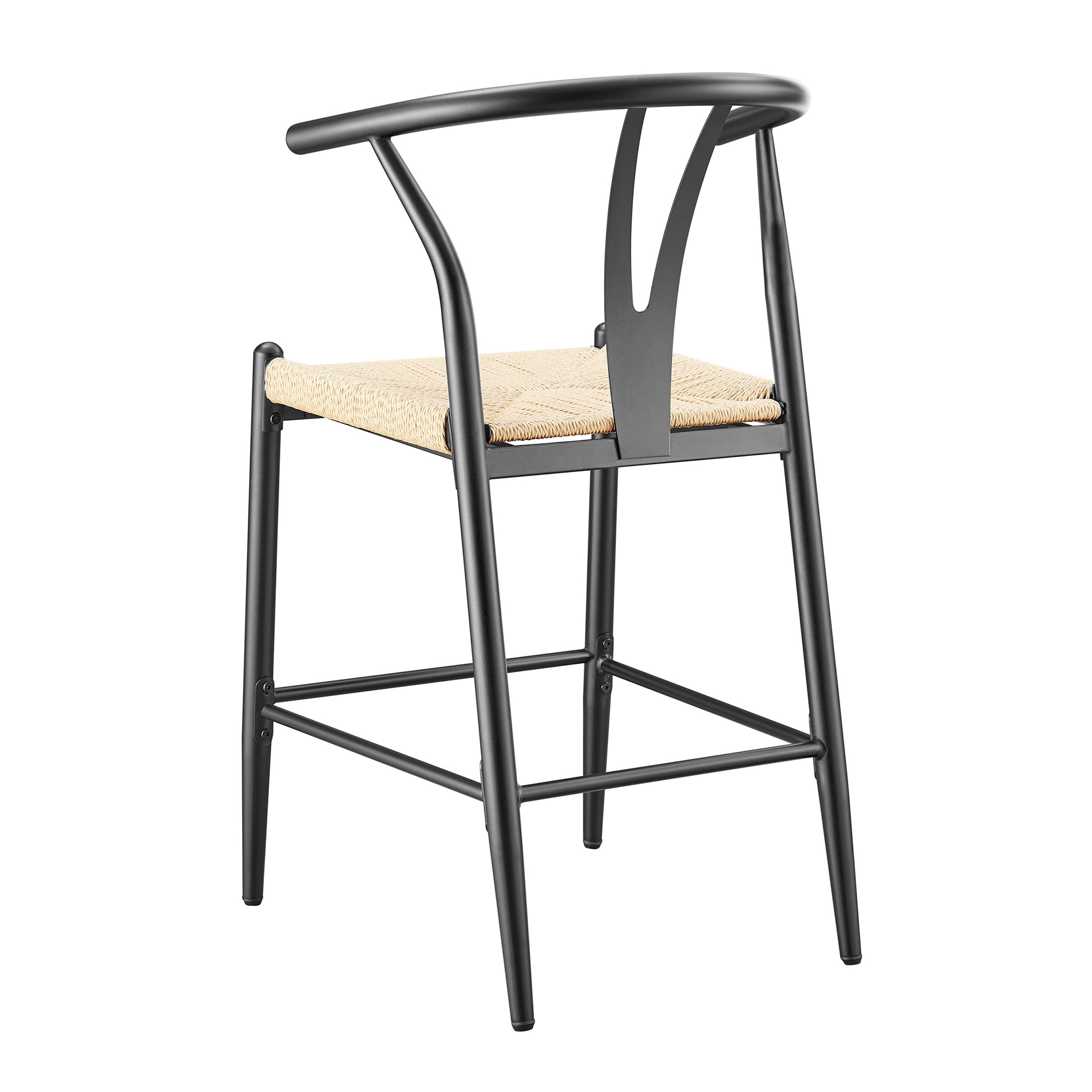 Midcentury Modern, Contemporary, Transitional style Black finish and natural seat Product material: Steel frame Seat pad: Durable, handwoven paper roping, square Sold as an indoor set (2-pack) Counter height Integrated armrests with Y-shaped backrest Feet levelers screw in Easy assembly required Clean with a soft cloth Stain resistant Weight limit: 250 lbs. Assembled product dimensions: 21.65” L X 35.83” H X 21.26” W Back height: 11.6” Seat height: 23.25” Seat width: 18” Product weight: 35 lbs. for 2 chairs Package dimensions: 38.6” L X 23.23” H X 16.34” W Package weight: 40.20 lbs Model #BH3302125171004