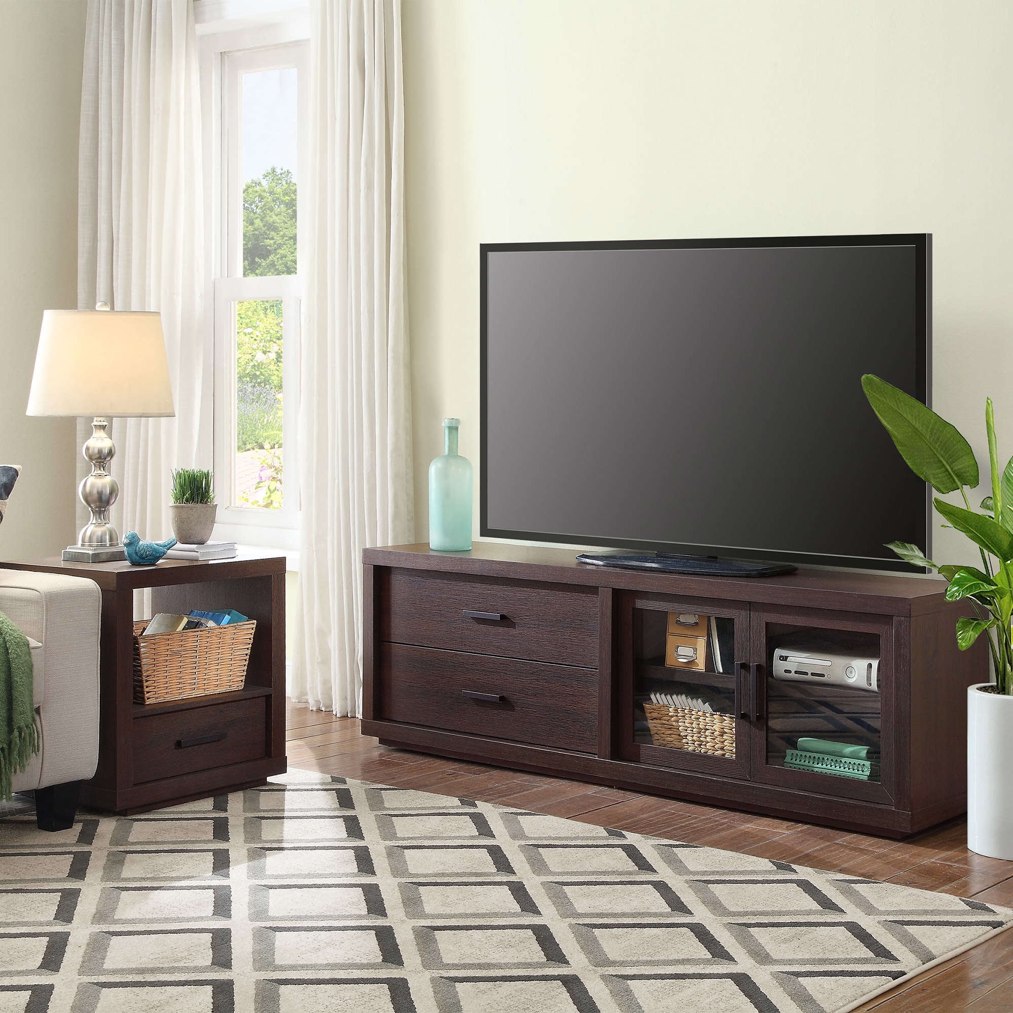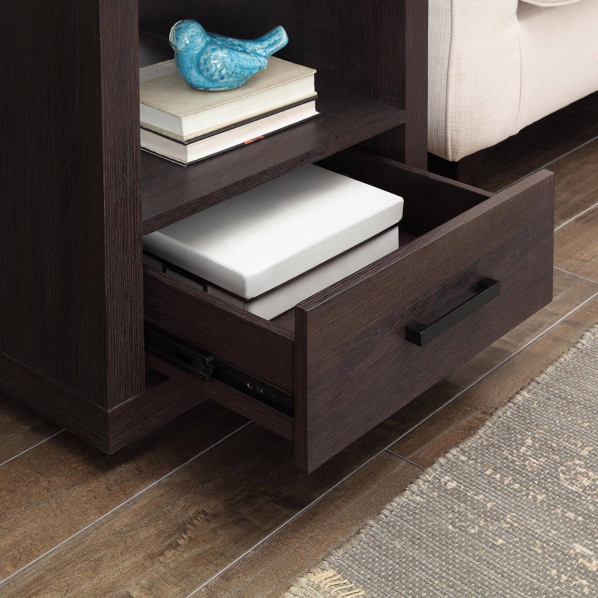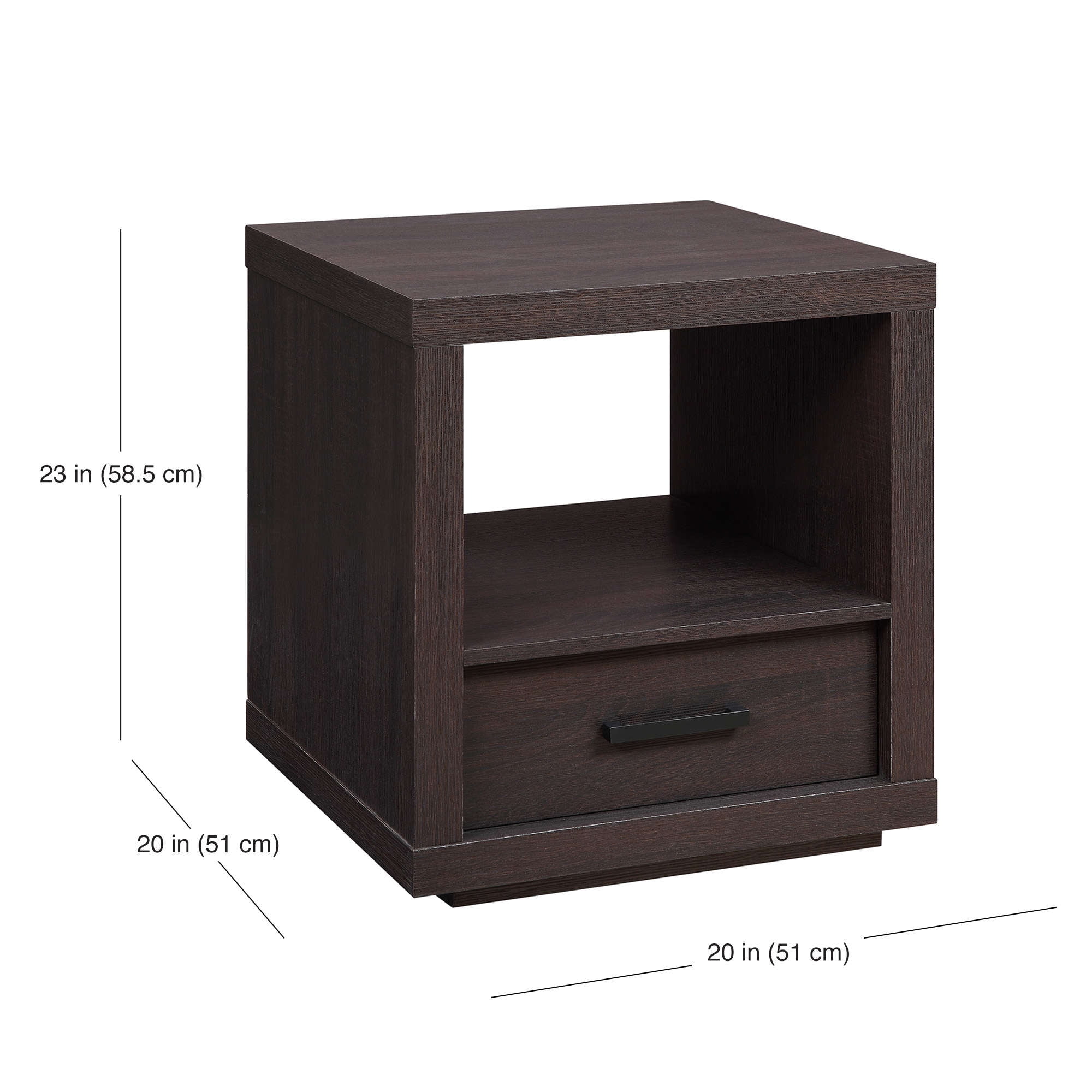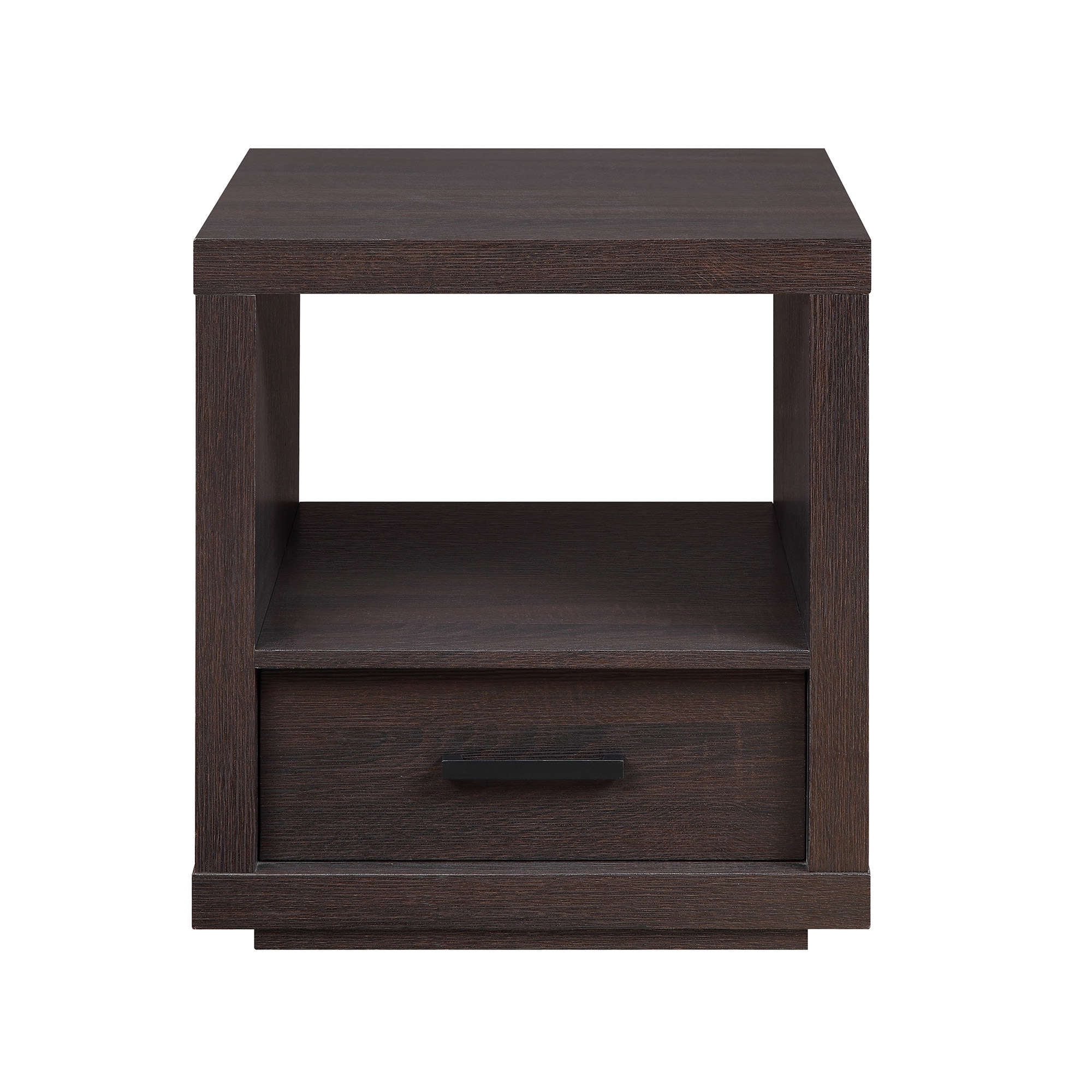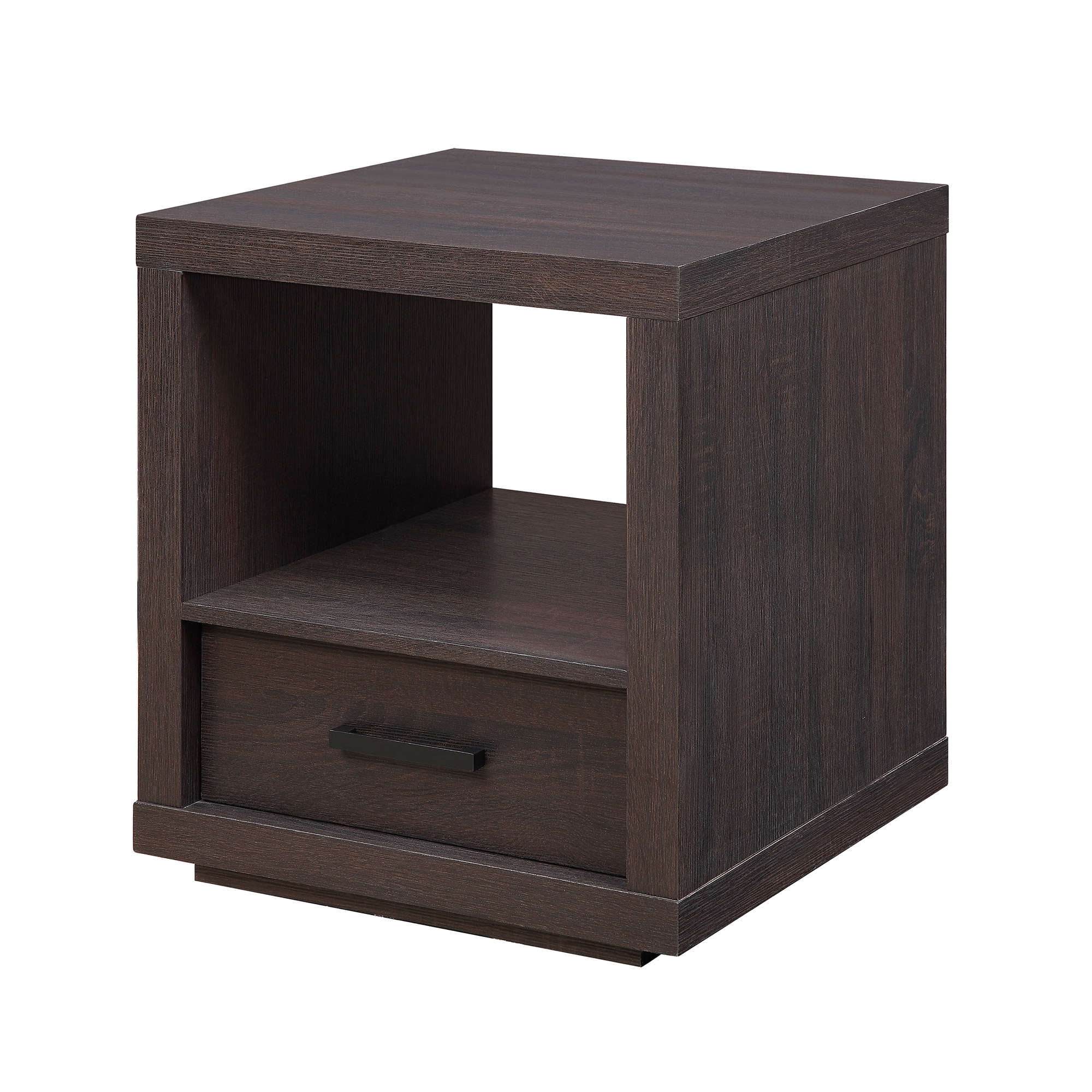 The sleek Better Homes & Gardens End Table is the perfect combination of sleek style and convenient function. Clean lines and a deep espresso finish make this contemporary table blend well with a variety of color schemes and most any interior decor or home furnishings from contemporary and modern to classic and traditional and all things in between. A spacious lower drawer provides the perfect area for storing remote controls, car keys, and personal items, and a large open shelf provides ample storage space for magazines, books, etc. or you can use it for displaying knick-knacks or mementos so the top area can stay clear of clutter. It can be used in any room in your home from the living room or family room to the game room, study or home office, and beyond. It is easy to assemble so you can begin enjoying it almost immediately. Coordinates well with other items in the Better Homes & Gardens Steel Collection.