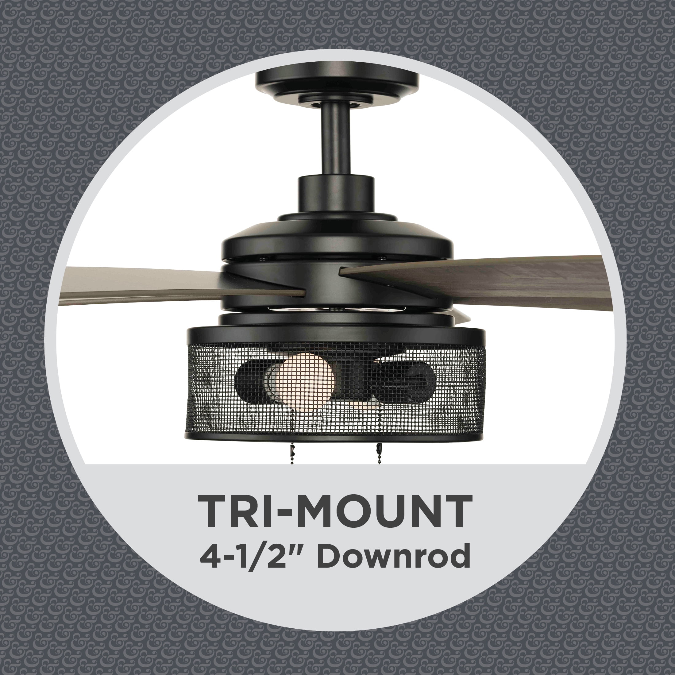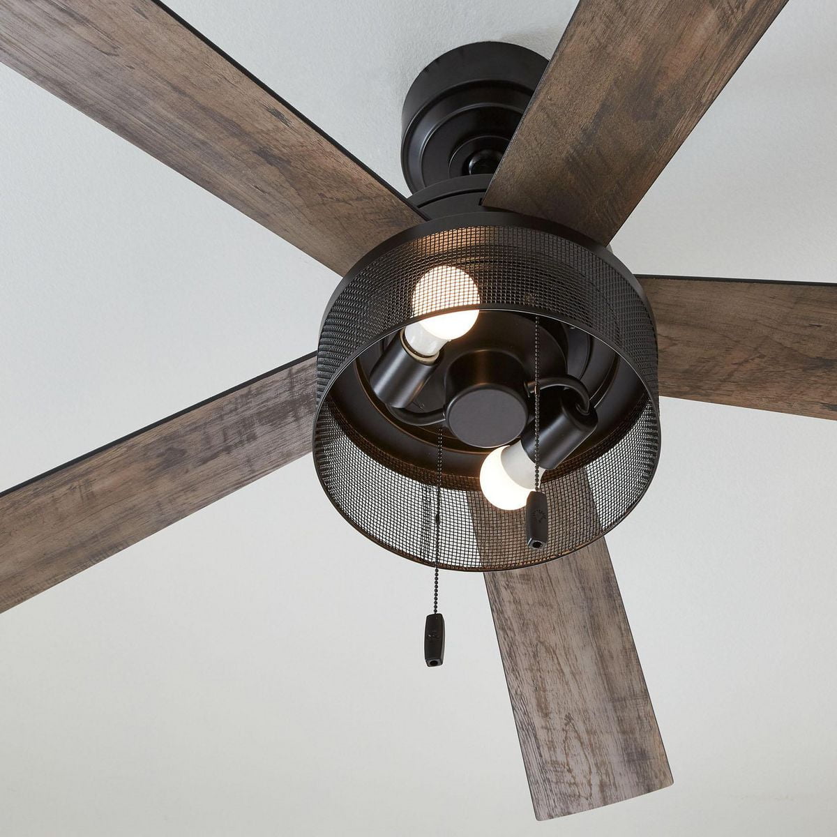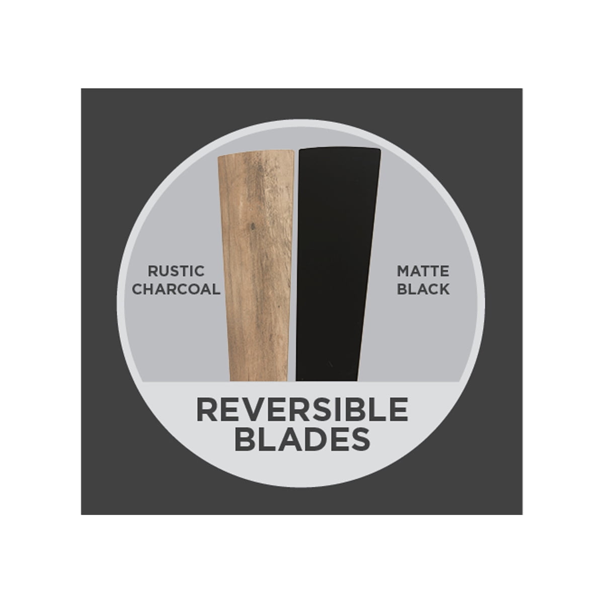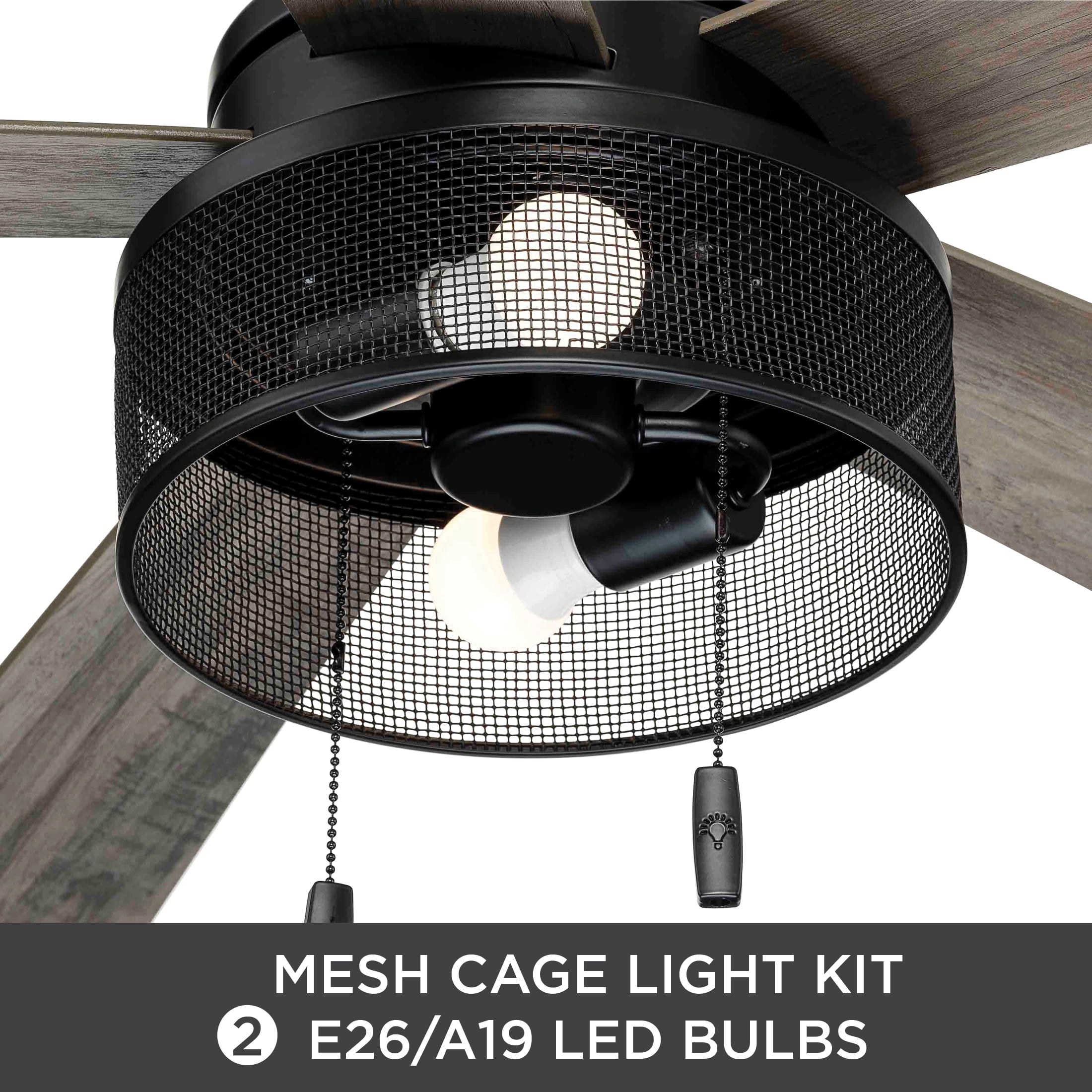 5 Reversible Blades- Choice of Rustic Charcoal or Classic Matte Black Transitional, Urban Industrial Style Dimensions: 52 in. D x 52 in. W x 13.98 H Open Mesh Cage Light Kit, 2 6W, E26 A15 LED bulbs, 3000K, 90CRI (Included) 3 Pull-Chain Adjustable Speed Settings with Manual Reverse ETL Dry Location Listed for Indoor Use Down Rod Included, Slope Ceiling Kit Compatible Reversible for Energy Savings Throughout Winter and Summer Months