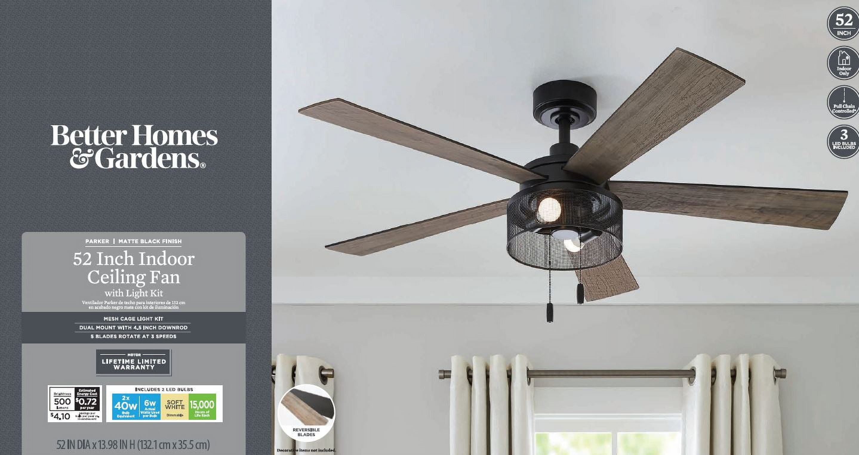 Better Homes & Gardens Transitional 52″ Black Ceiling Fan, 5 Reversible Blades, LED Light Kit, Reverse Airflow