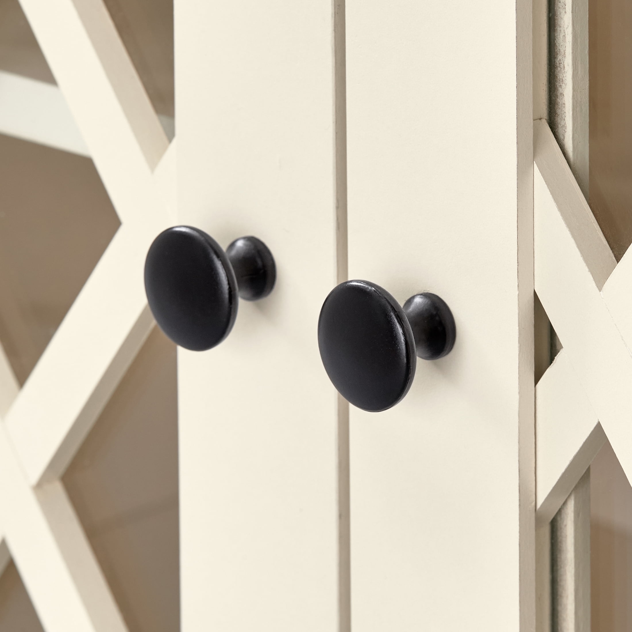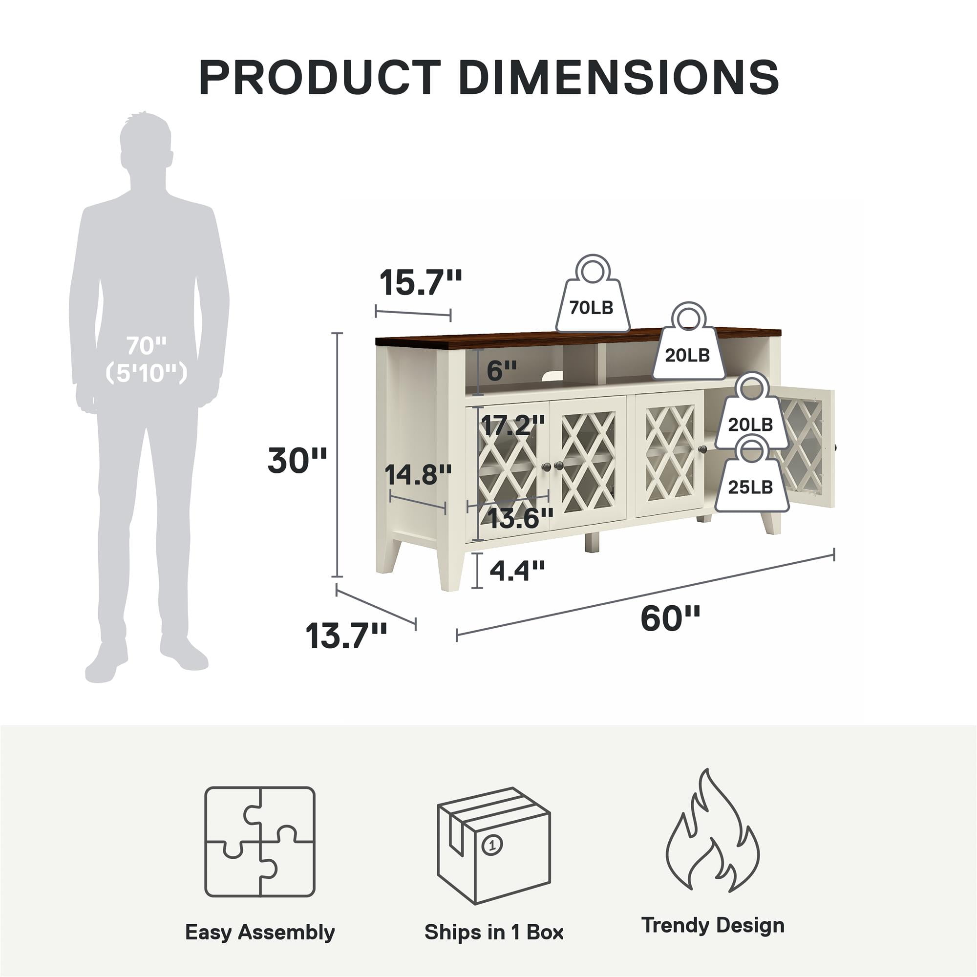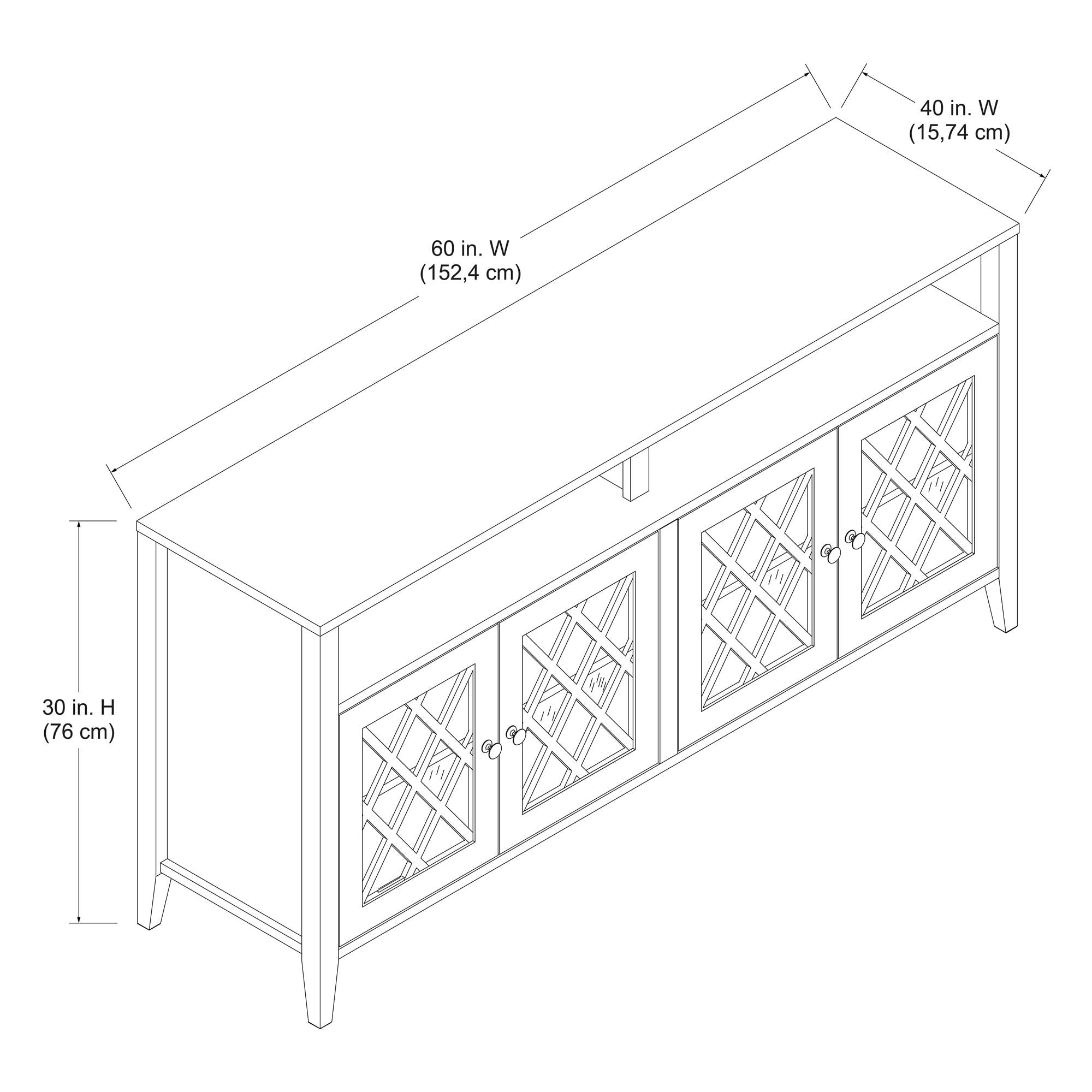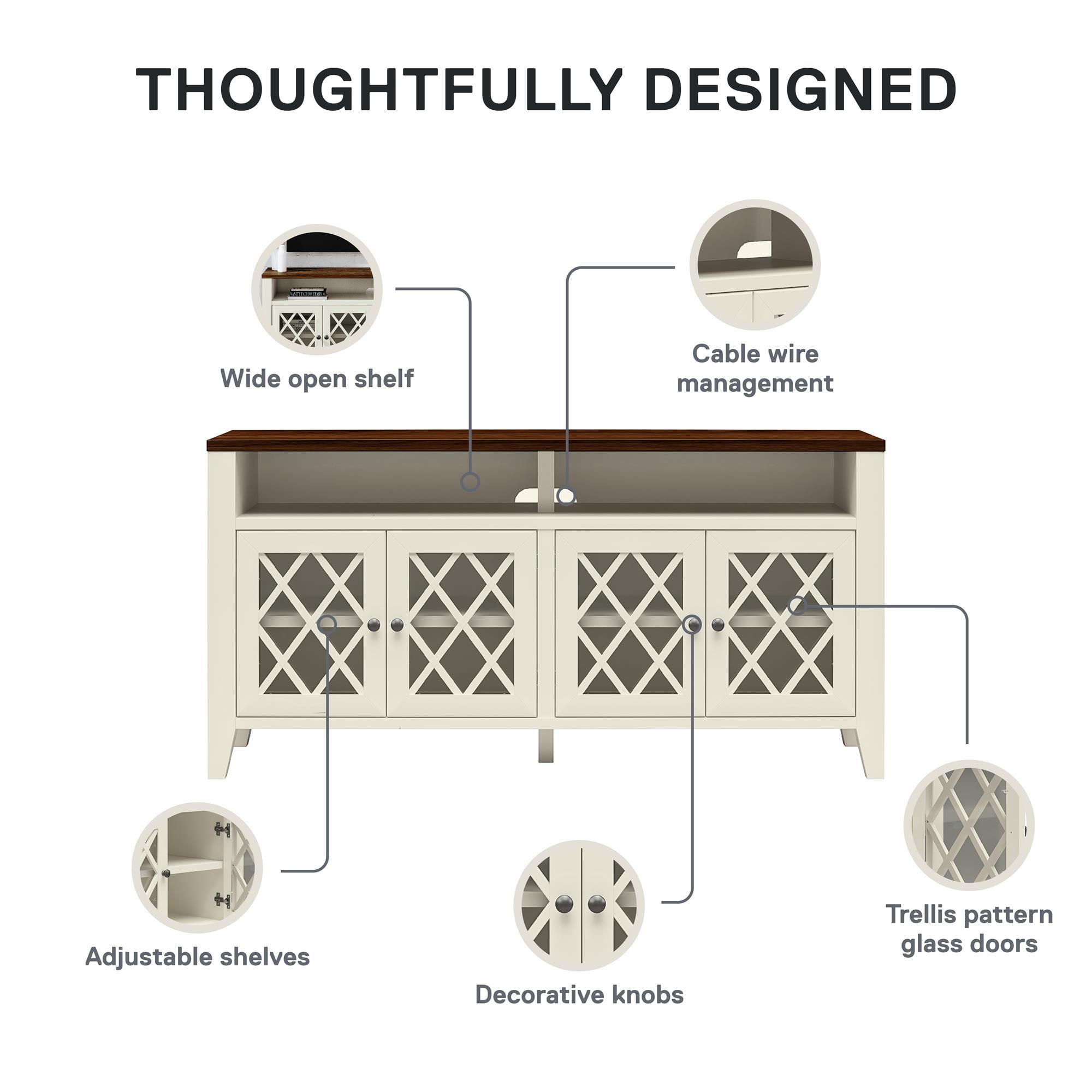 STYLISH AND FUNCTIONAL TV STAND FOR THE LIVING ROOM: The Better Homes & Gardens Trellis TV Stand with Glass Doors combines style and storage, making it an ideal addition to your living room, bedroom, or family room ELEGANT TV CONSOLE DESIGN: This elegant entertainment center is crafted from durable painted engineered wood and features framed glass doors with intricate trellis pattern detailing VERSATILE STORAGE: Round knobs provide a classic look, while the adjustable shelves offer versatile storage options; Open shelf with recessed center and wire management, perfect for a sound bar, media components, and gaming systems ITEM DETAILS: Ships in one box and requires assembly by two adults; Dimensions and weight: 60″ W x 30″ H x 15.74″ D; 140 lbs.; Max weight capacities: Top: 70 lbs.; Bottom shelves (x2): 25 lbs. each; Adjustable and top shelves: 20 lbs. each section 1-YEAR LIMITED WARRANTY: Contact our customer support team in the U.S. and Canada for help with replacement parts, assembly assistance, or warranty inquiries via online chat, email, or phone