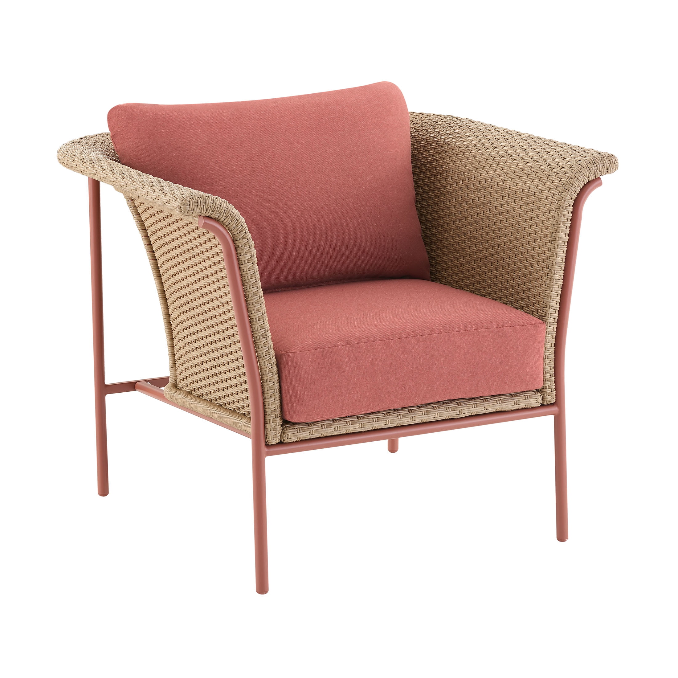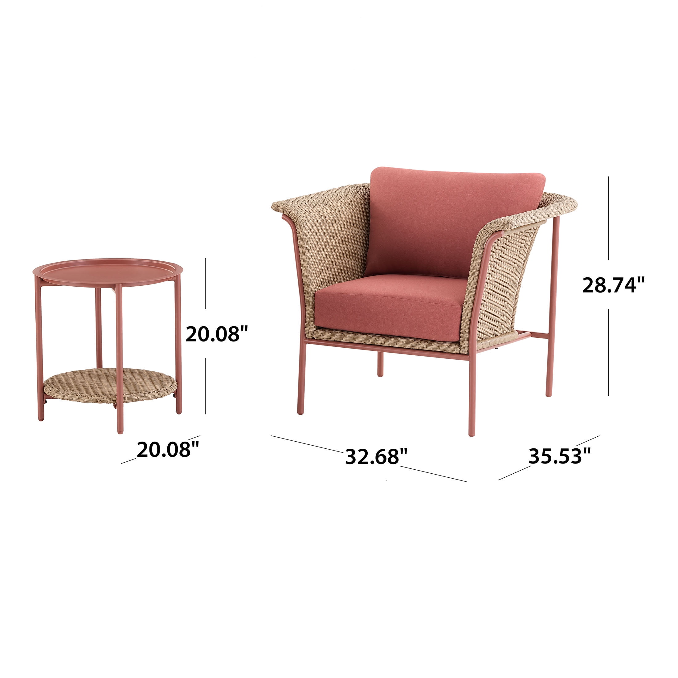 Better Homes & Gardens Trezza Wicker 3-Piece Outdoor Chat Set, Terra Cotta Materials & Construction: Rust-resistant powder-coated steel frame | Handwoven, weather-resistant wicker Configuration & Dimensions: Chair: 35.43″”W x 32.68″” D x28.74″” H | Table: 23.62″” dia. x 22.83″”H Weight Capacity: Supports up to 250 lbs. per chair Comfort Features: Cushioned low-back chairs with soft, supportive padding | Ideal for hours of outdoor relaxation Weather Resistance: Crafted with durable materials for long-lasting outdoor performance | UV-resistant fabric and Scotchgard™ protection Assembly: Easy assembly with instructions included Warranty: 3-year limited warranty on frame | 1-year limited warranty on fabric Maintenance Callout: Wipe clean with a damp cloth and mild soap “