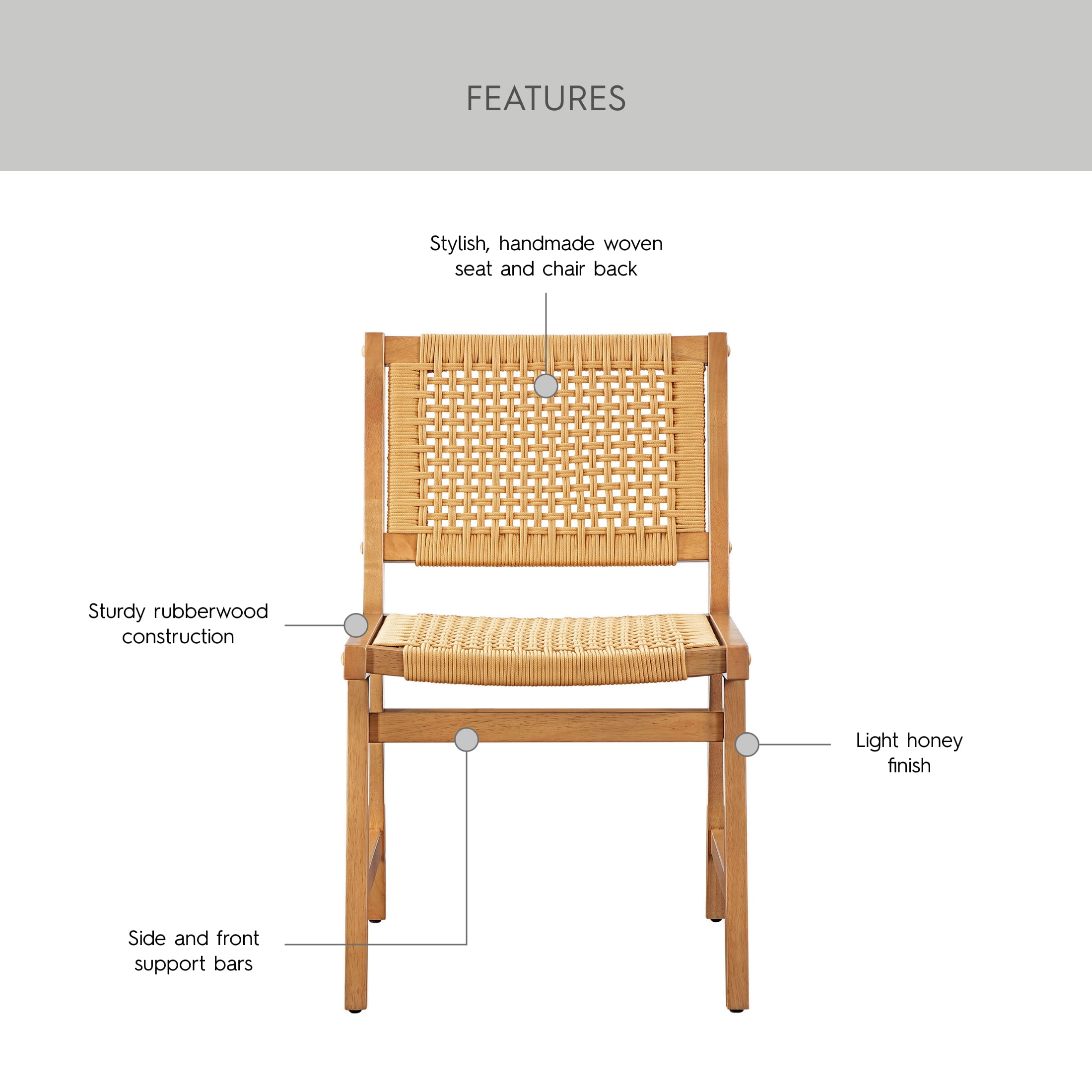 Better Homes & Gardens Vista Woven Coastal Dining Chairs 2 Pack, Light Honey Finish Materials & Construction: Strong rubberwood construction | Handwoven seats and backrests Configuration & Dimensions: Chair: 20″”W x 22.875″”D x 33.71″”H | Seat: 15″”W x 19.05″”D x 18.5″”H Comfort Features: Side support bars for added stability Assembly: Easy assembly with included instructions | 2-person assembly recommended Warranty: 1-year warranty Weight Capacity: 300lbs Maintenance: Wipe clean with damp cloth Customer Service: Contact us at 1-866-942-5362 or email [email protected]
