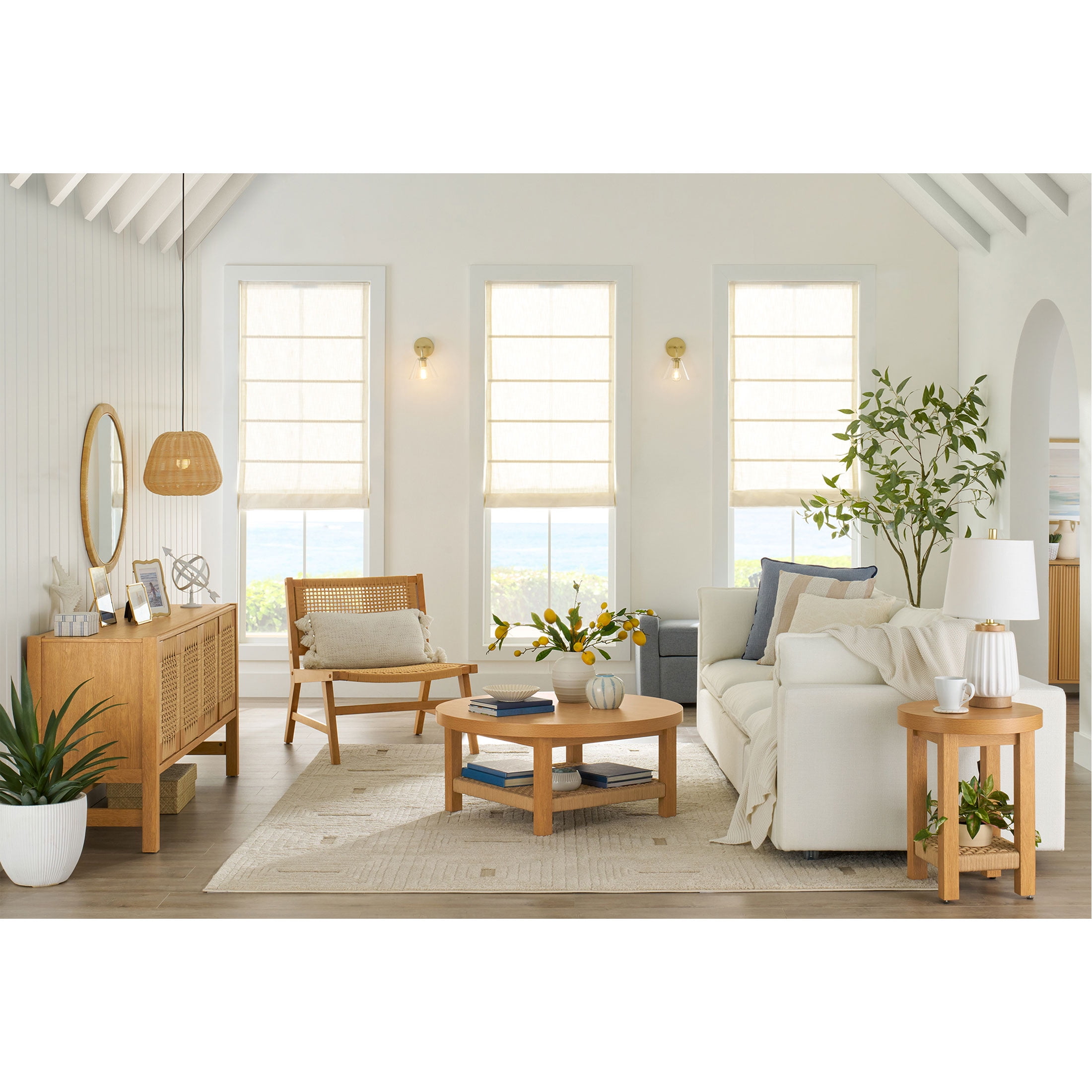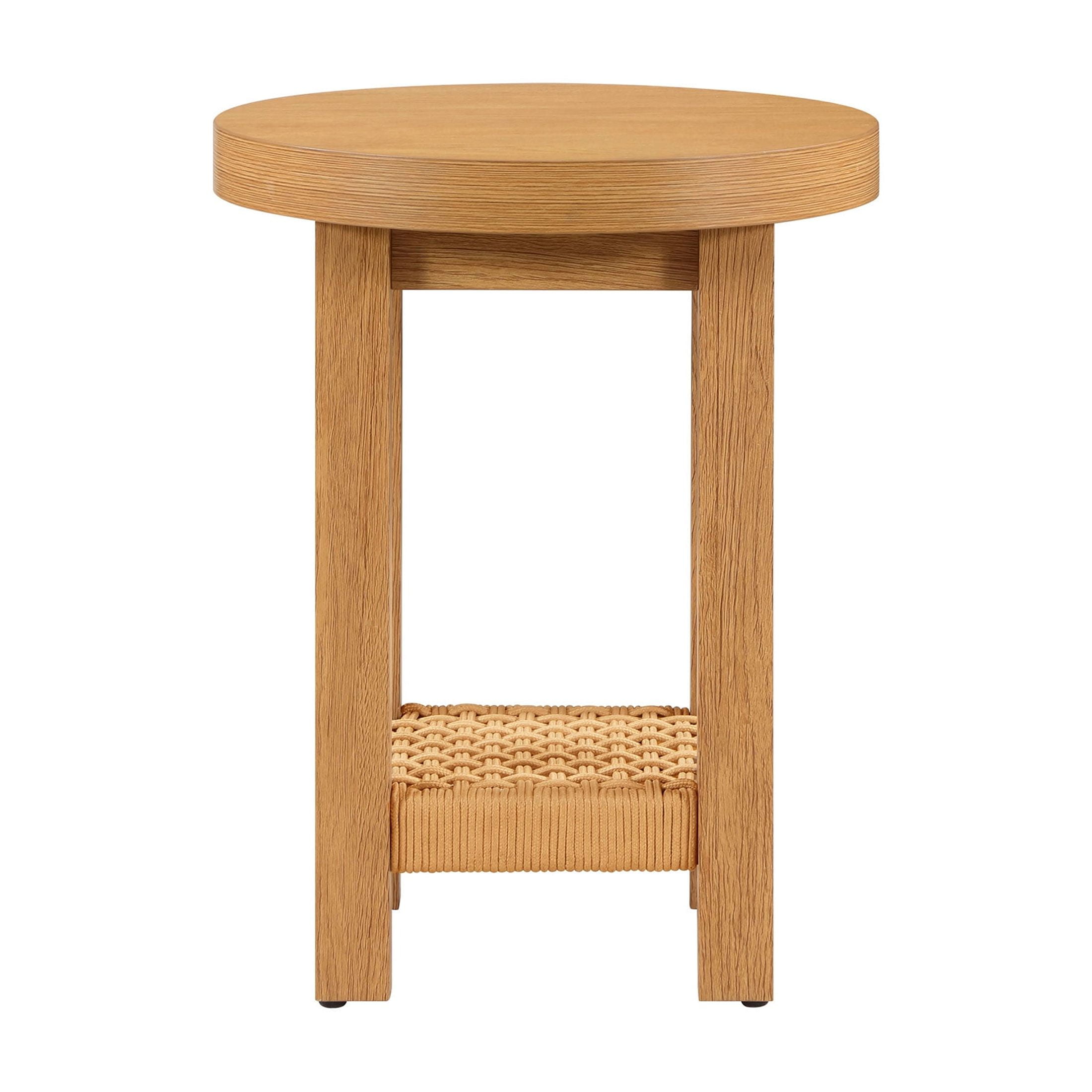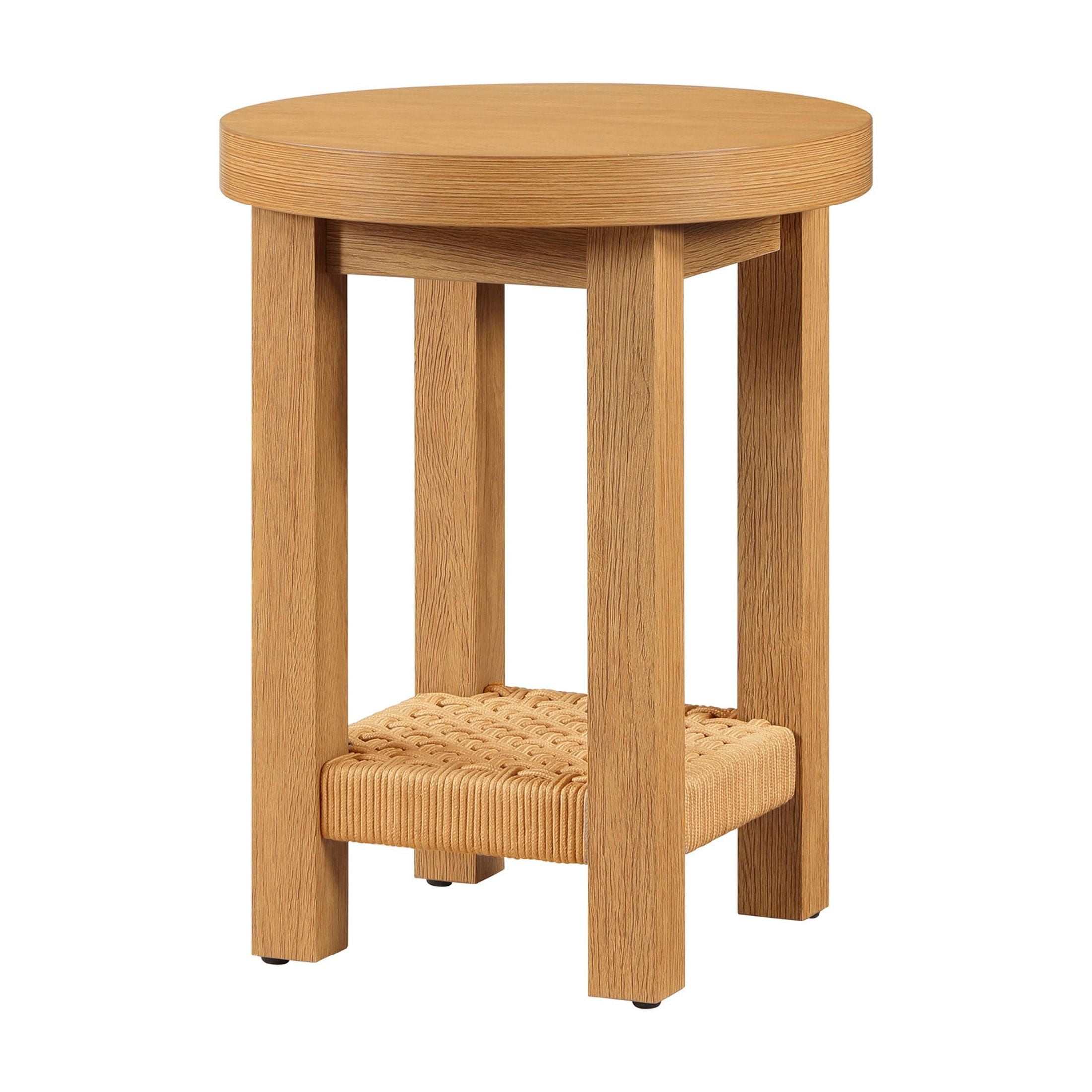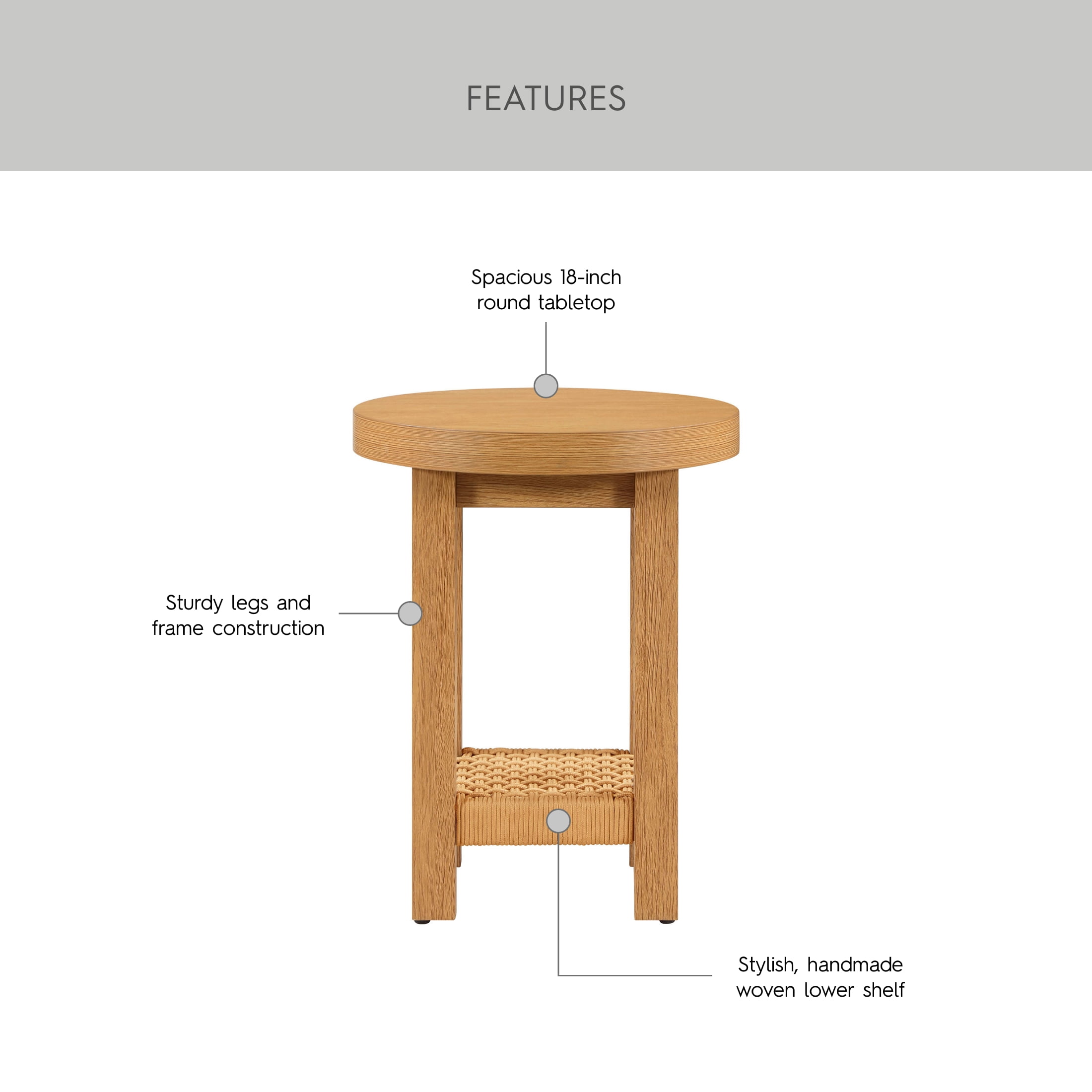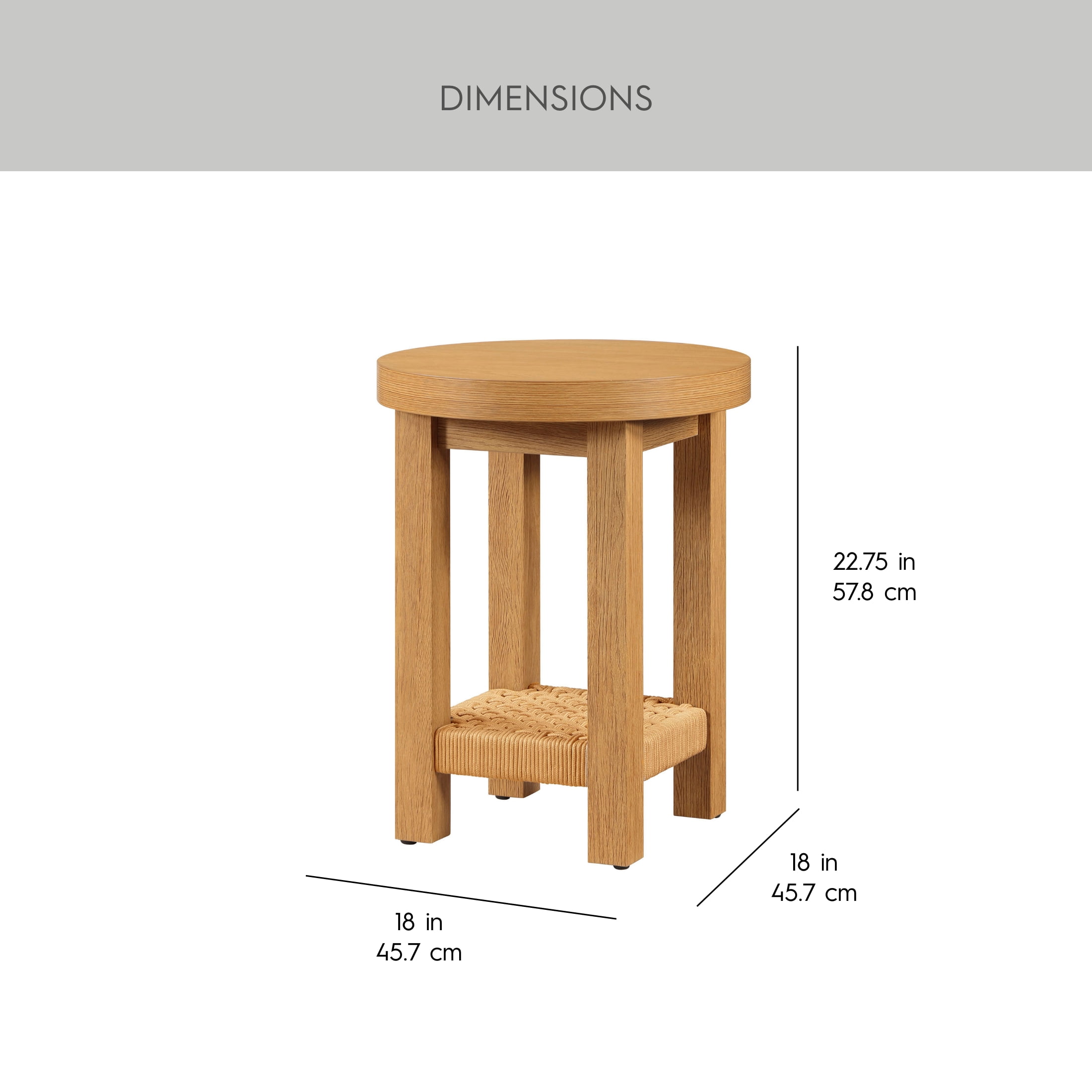 Elevate your space with the Vista Woven End Table by Better Homes & Gardens. This versatile wood end table is perfect for living rooms, lounge areas, or cozy nooks. The 18-inch round tabletop offers ample space for your morning coffee or a stylish decor piece. Crafted with durable wood materials in a light honey finish, this small end table combines warmth and sturdiness, creating a piece you’ll cherish for years. The highlight of this piece is its handcrafted woven lower shelf, which provides both artisanal charm and extra storage for blankets or magazines. Coordinating effortlessly with other coastal, farmhouse, or transitional decor, this woven end table embodies style and functionality.