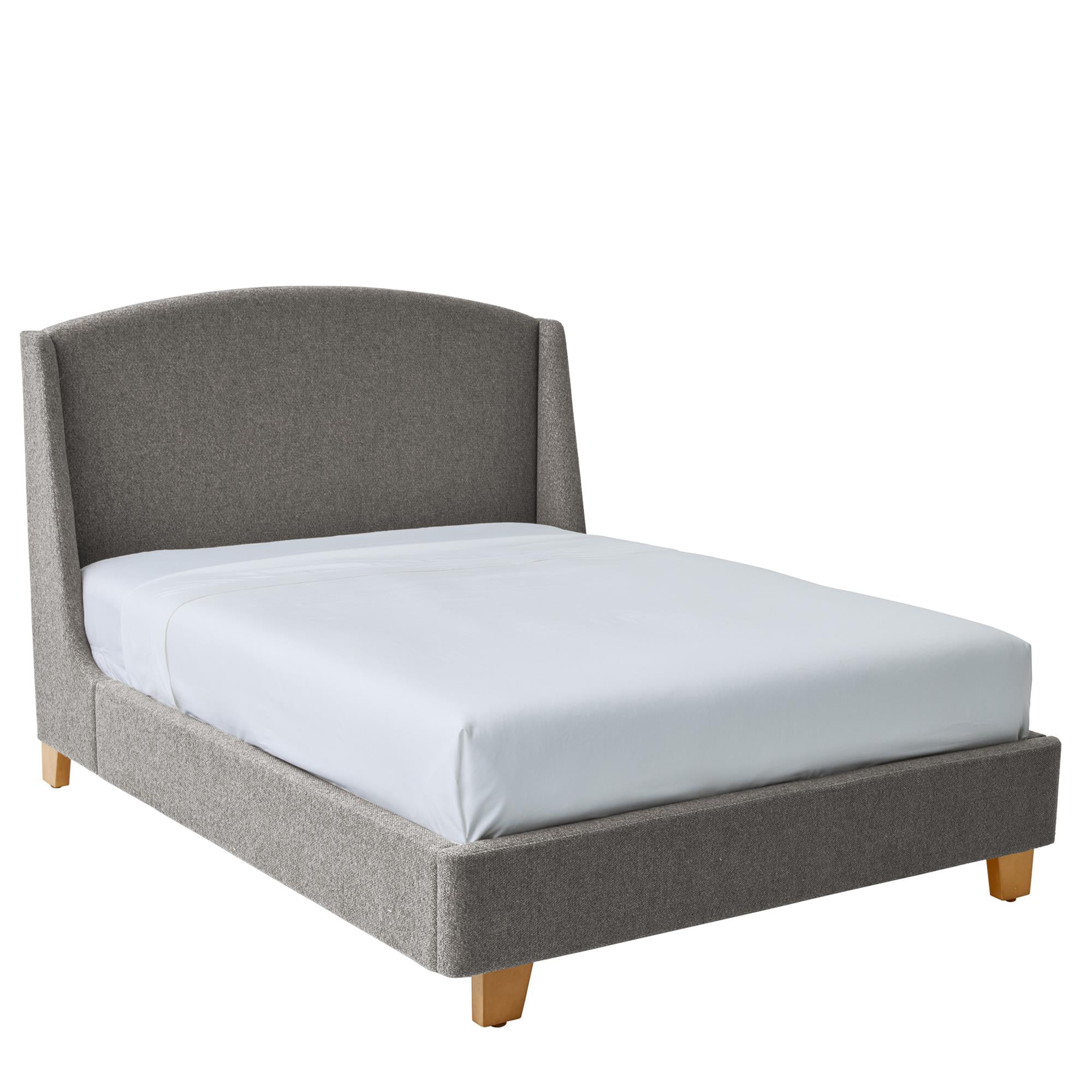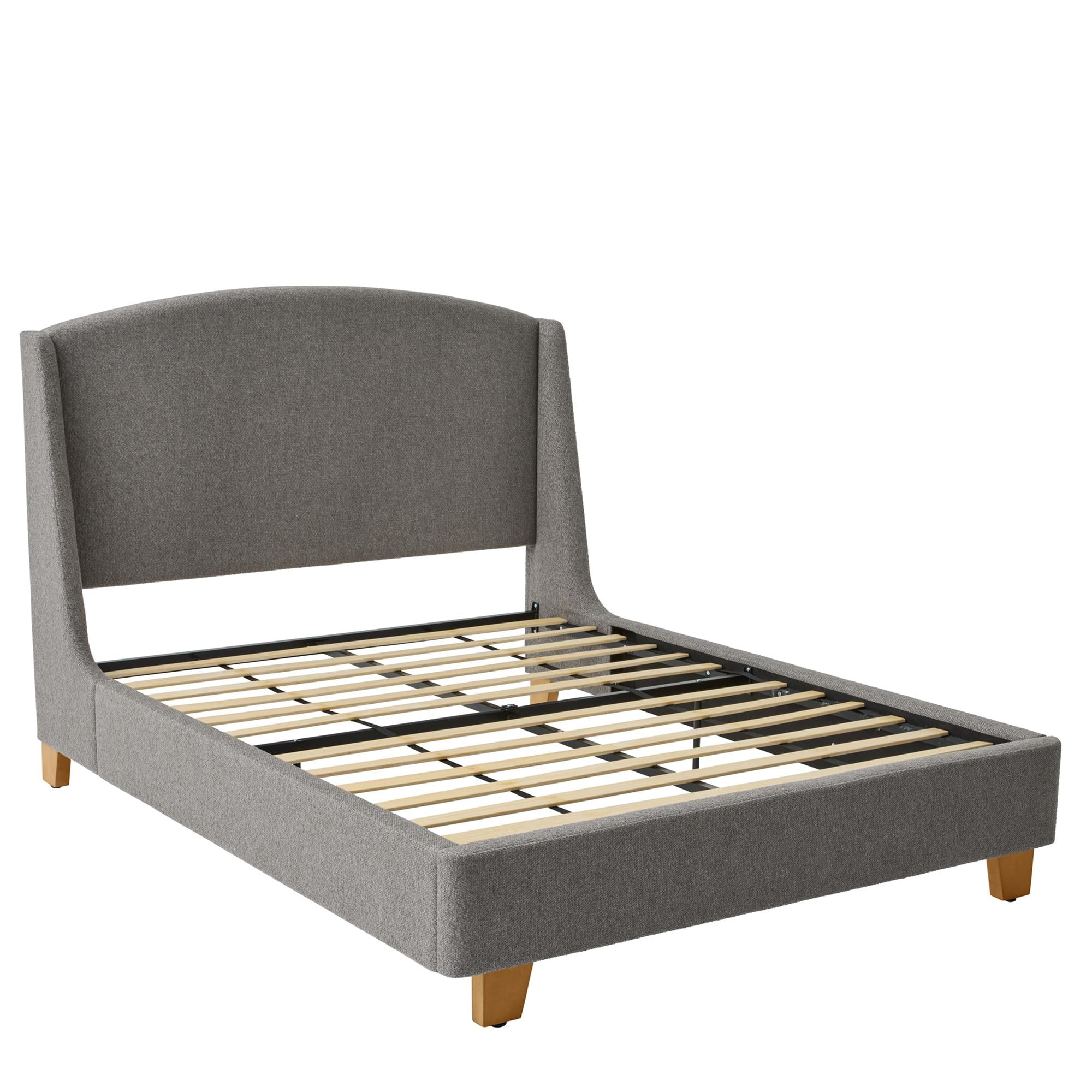 Better Homes & Gardens Windsor Platform Bed with Wingback Headboard, Queen, Gray Boucle Materials & Construction: Textured boucle fabric upholstery | Wood and metal frame Configuration & Dimensions: Bed: 65″”W x 86″”D x 52.5″”H Comfort Features: Plush cushioning on headboard, footboard and side panels | Rounded corners for safety Assembly: Easy setup with rolled plywood slat system | Includes handy ratchet tool | 2-person assembly recommended Warranty: 1-year warranty Weight Capacity: 1,000lbs Maintenance: Gently dab with clean, dry, absorbent cloth when spills occur | Avoid rubbing Customer Service: Contact us at