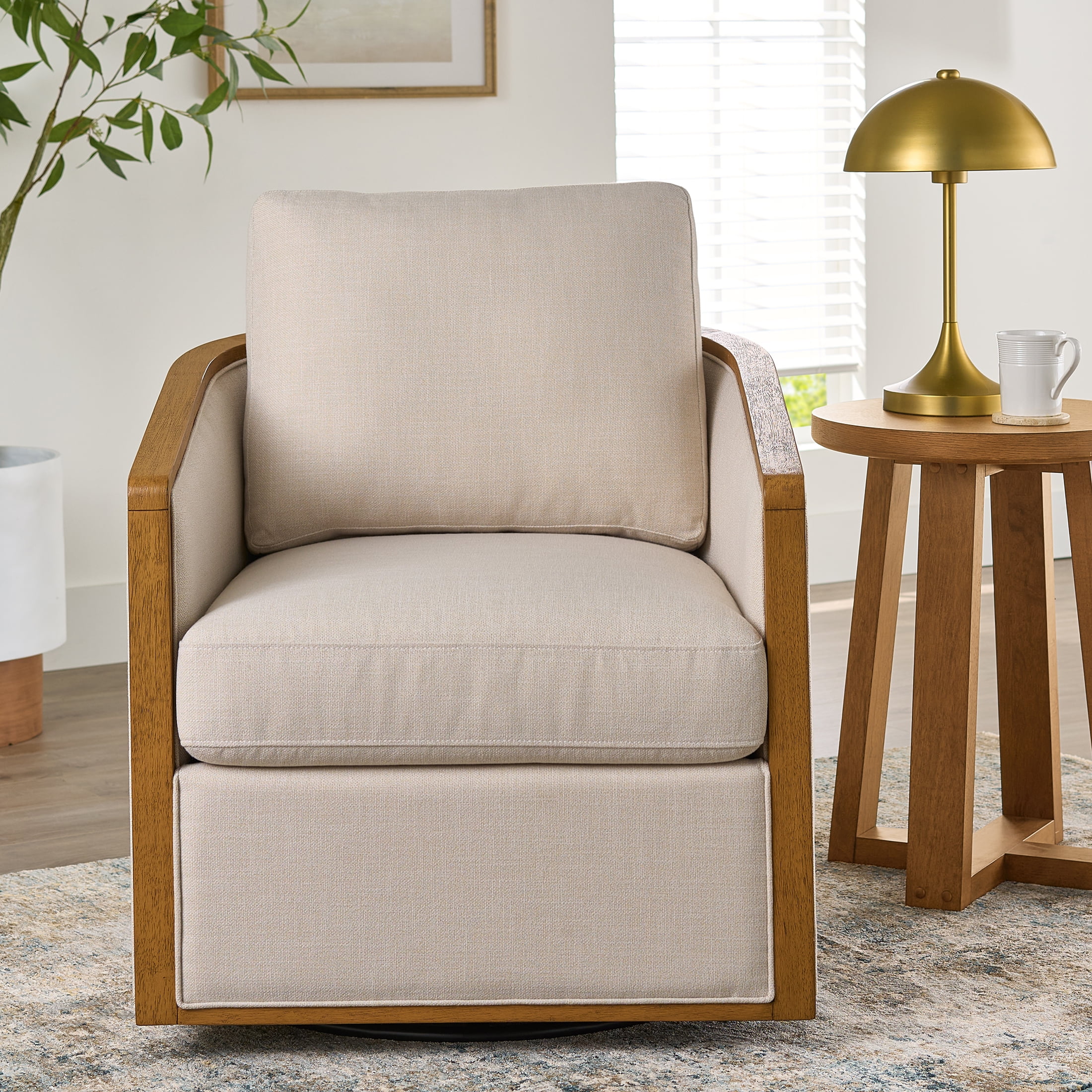Add both comfort and style to your living space with the Better Homes & Gardens Windsor Swivel Accent Chair. Featuring a 360-degree swivel, this chair lets you easily turn to face the action or relax in your favorite position. The durable fabric upholstery not only feels great but is built to last, perfect for busy homes. Its farmhouse-inspired barrel design, plush pillow back, and squared armrests bring a cozy, laid-back vibe to any room. With a sturdy wood construction and available in two timeless colors—Gray and Cream—this chair combines style, durability, and function for the perfect addition to your living room, lounge, or reading nook.