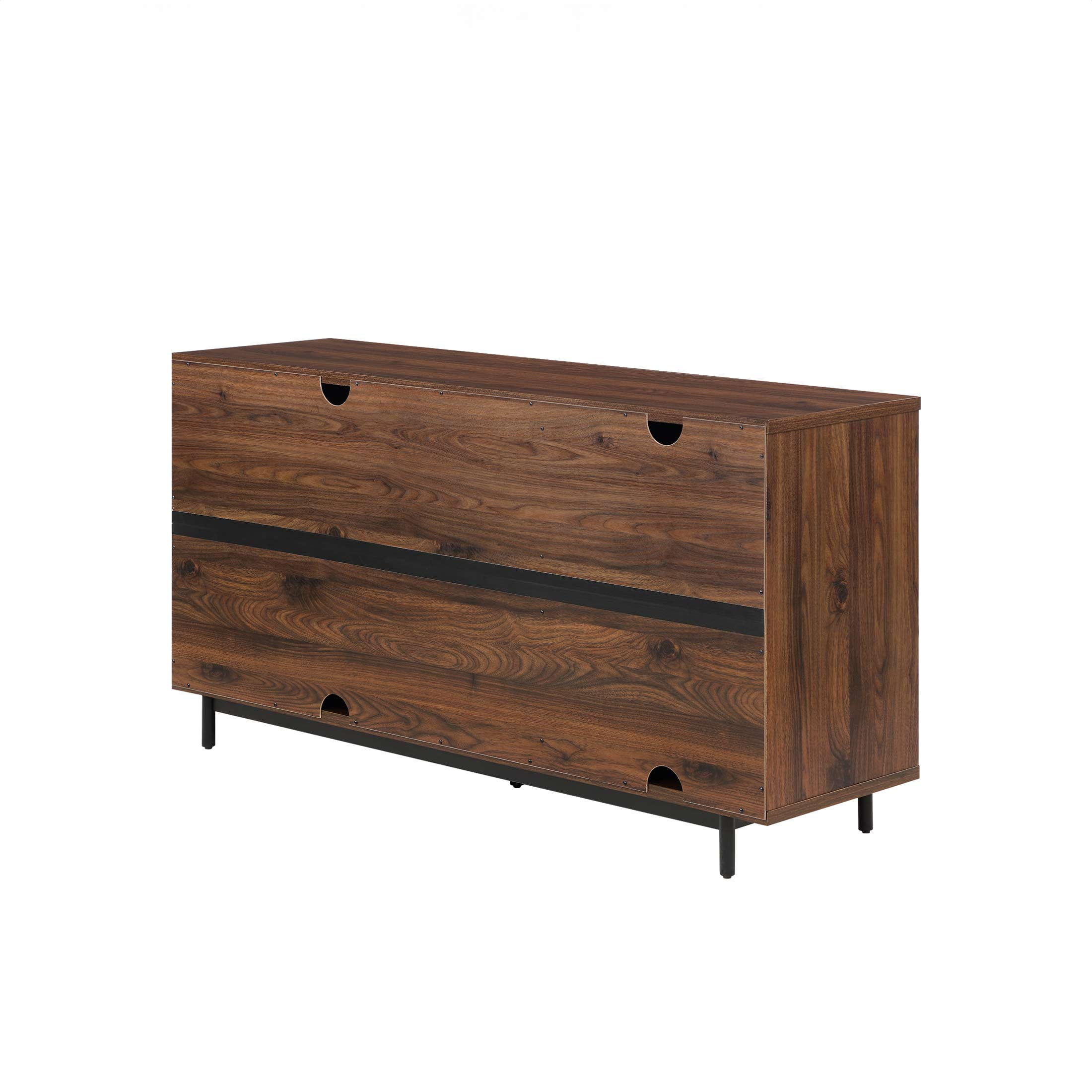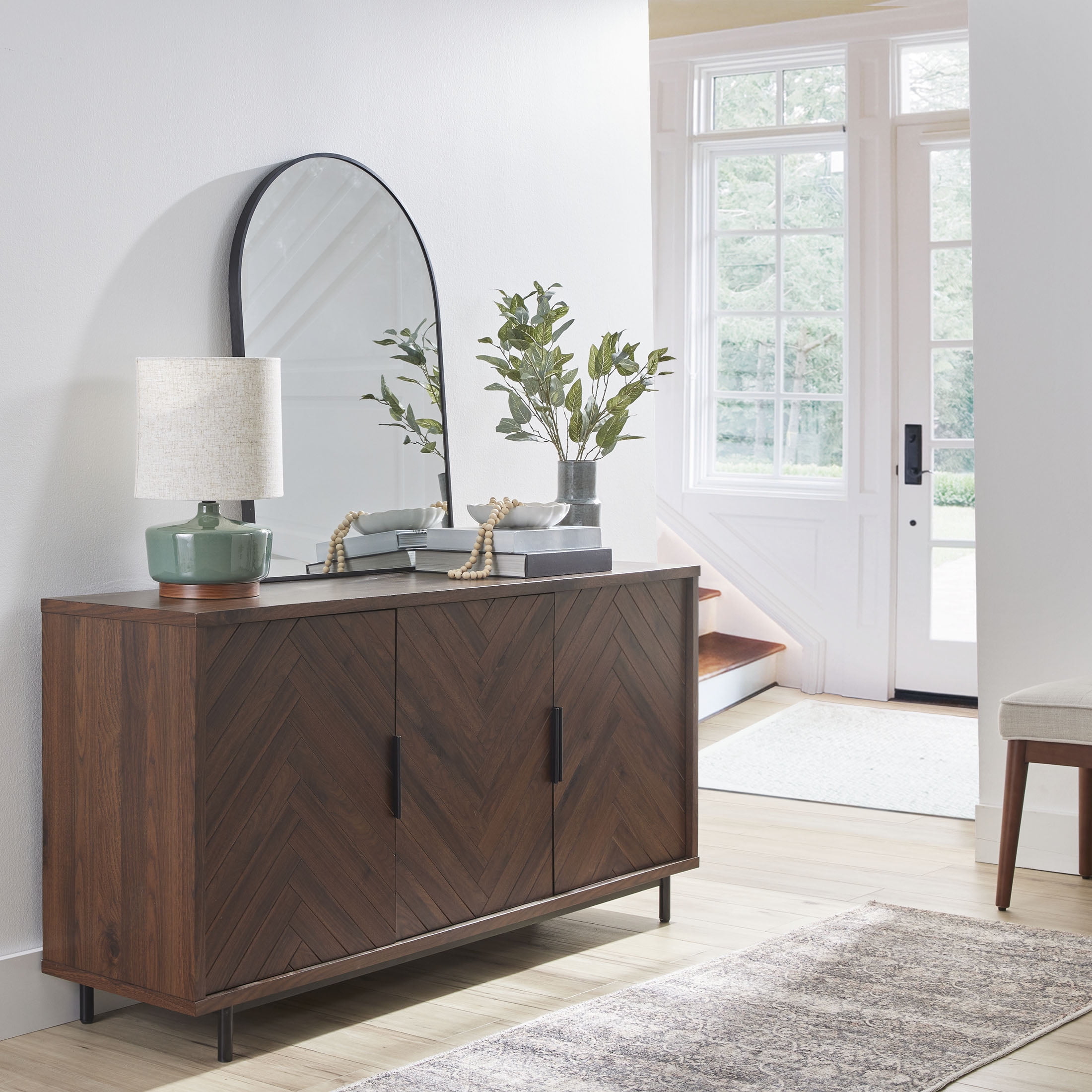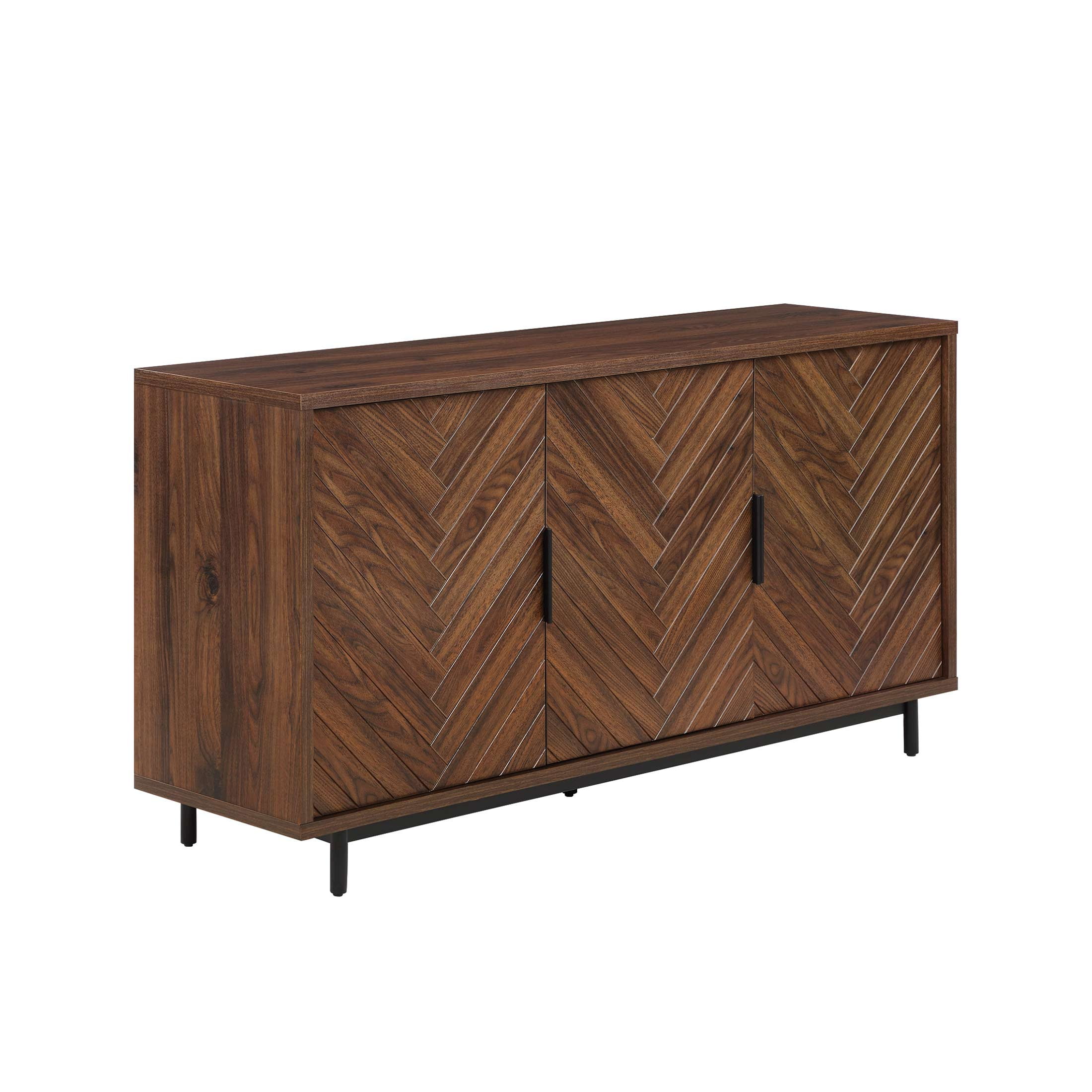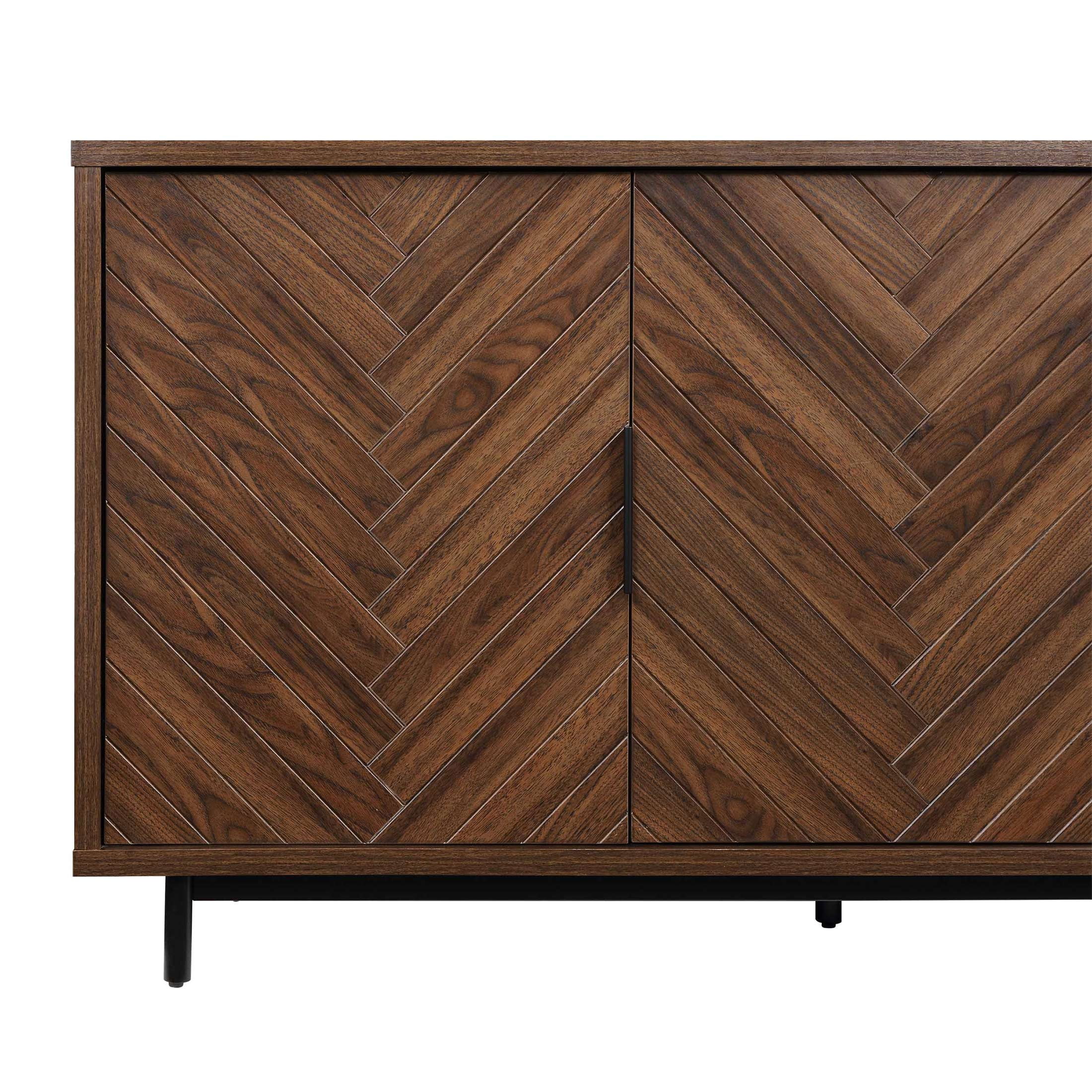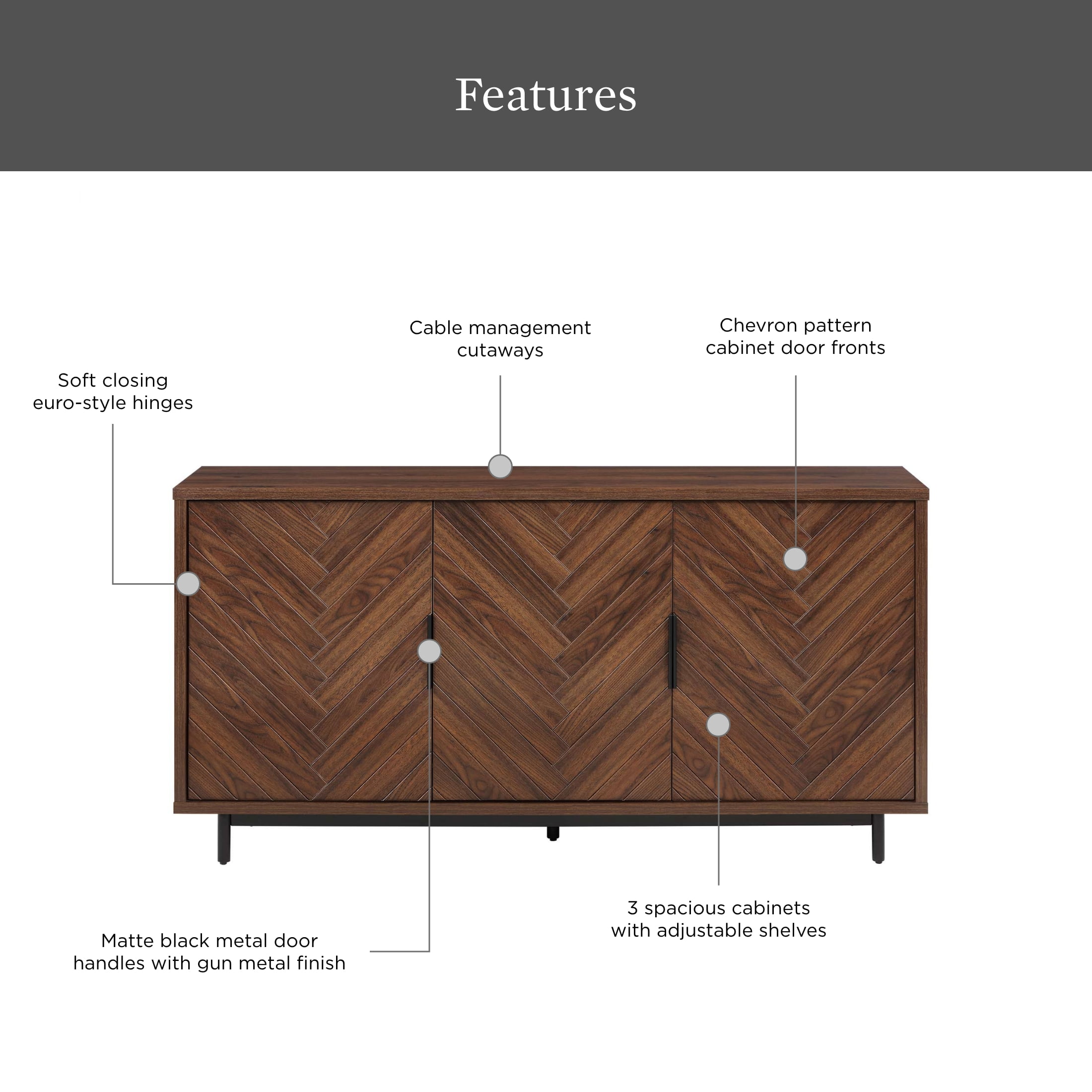Fits most flat panel TVs up to 70 inch 2 spacious cabinets with adjustable shelves Herringbone pattern cabinet door fronts Matte black metal door handles with gun metal finish Soft closing euro-style hinges Multi-purpose storage solution can be used as a media console, accent cabinet or dining buffet Cable management cutaways Assembly required Dimensions: 59.5 in W x 15.9 in D x 30.25 in H (151.1 cm x 40.4 cm x 76.8 cm) Packaging Dimensions: 64.625 in x 22.75 in x 9 in Packaging Weight: 134 lb (64.8 kg) Model# BHF336158813003