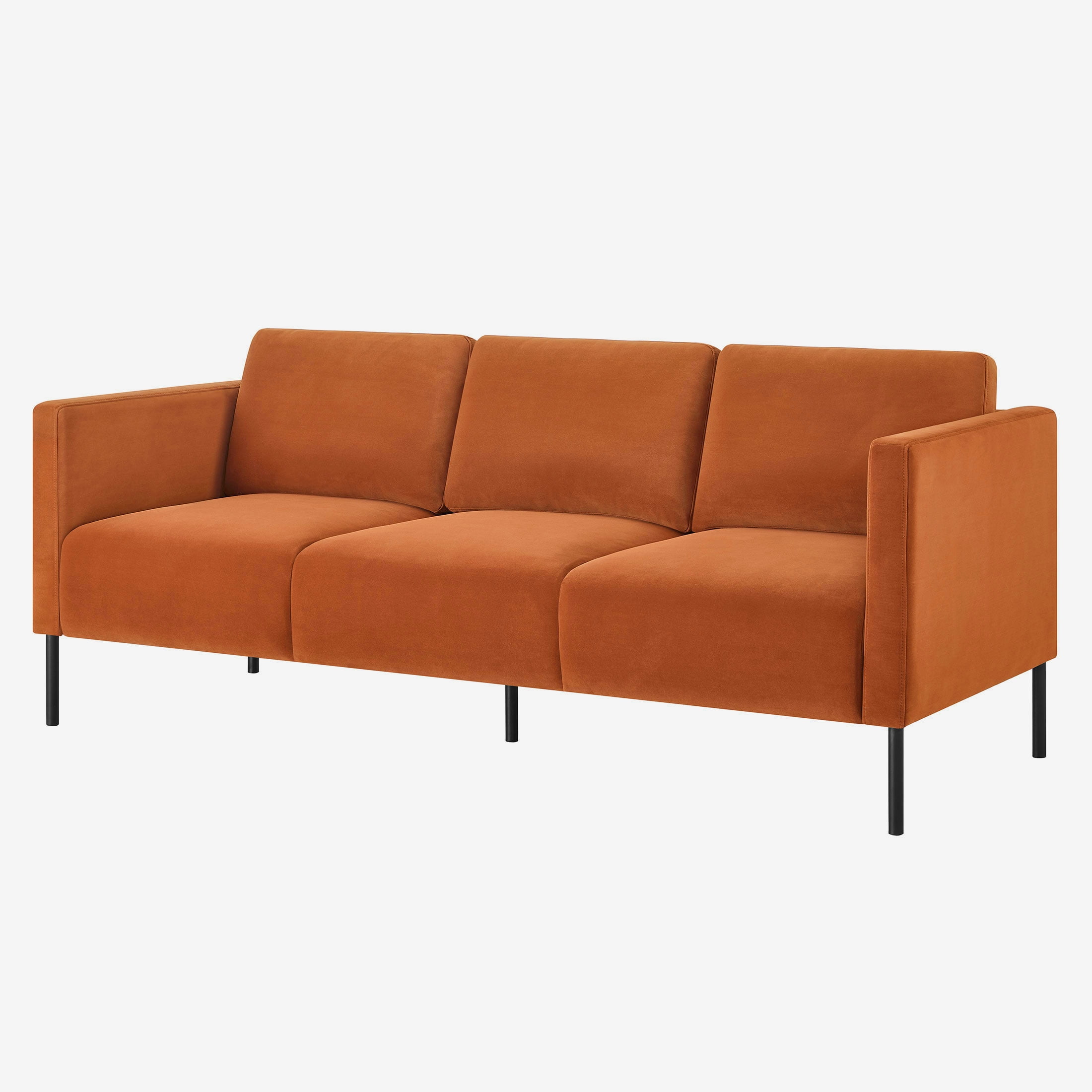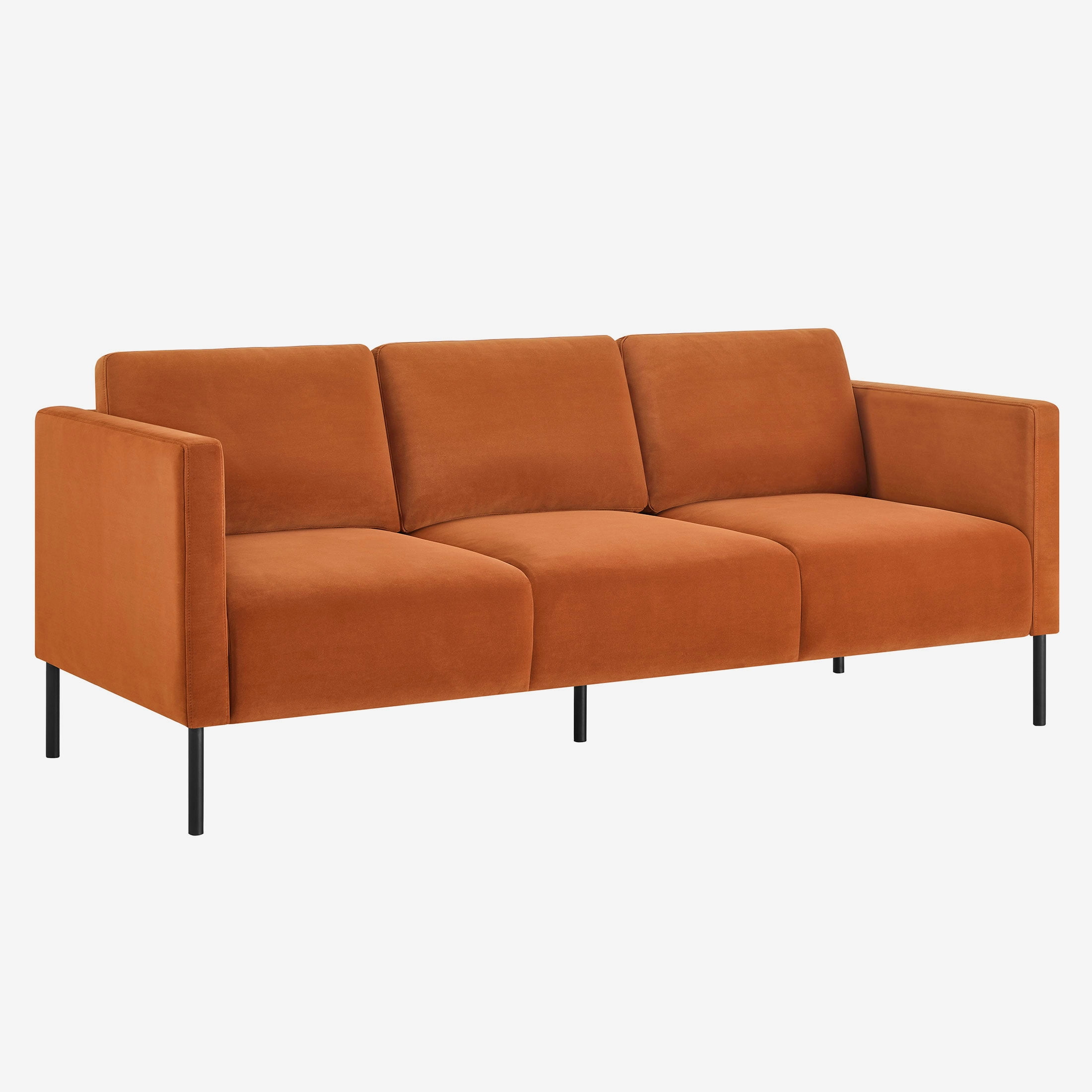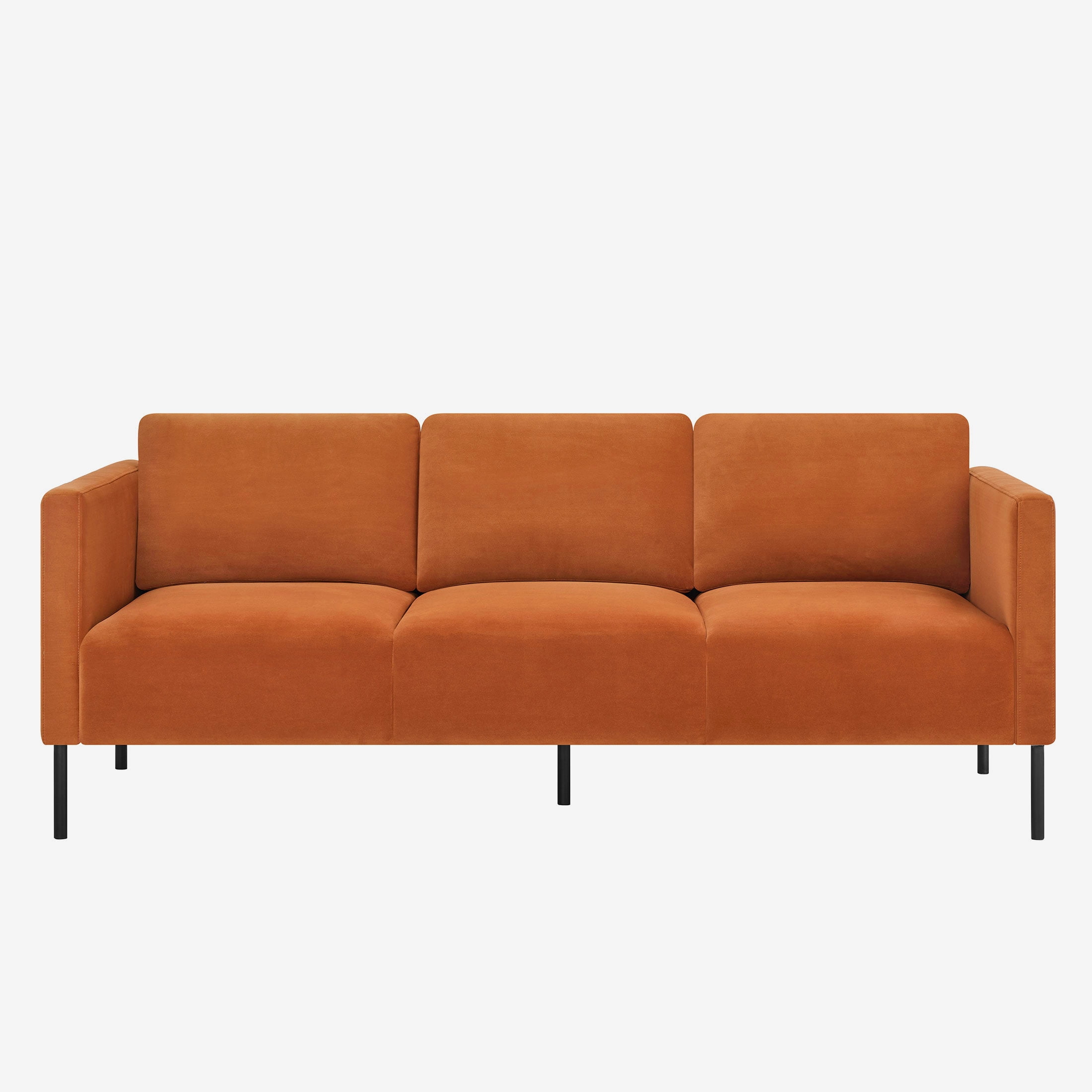 Luxurious velvet fabric for unparalleled softness and comfort Generously padded seats and chair back cushions for maximum relaxation Removable back cushions allow for easy cleaning and customization of support Solid wood frame construction ensures durability and stability Contemporary design with squared armrests and black metal legs adds a touch of sophistication to any space Available in Copper Pipe, Sea Turtle, or Blue Cove Easy assembly with no additional tools required Product Dimensions: 78 in W x 31.5 in D x 32 in H (198.1 cm x 80 cm x 81.3 cm) Packaging Dimensions: 72 in x 28 in x 14.75 in Model# BH2531646385001, BH2531646369001, BH2531646315001