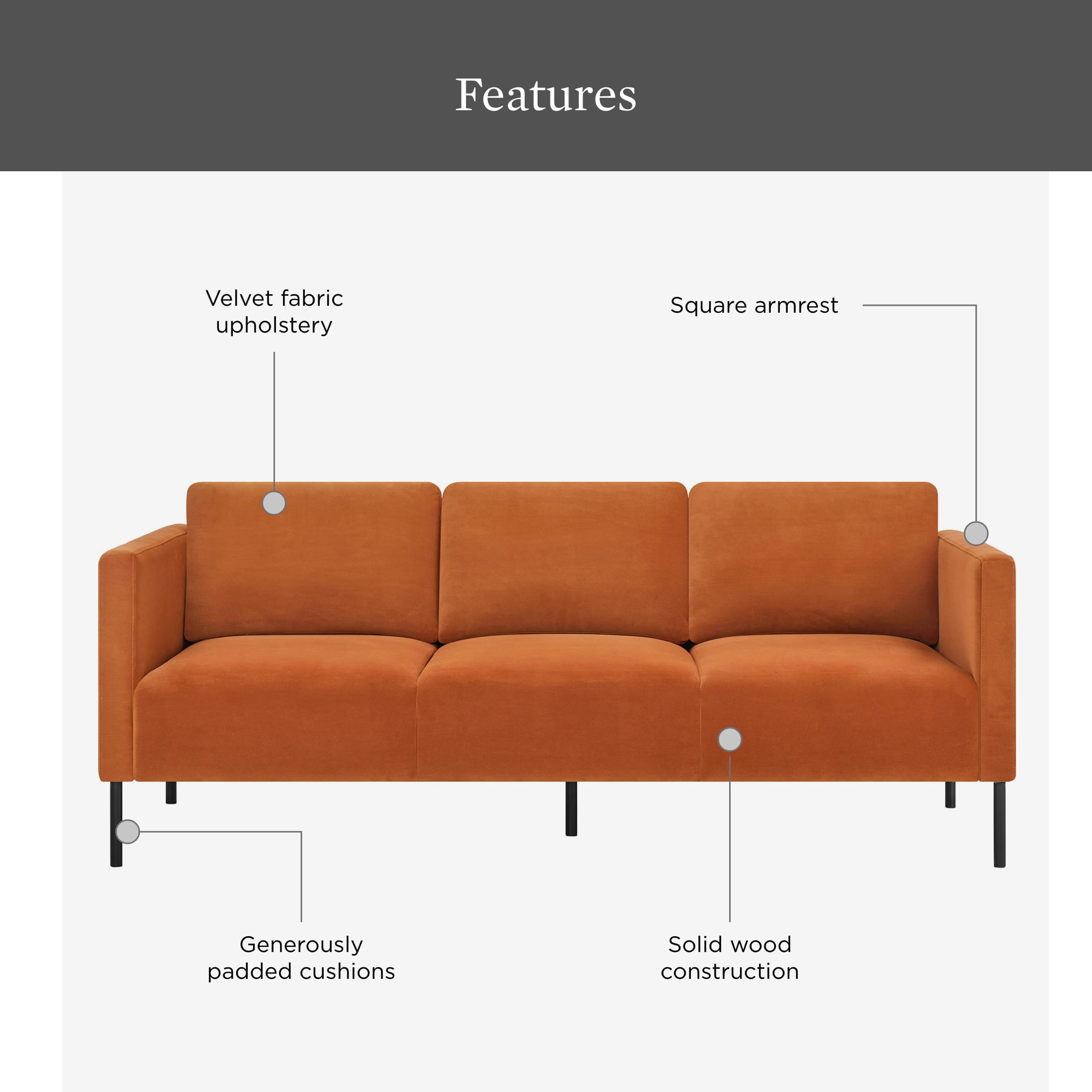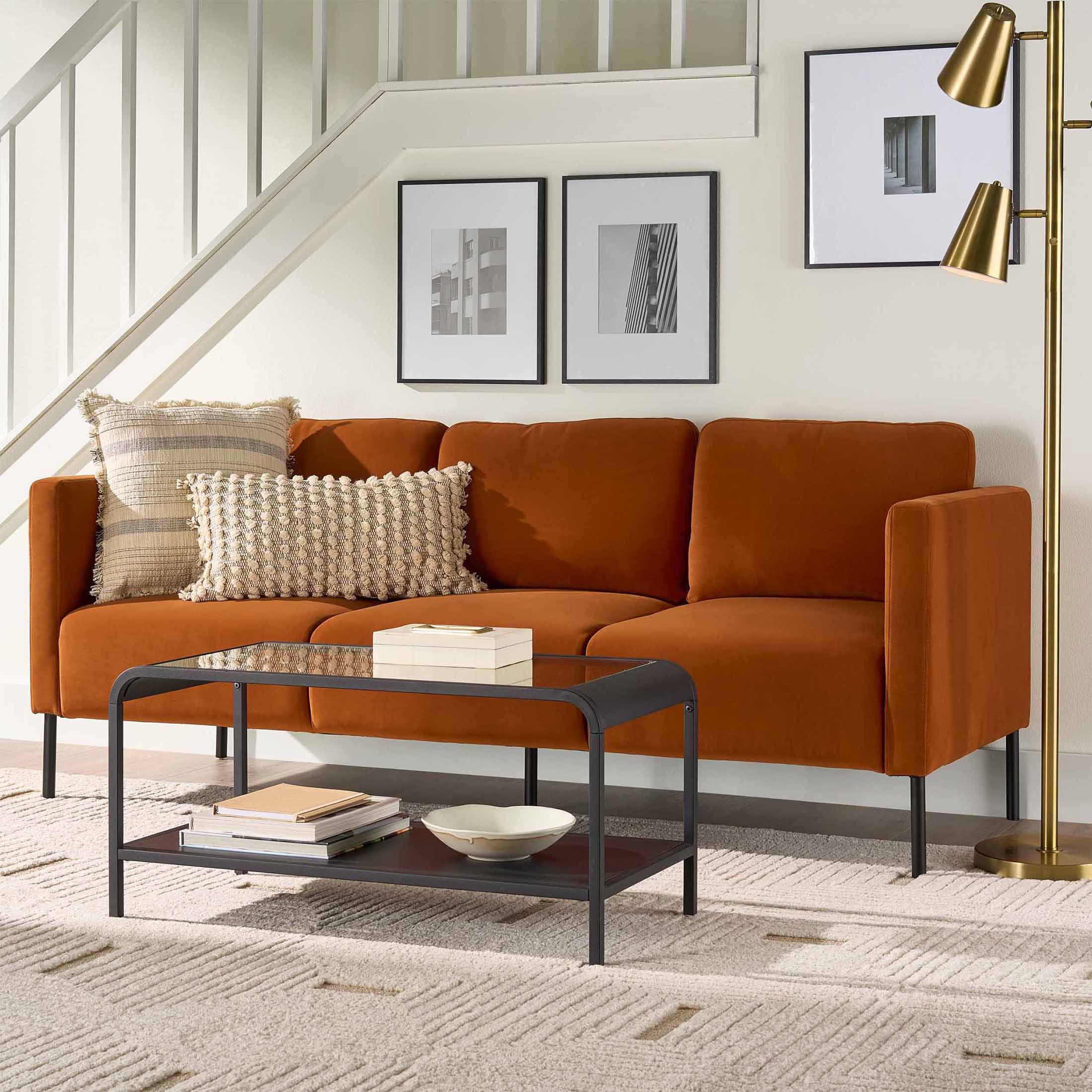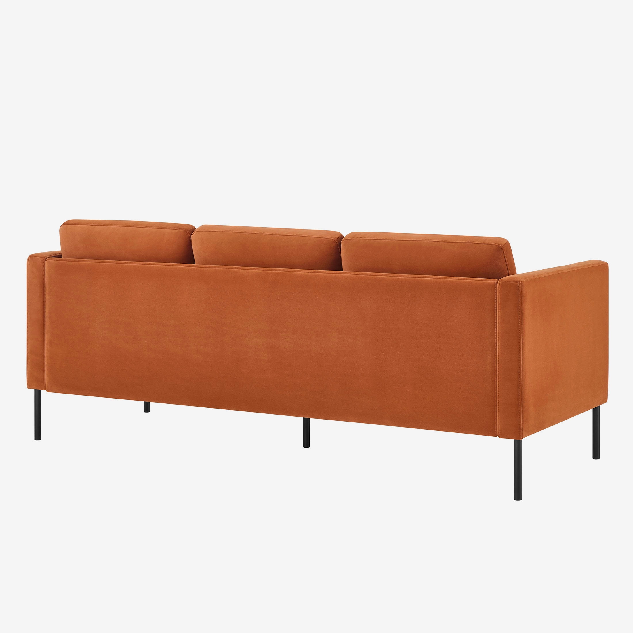 Luxurious velvet fabric for unparalleled softness and comfort Generously padded seats and chair back cushions for maximum relaxation Removable back cushions allow for easy cleaning and customization of support Solid wood frame construction ensures durability and stability Contemporary design with squared armrests and black metal legs adds a touch of sophistication to any space Available in Copper Pipe, Sea Turtle, or Blue Cove Easy assembly with no additional tools required Product Dimensions: 78 in W x 31.5 in D x 32 in H (198.1 cm x 80 cm x 81.3 cm) Packaging Dimensions: 72 in x 28 in x 14.75 in Model# BH2531646385001, BH2531646369001, BH2531646315001