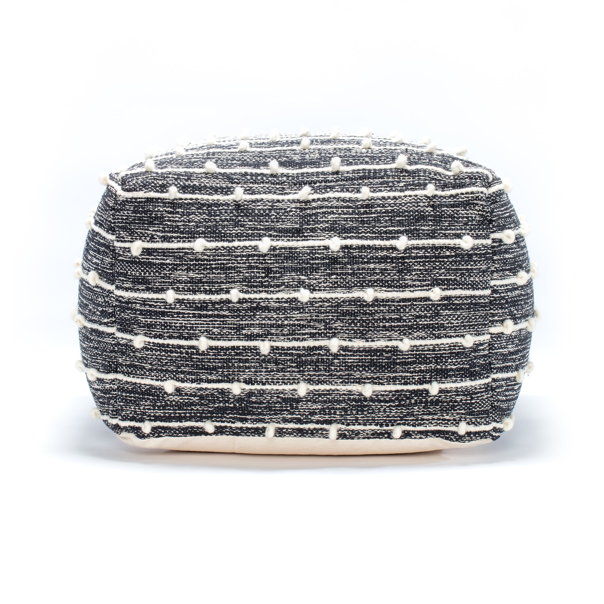Cotton and polyester upholstery expertly hand crafted by skilled weavers, finished and filled in the United States Filled with a premium, recyclable, highly resilient expanded polypropylene bead that holds its shape much longer than traditional poufs Easy and durable compliment to any seating arrangement Beautiful neutral color and design fits in with almost any décor Large pouf with a supportive, yet comfortable sit
